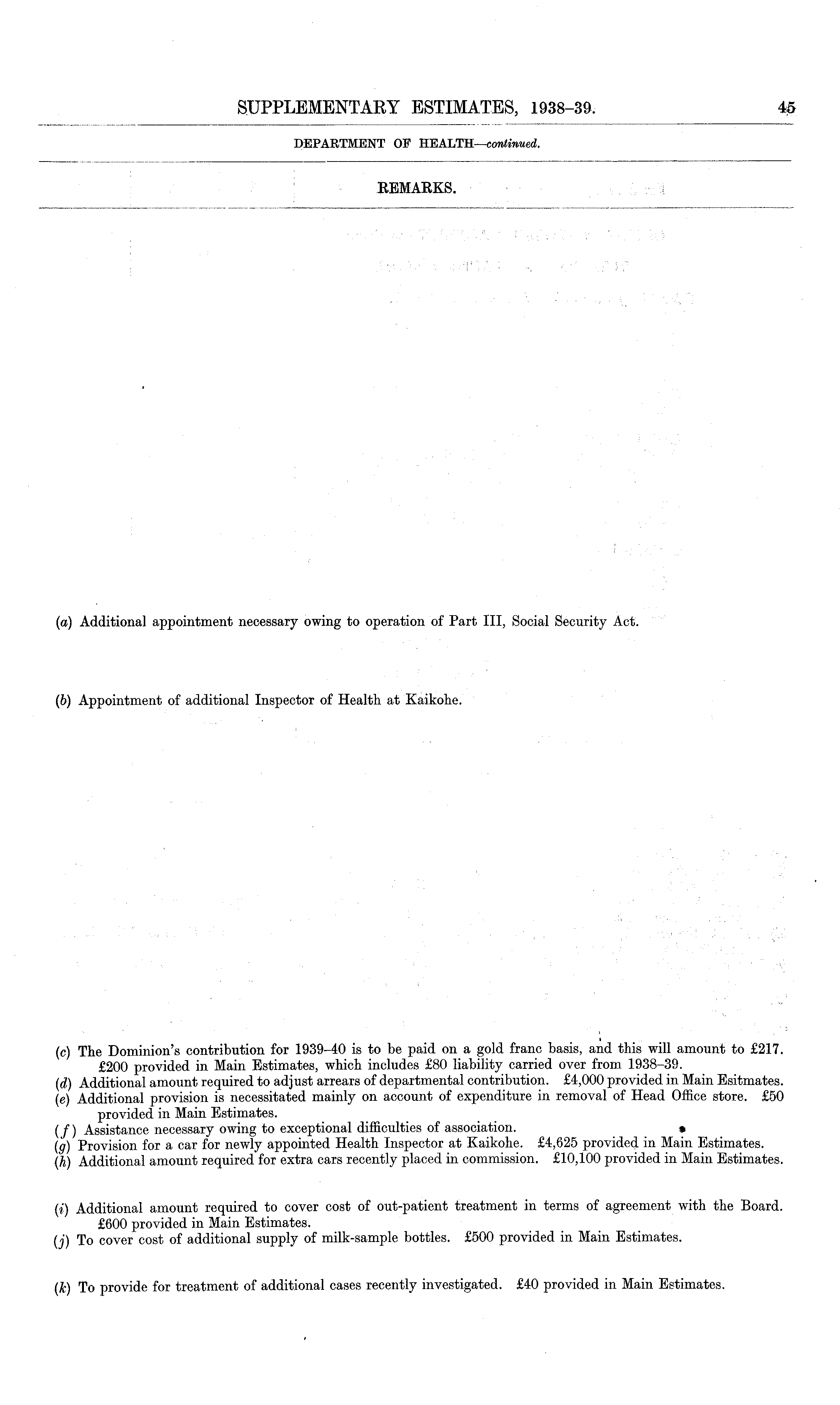 REMARKS. (a) Additional appointment necessary owing to operation of Part 111, Social Security Act. (b) Appointment of additional Inspector of Health at Kaikohe. (c) The Dominion's contribution for 1939-40 is to be paid on a gold franc basis, and this will amount to £217. £200 provided in Main Estimates, which includes £80 liability carried over from 1938-39. (d) Additional amount required to adjust arrears of departmental contribution. £4,000 provided in Main Esitmates. (e) Additional provision is necessitated mainly on account of expenditure in removal of Head Office store. £50 provided in Main Estimates. ( f) Assistance necessary owing to exceptional difficulties of association. (g) Provision for a car for newly appointed Health Inspector at Kaikohe. £4,625 provided in Main Estimates. (h) Additional amount required for extra cars recently placed in commission. £10,100 provided in Main Estimates. (?) Additional amount required to cover cost of out-patient treatment in terms of agreement with the Board. £600 provided in Main Estimates. (j) To cover cost of additional supply of milk-sample bottles. £500 provided in Main Estimates. (k) To provide for treatment of additional cases recently investigated. £40 provided in Main Estimates.