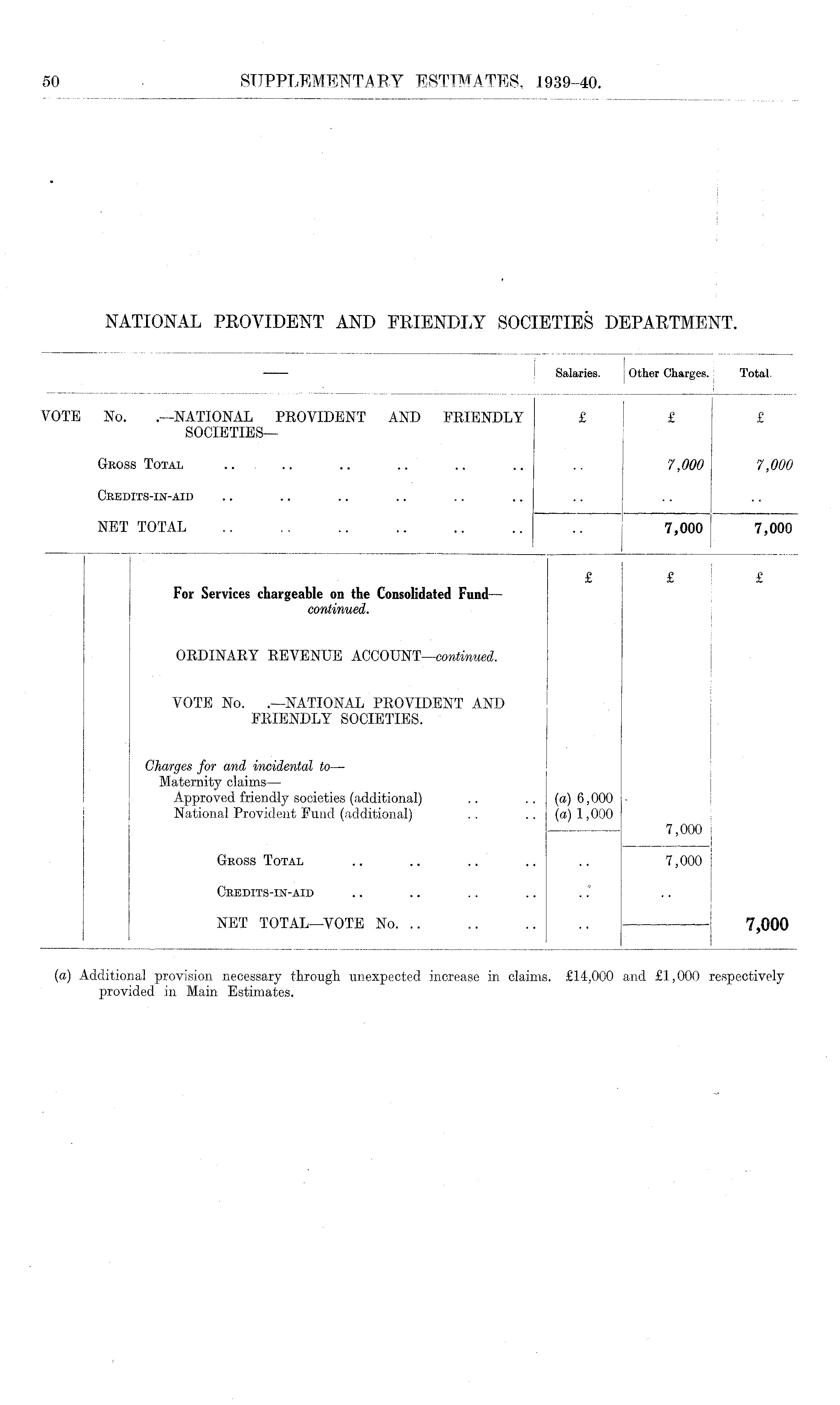 Salaries. Other Charges. Total. VOTE No. .—NATIONAL PROVIDENT AND FRIENDLY £ £ £ societiesGross Total .. .. .. .. .. .. .. 7,000 7,000 Credits-in-aid NET TOTAL .. .. .. .. .. .. 7,000 7,000 £ £ £ For Services chargeable on the Consolidated Fund — continued. ORDINARY REVENUE ACCOUNT—continued. VOTE No. .—NATIONAL PROVIDENT AND FRIENDLY SOCIETIES. i Charges for and incidental to — Maternity claims — Approved friendly societies (additional) .. .. (a) 6,000 National Provident Fund (additional) .. .. (a) 1,000 7,000 | Gross Total .. .. .. .. .. 7,000 Credits-in-aid NET TOTAL—VOTE No 7,000