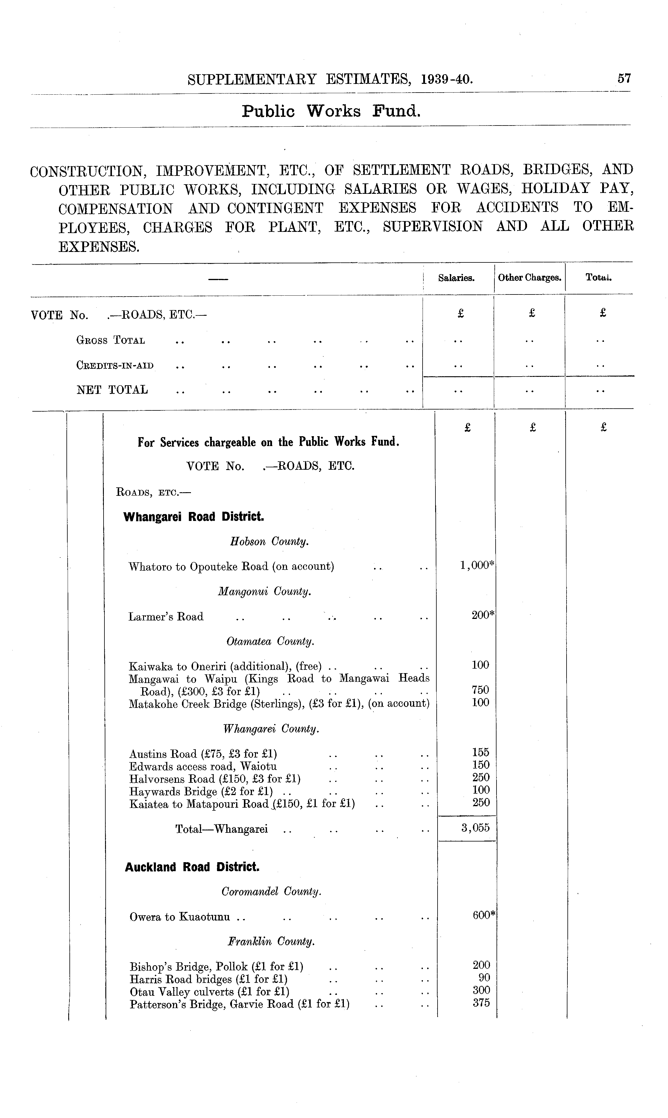 : Salaries. Other Charges. Total. VOTE No. .—ROADS, ETC.— £ £ £ Gross Total Credits-in-aid NET TOTAL £ £ £ For Services chargeable 011 the Public Works Fund. VOTE No. .—ROADS, ETC. Roads, etc. — Whangarei Road District. Hobson County. Whatoro to Opouteke Road (on account) .. .. 1,000* Mangonui County. Larmer's Road .. .. .. .. • • 200* Otamatea County. Kaiwaka to Oneriri (additional), (free) .. .. .. 100 Mangawai to Waipu (Kings Road to Mangawai Heads Road), (£300, £3 for £1) .. 750 Matakohe Creek Bridge (Sterlings), (£3 for £1), (on account) 100 Whangarei County. Austins Road (£75, £3 for £1) .. .. . • 155 Edwards access road, Waiotu . . .. .. 150 Halvorsens Road (£150, £3 for £1) .. .. • ■ 250 Hay wards Bridge (£2 for £1) .. .. .. . • 100 Kaiatea to Matapouri Road (£150, £1 for £1) .. .. 250 Total —Whangarei .. .. .. • ■ 3,055 Auckland Road District. Coromandel County. Owera to Kuaotunu .. .. .. .. • ■ 600* Franklin County. Bishop's Bridge, Pollok (£1 for £1) .. .. .. 200 Harris Road bridges (£1 for £1) .. . • • • 90 Otau Valley culverts (£1 for £1) .. .. • ■ 300 Patterson's Bridge, Garvie Road (£1 for £1) . . .. 375