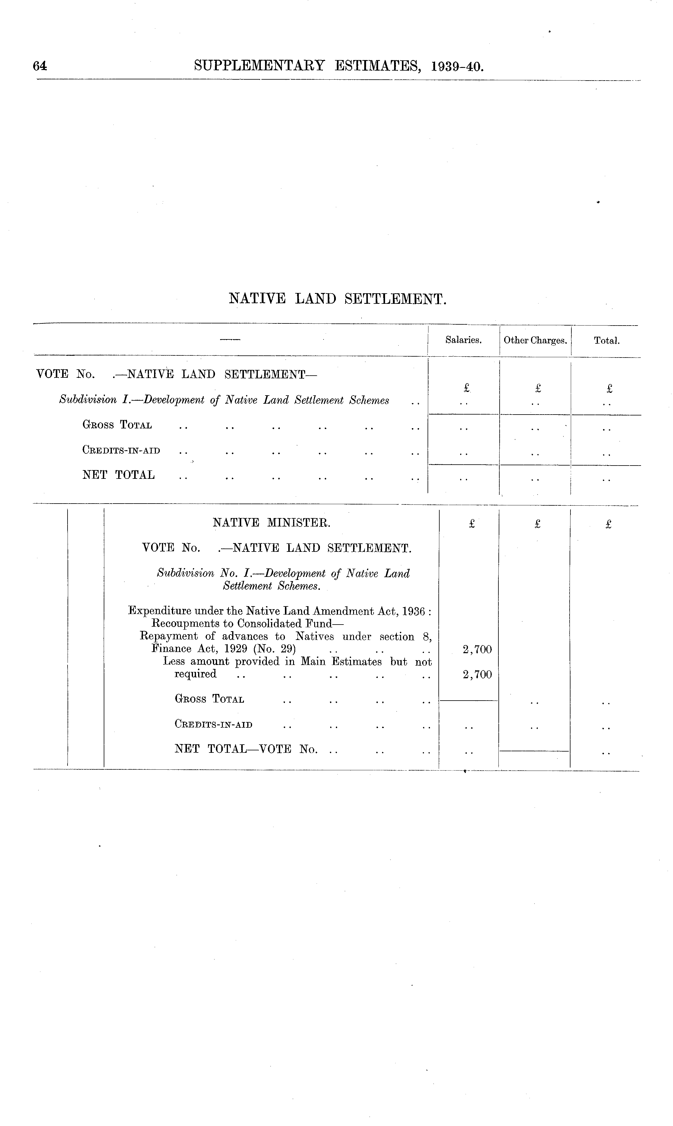 I I j Salaries. Other Charges. | Total. . ' J VOTE No. .—NATIVE LAND SETTLEMENT— £ £ £ Subdivision I. —Development of Native Land Settlement Schemes Gross Total Credits-in-aid » NET TOTAL .. J NATIVE MINISTER. £ £ £ VOTE No. .—NATIVE LAND SETTLEMENT. Subdivision No. I.—Development of Native Land Settlement Schemes. Expenditure under the Native Land Amendment Act, 1936 : Recoupments to Consolidated Fund — Repayment of advances to Natives under section 8, Finance Act, 1929 (No. 29) .. .. .. 2,700 Less amount provided in Main Estimates but not required .. .. .. .. .. 2,700 Gross Total .. .. .. .. Credits-in-a it) NET TOTAL—VOTE No
