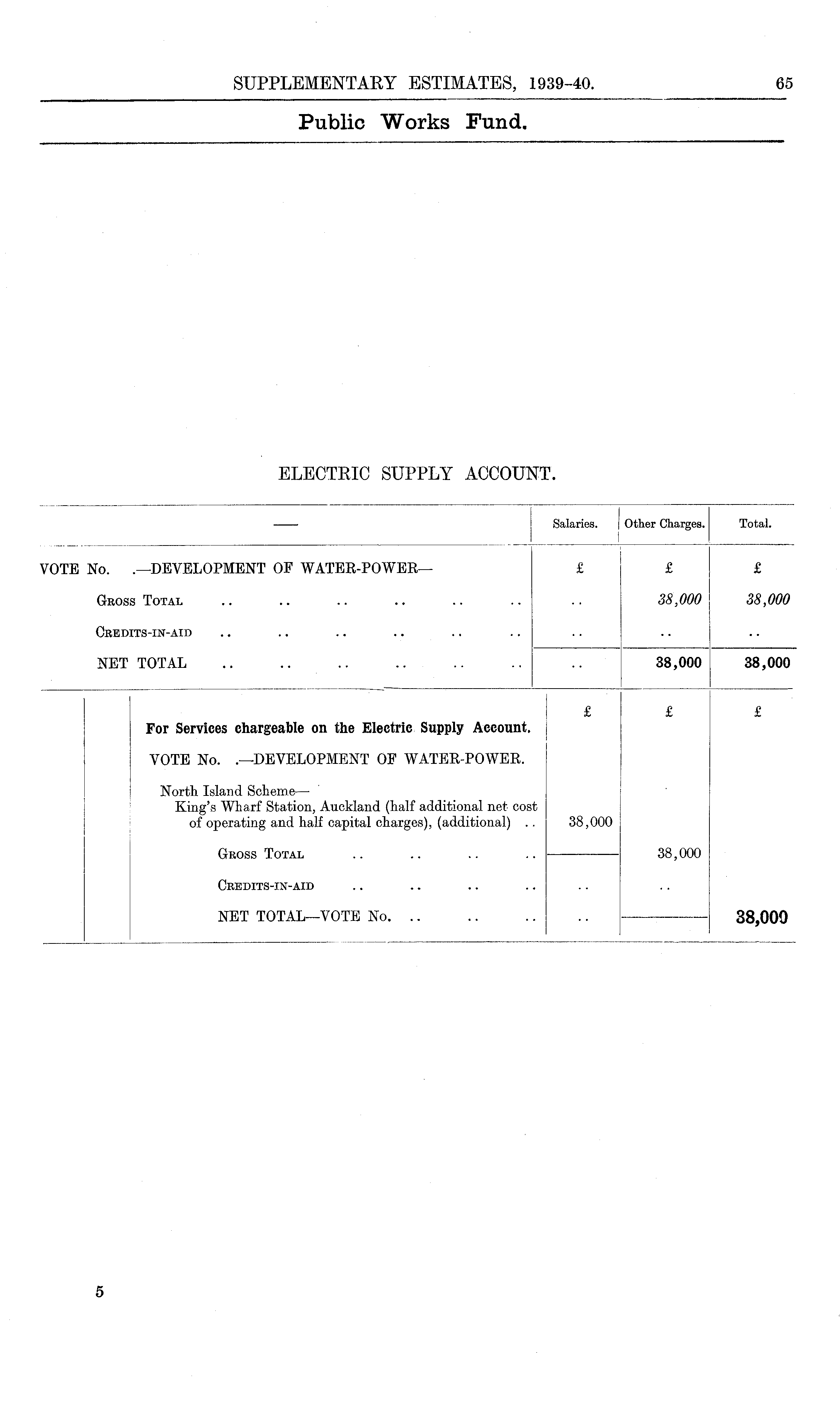 Salaries. | Other Charges. Total. I I VOTE No. .—DEVELOPMENT OF WATER-POWER— £ £ £ Gross Total .. .. .. .. .. .. .. 38,000 38,000 Credits-in-aid NET TOTAL .. .. .. .. .. .. 38,000 38,000 £ £ £ For Services chargeable on the Electric Supply Account. VOTE No. .—DEVELOPMENT OF WATER-POWER. North Island Scheme —• King's Wharf Station, Auckland (half additional net cost of operating and half capital charges), (additional) .. 38,000 Gross Total .. .. .. .. 38,000 Credits-in-aid NET TOTAL—VOTE No 38,009 5
