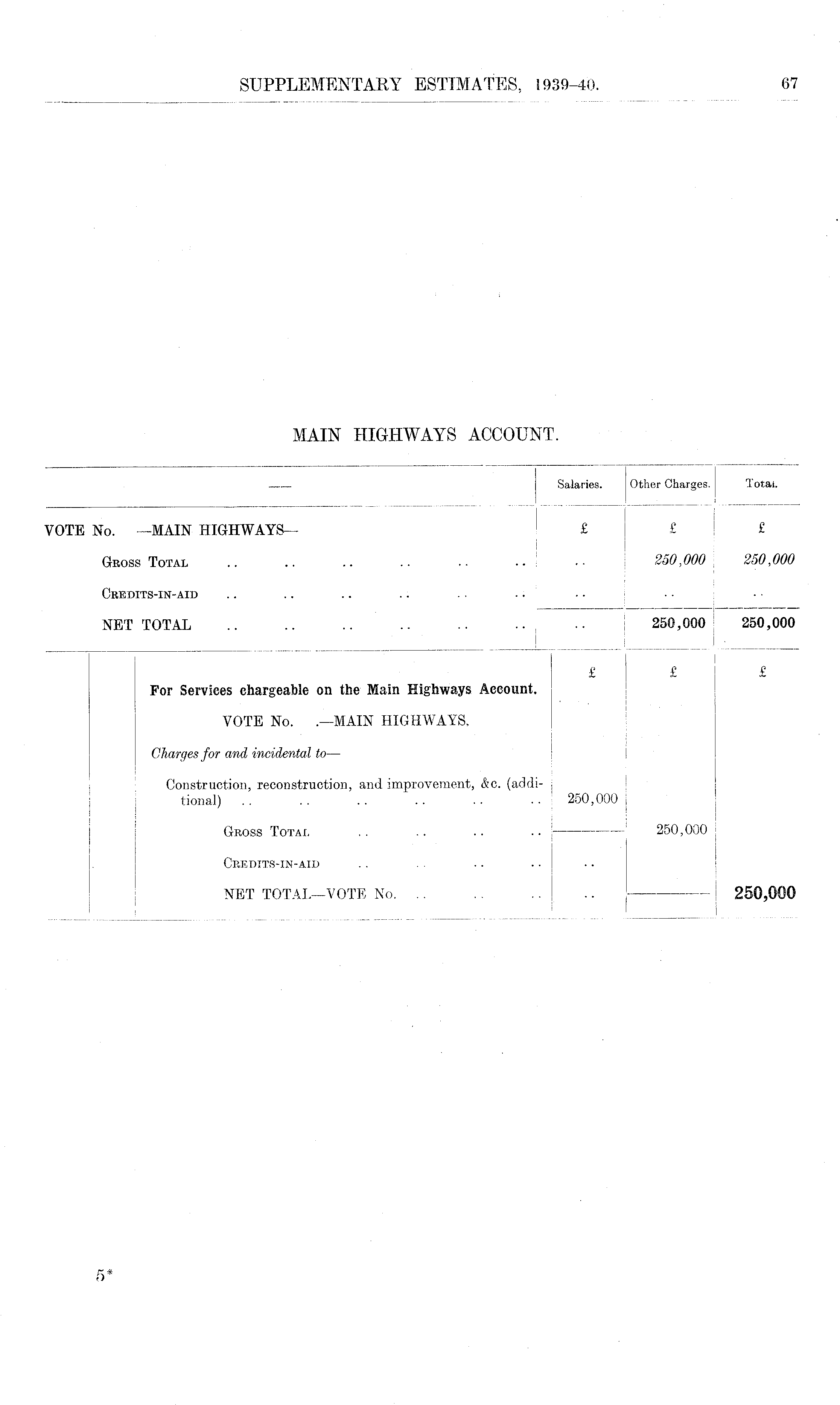 Salaries. Other Charges. I Total. VOTE No. —MAIN HIGHWAYS— £ £ £ Gross Total .. .. .. .. .. •• 250,000 250,000 Credits-in-aid NET TOTAL .. .. .. .. .. 250,000 250,000 £ | £ £ For Services chargeable on the Main Highways Account. VOTE No. .—MAIN HIGHWAYS. Charges for and incidental to —• Construction, reconstruction, and improvement, &c. (addi- j tional) .. .. .. . • • ■ • • 250,000 GROSS Total .. .. .. .. — 250,000 Credits-in-aid NET TOTAL—VOTE No. .. .. .. .. 250,000 !