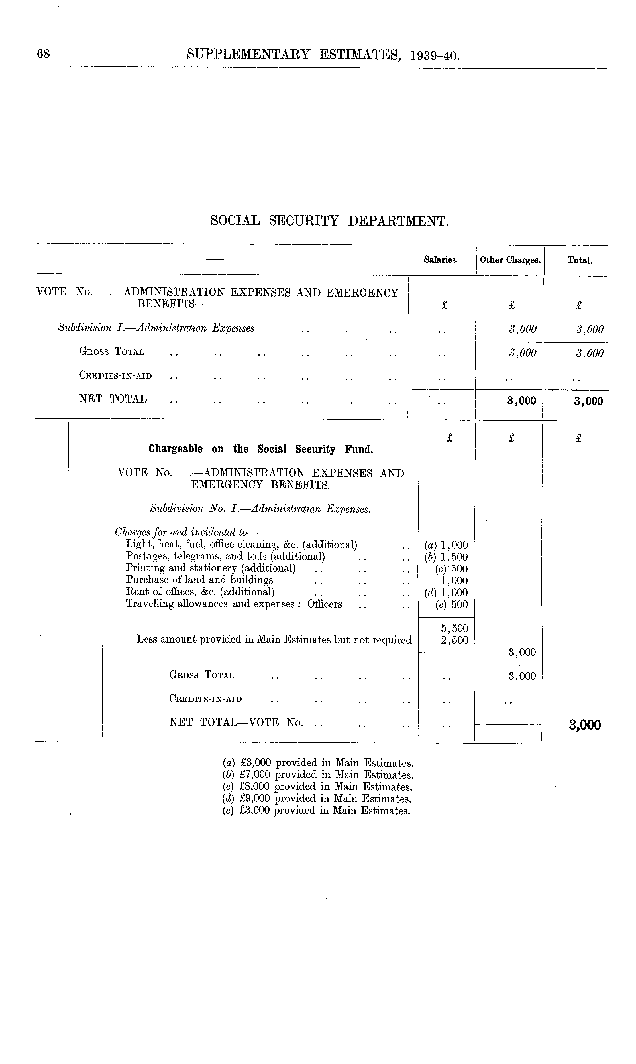 Salaries Other Charges. Total, VOTE No. .—ADMINISTRATION EXPENSES AND EMERGENCY BENEFITS— £ £ £ Subdivision I.—Administration Expenses .. .. .. .. 3,000 3,000 Gross Total .. .. .. .. .. .. .. 3,000 3,000 Credits-in-aid NET TOTAL .. .. .. 3,000 3,000 £ £ £ Chargeable on the Social Security Fund. VOTE No. .—ADMINISTRATION EXPENSES AND EMERGENCY BENEFITS. Subdivision No. I. —Administration Expenses. Charges for and incidental to— Light, heat, fuel, office cleaning, &c. (additional) . . (a) 1,000 Postages, telegrams, and tolls (additional) .. .. (6)1,500 Printing and stationery (additional) .. .. . . (c) 500 Purchase of land and buildings .. .. .. 1.000 Rent of offices, &c. (additional) . . .. . . (d) 1,000 Travelling allowances and expenses : Officers .. .. (e) 500 5,500 Less amount provided in Main Estimates but not required 2,500 3,000 Gross Total .. .. .. .. .. 3,000 Credits-in-aid NET TOTAL—VOTE No. .. .. .. .. — 3 ? 000