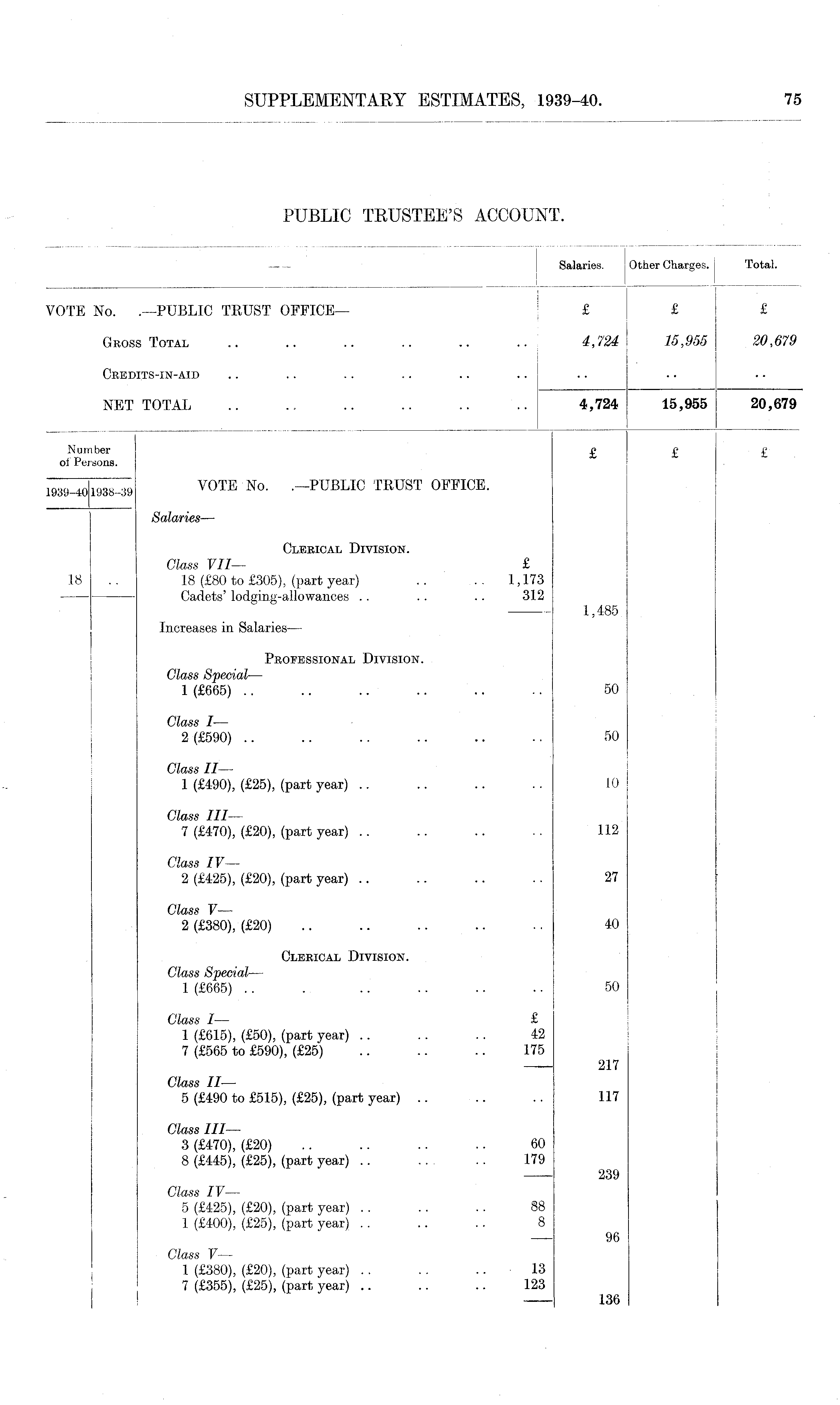 | Salaries. Other Charges, j Total. * VOTE No. .—PUBLIC TRUST OFFICE— £ 1 £ £ Gross Total .. .. .. .. .. .. 4,724 15,955 20,679 Credits-in-aid NET TOTAL .. .. .. 4,724 15,955 20,679 Number £ £ £ oi Persons. 1939-401938-39 Y0TE No - -—PUBLIC TRUST OFFICE. Salaries— Clerical Division. Class VII— £ 18 .. 18 (£80 to £305), (part year) .. . 1,173 Cadets' lodging-allowances .. .. .. 312 1,485 Increases in Salaries — Professional Division. Class Special— 1 (£665) .. .. .. .. .. •. 50 Class I— 2 (£590) .. .. .. .. .. •. 50 Class II — 1 (£490), (£25), (part year) .. .. .. .. 10 Class III— 7 (£470), (£20), (part year) .. .. .. .. 112 Class IV— 2 (£425), (£20), (part year) .. .. .. .. 27 Class V— 2 (£380), (£20) .. .. .. .. .. 40 Clerical Division. Class Special — 1 (£665) .. . .. .. .. .. 50 Class I— £ 1 (£615), (£50), (part year) .. .. .. 42 7 (£565 to £590), (£25) .. .. .. 175 — 217 Class II— 5 (£490 to £515), (£25), (part year) .. .. .. 117 Class III— 3 (£470), (£20) .. .. .. .. 60 8 (£445), (£25), (part year) .. .. .. 179 239 Class IV— 5 (£425), (£20), (part year) .. .. .. 88 1 (£400), (£25), (part year) .. .. .. 8 96 Class V — 1 (£380), (£20), (part year) .. .. 13 7 (£355), (£25), (part, year) .. .. .. 123 136