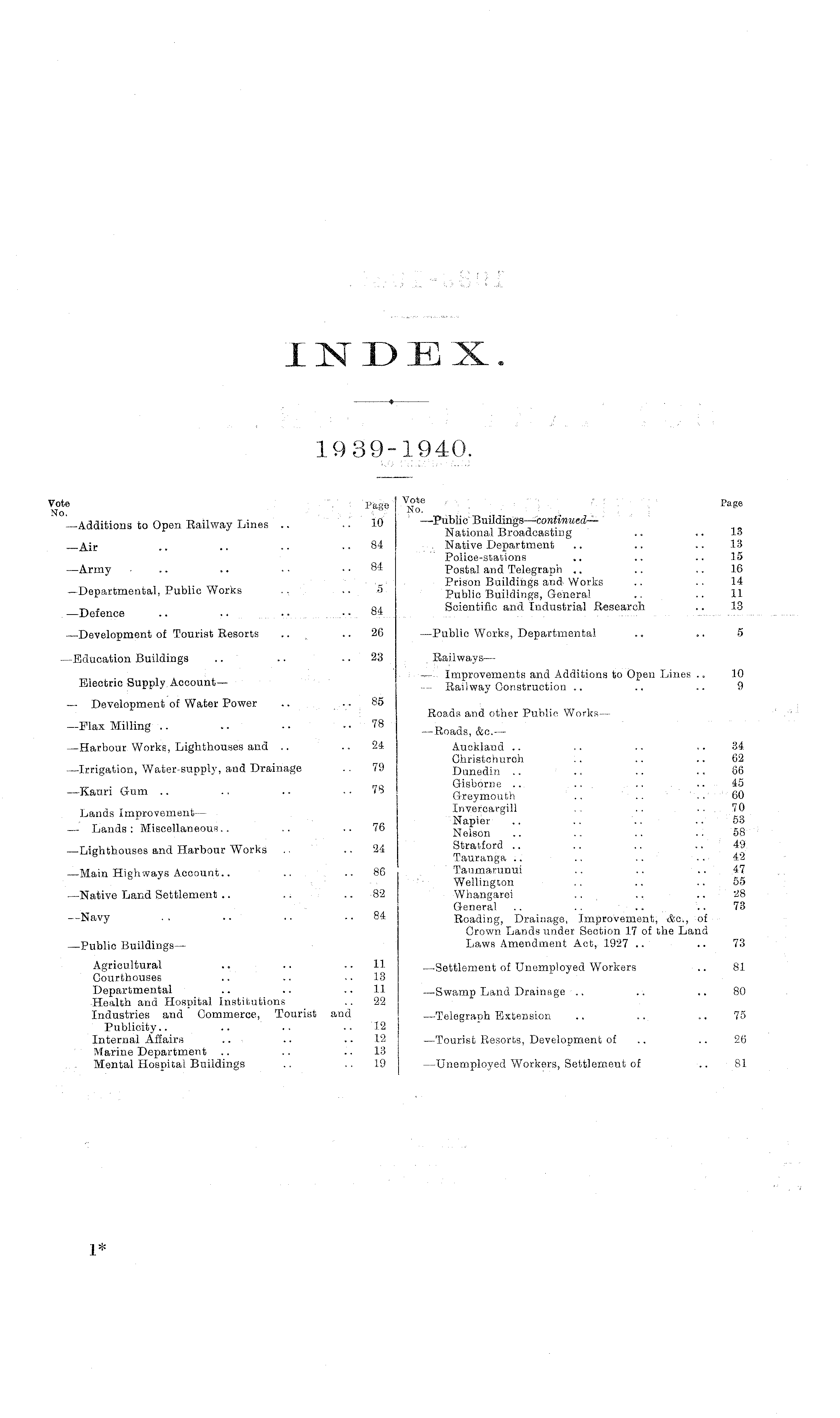 INDEX. 1939-1940. Vote Pago V^' e Page No -pto. -Additions to Open Railway Lines .. ..10 —Public; Builtogs— National Broadcasting .. .. 13 Ai r .. .. •• ..84 Native Department .. .. .. 13 Police-stations .. .. .. 15 —Army .. .. • • 84 Postal and Telegraph .. .. .. 16 Prison Buildings and Works .. .. 14 -Departmental, Public Works .. .. 5 Public Buildings, General .. .. 11 j) e j enoe 84 Scientific and Industrial Research .. 13 —-Development of Tourist Resorts .. ..26 —Public Works, Departmental .. .. 5 —Education Buildings .. .. .. 23 Railways— ; ■—; Improvements and Additions to Open Lines .. 10 Electric Supply Account- __ Railway Construction .. .. .. 9 — Development of Water Power .. 85 Roads and other Public Works— -Flax Milling 78 _ Roads , &o ._ —Harbour Works, Lighthouses and .. .. 24 Auckland .. .. .. .. 34 Christchurch .. .. .. 62 —Irrigation, Water-supply, and Drainage .. 79 Dunedin .. .. .. .. 66 T _ . n Q Gisborne .. .. . .. .. 45 —Kauri Gum .. .. .. ..78 Greymouth .. .. .. 60 Lands Improvement- Invetcargill .. .. .. 70 no Napier .. .. .. .. 55 — Lands: Miscellaneous.. .. ..7b Nelson .. .. 58 —Lighthouses and Harbour Works .. 24 Stratford .. .. .. .. 49 ° Tauranga .. .. .. .. 42 —Main Highways Account.. .. .. 86 Taumarunui .. . . .. 47 Wellington .. .. .. 55 —Native Land Settlement .. .. .. 82 Whangarei .. .. .. 28 General .. .. .. .. 73 —Navy .. .. •• ..84 Roading, Drainage, Improvement, &c., of Crown Lands under Section 17 of the Land Public Buildings— Laws Amendment Act, 1927 .. .. 73 Agricultural .. .. 11 —Settlement of Unemployed Workers .. 81 Courthouses .. .. ..13 Departmental .. .. 11 —Swamp Land Drainage .. .. .. 80 Health and Hospital Institutions .. 22 Industries and Commerce, Tourist and —Telegraoh Extension .. .. .. 75 Publicity.. .. .. 12 Internal Affairs .. .. 12 —Tourist Resorts, Development of .. 26 Marine Department .. .. 13 Mental Hospital Buildings .. ..19 —Unemployed Workers, Settlement of .. 81