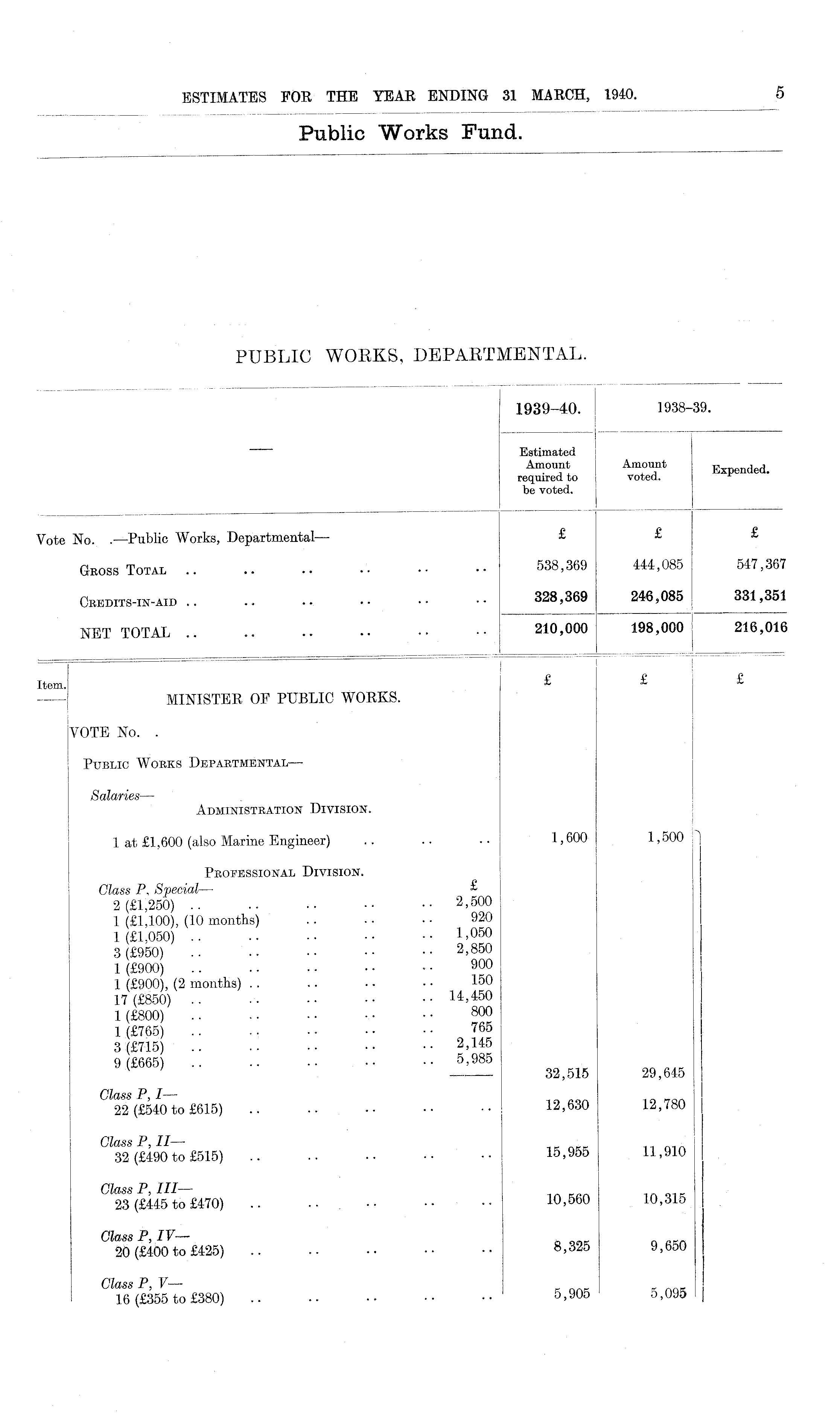 1939-40. 1938-39. Estimated Amount Amount Ex p e „ded. required to voted. be voted. Vote No. . —-Public Works, Departmental — £ £ £ GROSS Total .. .. .. •• •• 538,369 444,085 547,367 Credits-IN-AID _ 328,369 246,085 331,351 NET TOTAL .. .. •• •• •• •• 210,000 198,000 j 216,016 - i Item. £ £ £ MINISTER OF PUBLIC WORKS. VOTE No. . Public Works Departmental— Salaries — Administration Division. 1 at £1,600 (also Marine Engineer) .. .. •• 1,600 1,500 Professional Division. Class P, Special— £ 2 (£1,250) .. •• •• •• 2,500 1 (£1,100), (10 months) .. ■ • • • 920 1 (£1,050) .. •• •• •• M 50 3(£950) .. •• •• •• •• 2 > 850 I (£900) .. .. ■ ■ • • • ■ 900 1 (£900), (2 months) .. .. • • • • 150 17 (£850) .. •• •• •• 14,450 1 (£800) .. 800 1 (£765) .. • • 765 3 (£715) 2,145 9(£665) 32,515 C? 22 (£540 to £615) .. •• •• 12,630 12,780 Class P, II— 32 (£490 to £515) .. ■■ •• •• •• 15,955 11,910 Class P, III— ,, ,,, r 23 (£445 to £470) 10 > 560 10 •' 315 Class P, IV — 20 (£400 to £425) .. •• •• •• 8 > 325 9 > 650 Class P, V ■— 16 (£355 to £380) .. •• •• •• 5 ' 905 °> 095 I