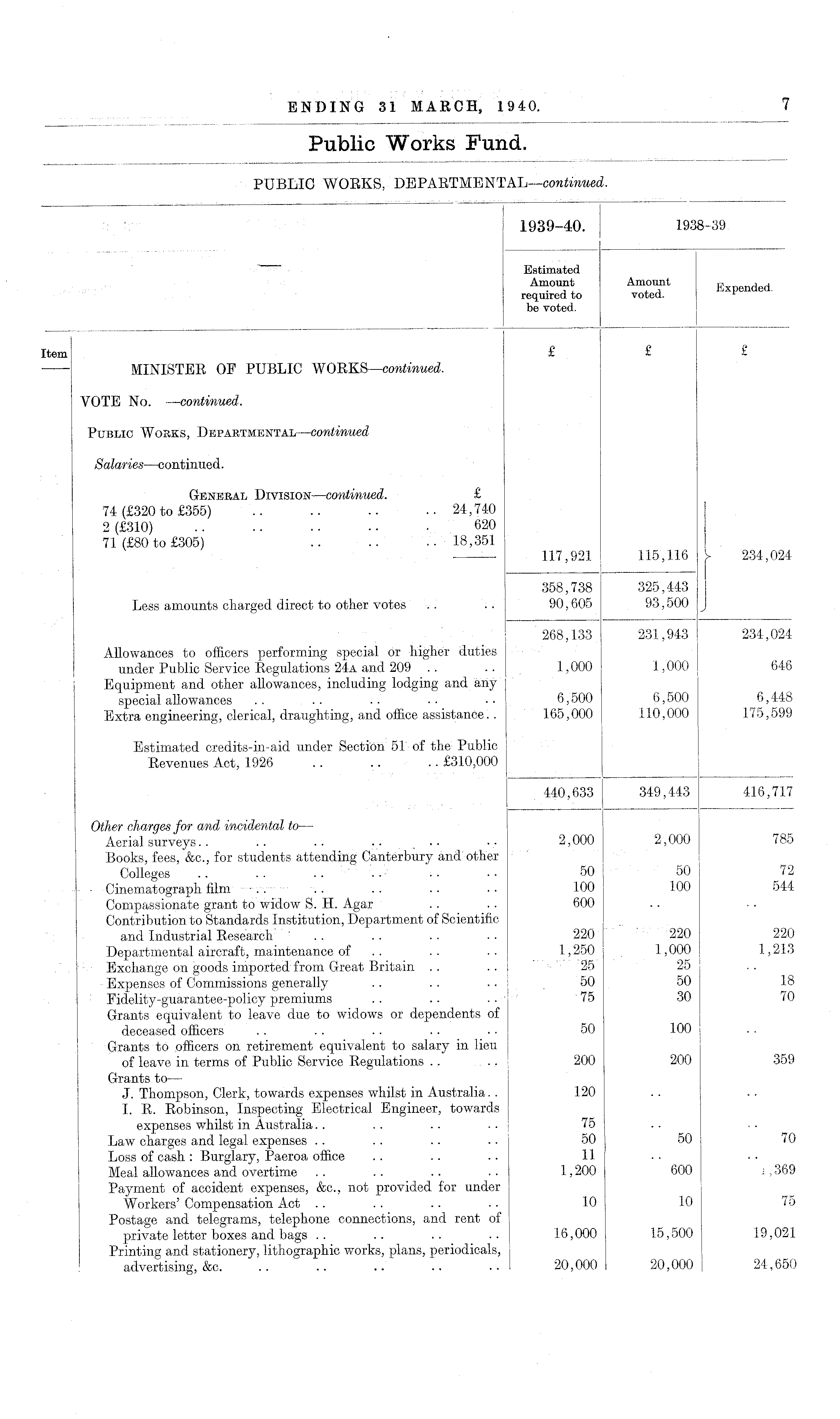 1939-40. 1938-39 Estimated Amount Amount Expended . required to voted. be voted. Item £ £ £ MINISTER OF PUBLIC WORKS —continued. VOTE No. —continued. Public Works, Departmental—continued Salaries —continued. General Division —continued. £ 74 (£320 to £355) .. .. .. .. 24,740 2(£310) .. .. • • • • • 620 71 (£80 to £305) .. .. ..18,351 117,921 115,116 J. 234,024 358,738 325,443 Less amounts charged direct to other votes . . . . 90,605 93,500 268,133 231,943 234,024 Allowances to officers performing special or higher duties under Public Service Regulations 24a and 209 . . .. 1,000 1,000 646 Equipment and other allowances, including lodging and any special allowances .. .. .. •• •• 6,500 6,500 6,448 Extra engineering, clerical, draughting, and office assistance. . 165,000 110,000 175,599 Estimated credits-in-aid under Section 51 of the Public Revenues Act, 1926 .. .. .. £310,000 440,633 349,443 416,717 Other charges for and incidental to — Aerial surveys. . .. .. .. .. .. 2,000 2,000 785 Books, fees, &c., for students attending Canterbury and other Colleges .. .. .. .. •• 50 50 72 • Cinematograph film . . .. . . • • 100 100 544 Compassionate grant to widow S. H. Agar .. .. 600 Contribution to Standards Institution, Department of Scientific and Industrial Research ' . . . . • • ■ • 220 220 220 Departmental aircraft, maintenance of .. .. .. 1,250 1,000 1,213 Exchange on goods imported from Great Britain . . .. 25 25 Expenses of Commissions generally .. .. •• 50 50 18 Fidelity-guarantee-policy premiums . . .. .. 75 30 70 Grants equivalent to leave due to widows or dependents of deceased officers .. . . .. . . • • 50 100 Grants to officers on retirement equivalent to salary in lieu of leave in terms of Public Service Regulations .. .. 200 200 359 Grants to — J. Thompson, Clerk, towards expenses whilst in Australia.. 120 I. R. Robinson, Inspecting Electrical Engineer, towards expenses whilst in Australia.. .. .. .. 75 Law charges and legal expenses .. .. .. .. 50 50 70 Loss of cash : Burglary, Paeroa office .. .. .. 11 Meal allowances and overtime . . .. .. .. 1,200 600 i, 369 Payment of accident expenses, &c., not provided for under Workers' Compensation Act .. .. .. .. 10 10 75 Postage and telegrams, telephone connections, and rent of private letter boxes and bags .. .. .. .. 16,000 15,500 19,021 Printing and stationery, lithographic works, plans, periodicals, advertising, &c. .. .. .. .. •• 20,000 20,000 24,650
