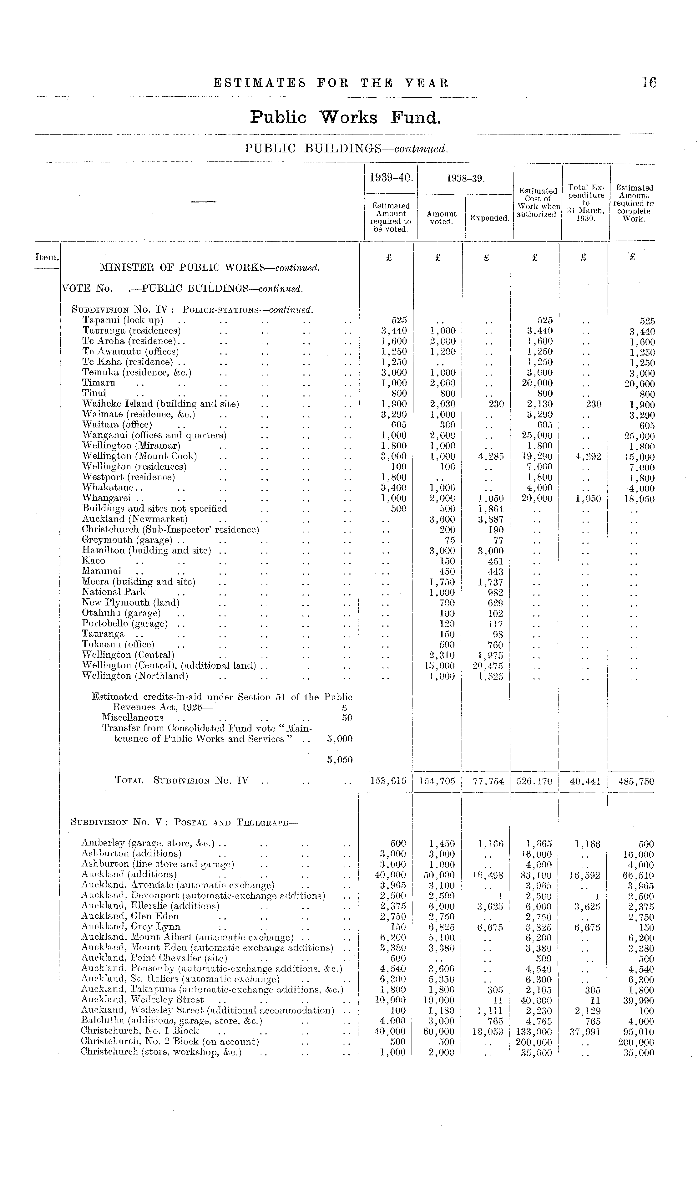 1939-40. 1938-39. Estimated Tot *' Ex " Estimated C ost penditure Amount Estimated Work when h squired to Amount Amount P , authorized CO m P required to voted. Expended 1939. Work, be voted. Item. ££££££ MINISTER OF PUBLIC W ORKS—continued. VOTE No. .—PUBLIC BUILDINGS —continued. Subdivision No. IV : Police-stations—continued. Tapanui (look-up) .. .. .. . . .. 525 .. .. 525 .. 525 Tauranga (residences) .. .. .. .. 3,440 1,000 .. 3,440 .. 3,440 Te Aroha (residence).. .. .. .. .. 1,600 2,000 .. 1,600 .. 1,600 Te Awamutu (offices) .. .. .. .. 1,250 1,200 .. 1,250 .. 1,250 Te Kaha (residence) .. .. .. .. .. 1,250 .. .. 1,250 .. 1,250 Temuka (residence, &e.) .. .. .. .. 3,000 1,000 .. 3,000 .. 3,000 Timaru .. .. .. .. .. .. 1,000 2,000 .. 20,000 .. 20,000 Tinui .. .. . . . . .. .. 800 800 .. 800 .. 800 Waiheke Island (building and site) .. .. .. 1,900 2,030 230 2,130 230 1,900 Waimate (residence, &c.) .. .. .. .. 3,290 1,000 .. 3,290 .. 3,290 Waitara (office) .. .. .. .. .. 605 300 .. 605 .. 605 Wanganui,( offices and quarters) .. .. .. 1,000 2,000 .. 25,000 .. 25,000 Wellington (Miramar) .. .. .. .. 1,800 1,000 .. 1,800 .. 1,800 Wellington (Mount Cook) .. .. .. .. 3,000 1,000 4,285 19,290 4,292 15,000 Wellington (residences) .. .. .. .. 100 100 .. 7,000 .. 7,000 Westport (residence) .. .. .. .. 1,800 .. .. 1,800 .. 1,800 Whakatane.. .. .. .. .. .. 3,400 1,000 .. 4,000 .. 4,000 Whangarei .. .. .. .. .. .. 1,000 2,000 1,050 20,000 1,050 18,950 Buildings and sites not specified .. . . . . 500 500 1,864 Auckland (Newmarket) .. .. .. .. .. 3,600 3,887 Christchurch (Sub-Inspector' residence) . . .. .. 200 190 Greymouth (garage) .. .. .. . . .. .. 75 77 Hamilton (building and site) .. .. .. .. .. 3,000 3,000 Kaeo .. .. .. .. .. . . .. 150 451 Manunui .. .. .. .. .. .... 450 443 Moera (building and site) .. .. .. .. .. 1,750 1,737 National Park .. .. .. .. .. .. 1,000 982 New Plymouth (land) .. .. .. .. .. 700 629 Otahuhu (garage) .. .. .. .. .. .. 100 102 Portobello (garage) .. .. .. .. .. .. 120 117 Tauranga .. .. .. .. .. .. .. 150 98 Tokaanu (office) .. .. .. . . .. .. 500 760 Wellington (Central) .. .. .. .. .. 2,310 1,975 Wellington (Central), (additional land) .. .. .. .. 15,000 20,475 Wellington (Northland) .. .. .. .. .. 1,000 1,525 ..I Estimated credits-in-aid under Section 51 of the Public Revenues Act, 1926— £ Miscellaneous .. .. .. .. 50 Transfer from Consolidated Fund vote " Maintenance of Public Works and Services " .. 5,000 ] 5,050 Total—Subdivision No. IV .. .. .. 153,615 154,705 j 77,754 526,170 40,441 j 485,750 Subdivision No. V: Postal and Telegraph— Amberley (garage, store, &c.) .. .. .. .. 500 1,450 1,166 1,665 1,166 500 Ashburton (additions) .. .. .. .. 3,000 3,000 .. 16,000 .. 16,000 Ashburton (line store and garage) .. .. .. 3,000 1,000 .. 4,000 .. 4,000 ! Auckland (additions) .. .. .. .. 40,000 50,000 16,498 83,100 16,592 66,510 Auckland, Avondale (automatic exchange) .. .. 3,965 3,100 .. 3,965 i .. 3,965 Auckland, Devonport (automatic-exchange additions) .. ! 2,500 2,500 1 2,500 1 2,500 Auckland, Ellerslie (additions) .. .. .. j 2,375 6,000 3,625 6,000 3,625 2,375 Auckland, Glen Eden .. .. .. ! 2,750 2,750 .. 2,750 .. 2,750 Auckland, Grey Lynn .. .. .. ; 150 6,825 6,675 6,825 6,675 150 Auckland, Mount Albert (automatic exchange) .. .. { 6,200 5,100 .. 6,200 .. 6,200 Auckland, Mount Eden (automatic-exchange additions) .. j 3,380 3,380 .. 3,380 .. 3,380 Auckland, Point Chevalier (site) .. .. .. j 500 .. .. 500 .. 500 Auckland, Ponsonby (automatic-exchange additions, &c.) : 4,540 3,600 .. 4,540 .. 4,540 Auckland, St. Heliers (automatic exchange) .. .. j 6,300 5,350 .. 6,300 .. 6,300 Auckland, Takapuna (automatic-exchange additions, &c.) ' 1,800 1,800 305 2,105 305 1,800 Auckland, Wellesley Street .. .. .. .. 10,000 10,000 11 40,000 11 39,990 Auckland, Wellesley Street (additional accommodation) .. ] 100 1,180 1,111 2,230 2,129 100 Balclutha (additions, garage, store, &c.) .. ... 4,000 3,000 765 4,765 765 4,000 Christchurch, No. 1 Block .. .. .. .. 40,000 60,000 18,059 133,000 37,991 95,010 Christchurch, No. 2 Block (on account) .. .. 500 500 .. 200,000 .. 200,0.00 Christchurch (store, workshop, &c.) ., ,, 1,000 2,000 1 35,000 .. 35,000