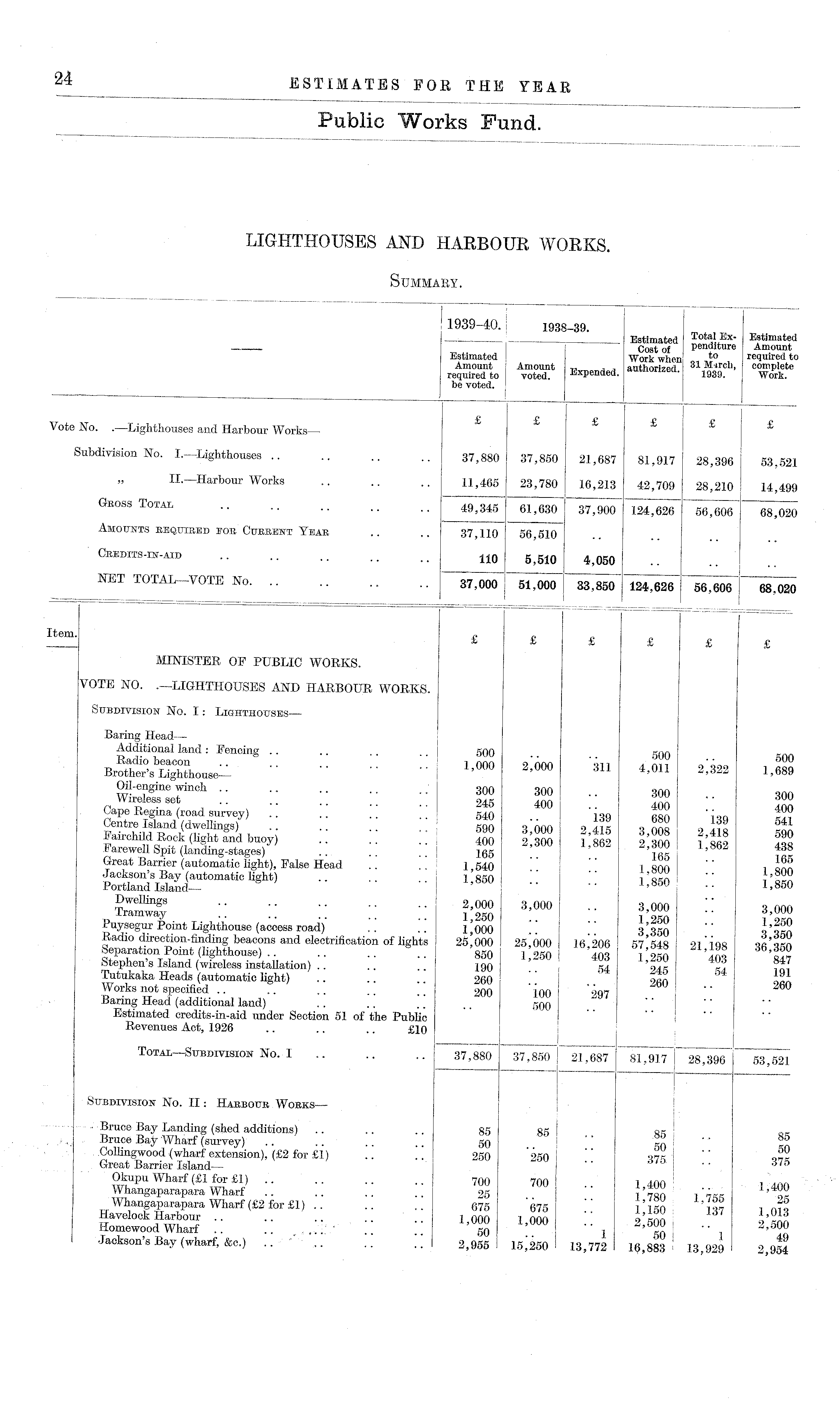 1939-40. i 1938-39. — Estimated Tot iL Ex " Estimated Cost of penditure Amount Estimated Work when to required to Amount Amount -p , , authorized 31 complete required to voted. Expended, auinonzea. 1939 , Work. be voted. Vote No. . —Lighthouses and Harbour Works— £ £ £ £ £ £ Subdivision No. I. Lighthouses 37,880 37,850 21,687 81,917 28,396 53,521 II.—Harbour Works H,46 5 23,780 16,213 42,709 28,210 14,499 GROSS Total 49,345 61630 g7>900 124>626 56606 g 8)020 Amounts required foe Current Year .. .. 37,110 56,510 Credits-in-aid .. .. .. .. 110 5)510 4;050 NET TOTAL—VOTE No 37,000 51,000 33,850 124,626 56,606 68 020 *£££££ MINISTER OP PUBLIC WORKS. VOTE NO. .—LIGHTHOUSES AND HARBOUR WORKS. Subdivision No. I: Lighthouses— Baring Head— Additional land: Fencing 500 .. .. 500 «ay> Brother"s Lighthouse— 2 ' 0 °° 311 4 ' 011 1,689 Oil-engine winch 300 300 300 Wireless set ...... 94 r. '* •* uu Gape Regina (road survey) .. .. .. .. 540 _ _ ' j 3 q fisn ' i „q k?? Centre Island (dwellings) .. .. .. .. 590 3 000 2 415 q niw 9 .f! ™ Pairchild Rock (Hght and buoy) .. . I 400 2*300 T'sfi9 9'snn i'qro ?S? farewell Spit (landing-stages) .. .. "| ! 1 ' 862 M62 f Great Barrier (automatic light), False Head .. .. 1,540 1 son , I l - m ■ : :: <■*»> :: >:S :: :: :: :: :: »•«» «»» ■ «.«» :: Puysegur Point Lighthouse (access road) .. .. . " 3'3go " I'wi Radio direction-finding beacons and electrification of lights 25,000 25,000 16i206 21*198 <*6 350 Separation Point (lighthouse) .. .. .. .. 850 1 250 4rw ™ 'loo Stephen's Island (wireless installation) .. .. .. 190 ' xa r . Tutukaka Heads (automatic Hght) 260 !! 900 JfiO Works not specified 200 100 '297 " Baring Head (additional land) . . ., .. ,. 500 Estimated credits-in-aid under Section 51 of the Public Revenues Act, 1926 .. .. .. £10 Total Subdivision No. I 37,880 2lT687 8UH7 2M96 53J521 Subdivision No. II: Harbour Wobks— Bruce Bay Landing (shed additions) ...... 85 8*> « . Bruce Bajr Wharf (survey) .. .. .. .. 50 " '' Collingwood (wharf extension), (£2 for £1) .. 1! 250 ~250 " oSi " J? Great Barrier Island— " ' " . & Okupu Wharf (£1 for £1) 700 700 .. 1,400 1 400 Whangaparapara Wharf .. .. .. .. 25 1 1'7'sft or Whangaparapara Wharf (£2 for £1) 675 ' 6 75 !l'l50 137 1 m o Havelock Harbour 1, 000 1,000 .. 2 500 '>500 Homewood Wharf .. .. T ' .. .. 50 1 " aci Jackson's Bay (wharf, &c.) .. 2,955 I 13,772 16,883 i 13,929 2,954