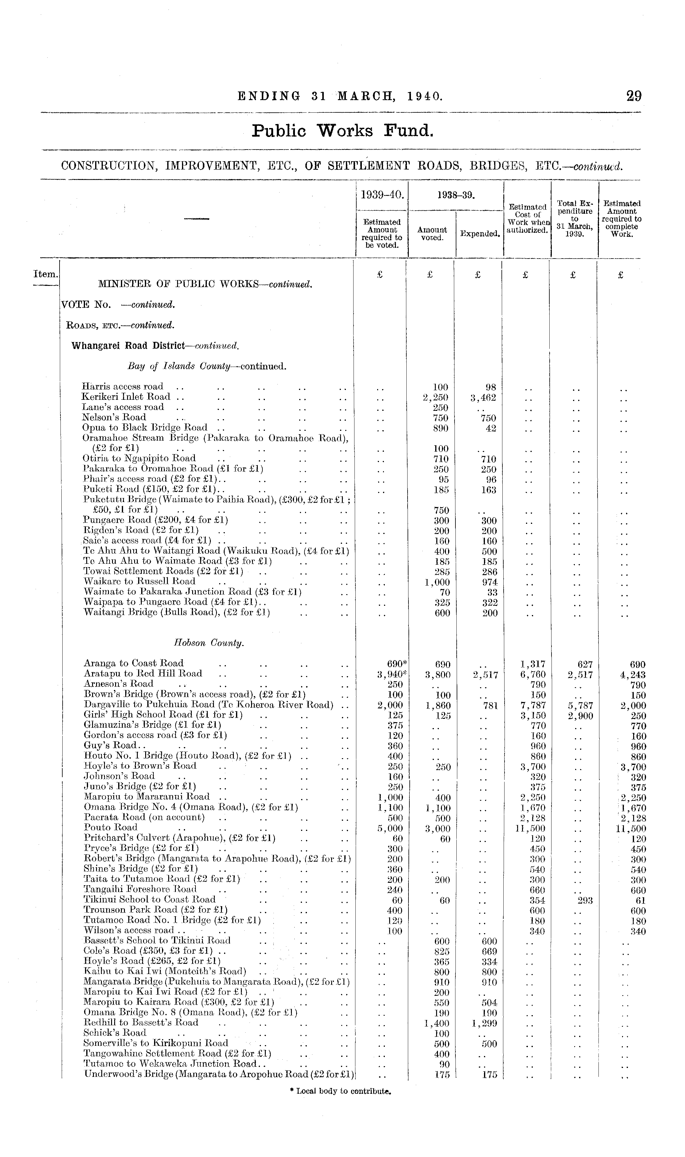 1939-40. 1938-39. Total Ex- Estimated Estimated Pendlture Amount Estimated Work when „ 1 Amount Amount p,, authorized. kv?u Wnrt required to voted. Ex Pended. 1939. Work. be voted. I ~~i " J ticin I j0 1 MINISTER OF PUBLIC WORKS —continued. VOTE No. —continued. Roads, etc. —continued. Whangarei Road District—continued. Bay of Islands County—continued. Harris access road .. .. .. .. .. ., 100 98 Kerikeri Inlet Road .. .. .. .. .. .. 2,250 3,462 Lane's access road .. .. .. .. .. .. 250 Nelson's Road ... .. .. .. .. .. 750 750 Opua to Black Bridge Road .. .. .. .. .. 890 42 Oramahoe Stream Bridge (Pakaraka to Oramahoe Road), (£2 for £1) 100 Otiria to Ngapipito Road .. .. . . .. .. 710 710 Pakaraka to Oromahoe Road (£1 for £1) .. .. .. 250 250 Phair's access road (£2 for £1).. .. .. .. .. 95 96 Puketi Road (£150, £2 for £1).. .. .. .. .. 185 163 Puketutu Bridge (Waimate to Paihia Road), (£300, £2 for£l ; £50, £lfor£l) .. .. .. .. .. .. 750 Pungaere Road (£200, £4 for £1) .. .. .. .. 300 300 Rigden's Road (£2 for £1) .. .. .. .. .. 200 200 Saie's access road (£4 for £1) .. .. .. .. .. 160 160 Te Ahu Ahu to Waitangi Road (Waikuku Poad), (£4 for £1) .. 400 500 Te Ahu Ahu to Waimate Road (£3 for £1) .. .. .. 185 185 Towai Settlement Roads (£2 for £1) . . .. .. .. 285 286 Waikare to Russell Road .. .. .. .. .. 1,000 974 Waimate to Pakaraka Junction Road (£3 for £1) .. .. 70 33 Waipapa to Pungaere Road (£4 for £1).. .. .. .. 325 322 Waitangi Bridge (Bulls Road), (£2 for £1) .. .. .. 600 200 Hobson County. Aranga to Coast Road .. .. .. .. 690* 690 .. 1,317 627 690 Aratapu to Red Hill Road .. .. .. .. 3,940* 3,800 2,517 6,760 2,517 4,243 Arneson's Road .. .. .. .. .. 250 .. .. 790 .. 790 Brown's Bridge (Brown's access road), (£2 for £1) .. 100 100 .. 150 .. 150 Dargaville to Pukehuia Road (Te Koheroa River Road) .. 2,000 1,860 781 7,787 5,787 2,000 Girls'High School Road (£1 for £1) .. .. .. 125 125 .. 3,150 2,900 250 Glamuzina's Bridge (£1 for £1) .. .. .. 375 .. .. 770 .. 770 Gordon's access road (£3 for £1) .. .. .. 120 .. .. 160 .. 160 Guy's Road.. .. .. .. .. .. 360 .. .. 960 . . 960 Houto No. 1 Bridge (Houto Road), (£2 for £1) .. .. 400 .. .. 860 .. 860 Hoyle's to Brown's Road .. .. .. .. 250 250 .. 3,700 .. 3,700 I Johnson's Road .. .. . . .. .. 160 .. .. 320 .. : 320 Juno's Bridge (£2 for £1) .. .. .. .. 250 .. .. 375 .. 375 Maropiu to Mararanui Road .. .. .. .. 1,000 400 .. 2,250 .. 2,250 Omana Bridge No. 4 (Omana Road), (£2 for £1) .. 1,100 1,100 .. 1,670 .. 1 '670 Paerata Road (on account) .'. .. .. .. 500 500 .. 2,128 .. 2,128 PoutoRoad .. .. .. .. .. 5,000 3,000 .. 11,500 .. 11,500 Pritchard's Culvert (Arapohue), (£2 for £1) .. .. 60 60 .. 120 .. 120 Pryce's Bridge (£2 for £1) . i .. ... .. 300 .. .. 450 .. 450 Robert's Bridge (Mangarata to Arapohue Road), (£2 for £1) 200 .. .. 300 .. 300 Shine's Bridge (£2 for £1) .. .. .. .. 360 .. .. 540 .. 540 Taita to Tutamoe Road (£2 for £l) .. .. .. 200 200 .. 300 .. 300 Tangaihi Foreshore Road .. .. .. .. 240 .. .. 660 .. 660 Tikinui School to Coast Road .... .. 60 60 .. 354 293 61 Trounson Park Road (£2 for £1) .. .. .. 400 .. .. 600 .. 600 Tutamoe Road No. 1 Bridge (£2 for £1) .. .. 120 .. .. 180 .. 180 Wilson's access road .. .. .. .. ,. 100 .. .. 340 .. 340 Bassett's School to Tikinui Road .. j .. .. .. 600 600 Cole's Road (£350, £3 for £1) .. .. .. .. .. 825 669 Hoyle's Road (£265, £2 for £1) .. .. .. .. 365 334 Kaihu to Kai Iwi (Monteith's Road) . . .. .. .. 800 800 Mangarata Bridge (Pukehuia to Mangarata Road), (£2 for £1) .. 910 910 Maropiu to Kai Iwi Road (£2 for £1.) .. .. .. .. 200 Maropiu to Kairara Road (£300, £2 for £1) .. .. .. 550 504 Omana Bridge No. 8 (Omana Road), (£2 for £1) .. 190 190 Redhill to Bassett's Road .. .. .. .. .. 1,400 1,299 Schick's Road .. .. .. .. .. .. 100 Somerville's to Kirikopuni Road .. .. .. .. 500 500 Tangowahinc Settlement Road (£2 for £1) .. .. .. 400 .. .. ... Tutamoe to Wekaweka Junction Road.. .. .. .. 90 .. .. .. I .. Underwood's Bridge (Mangarata to Aropohue Road (£2 for £1) .. 175 175 .. ..I * Local body to contribute.