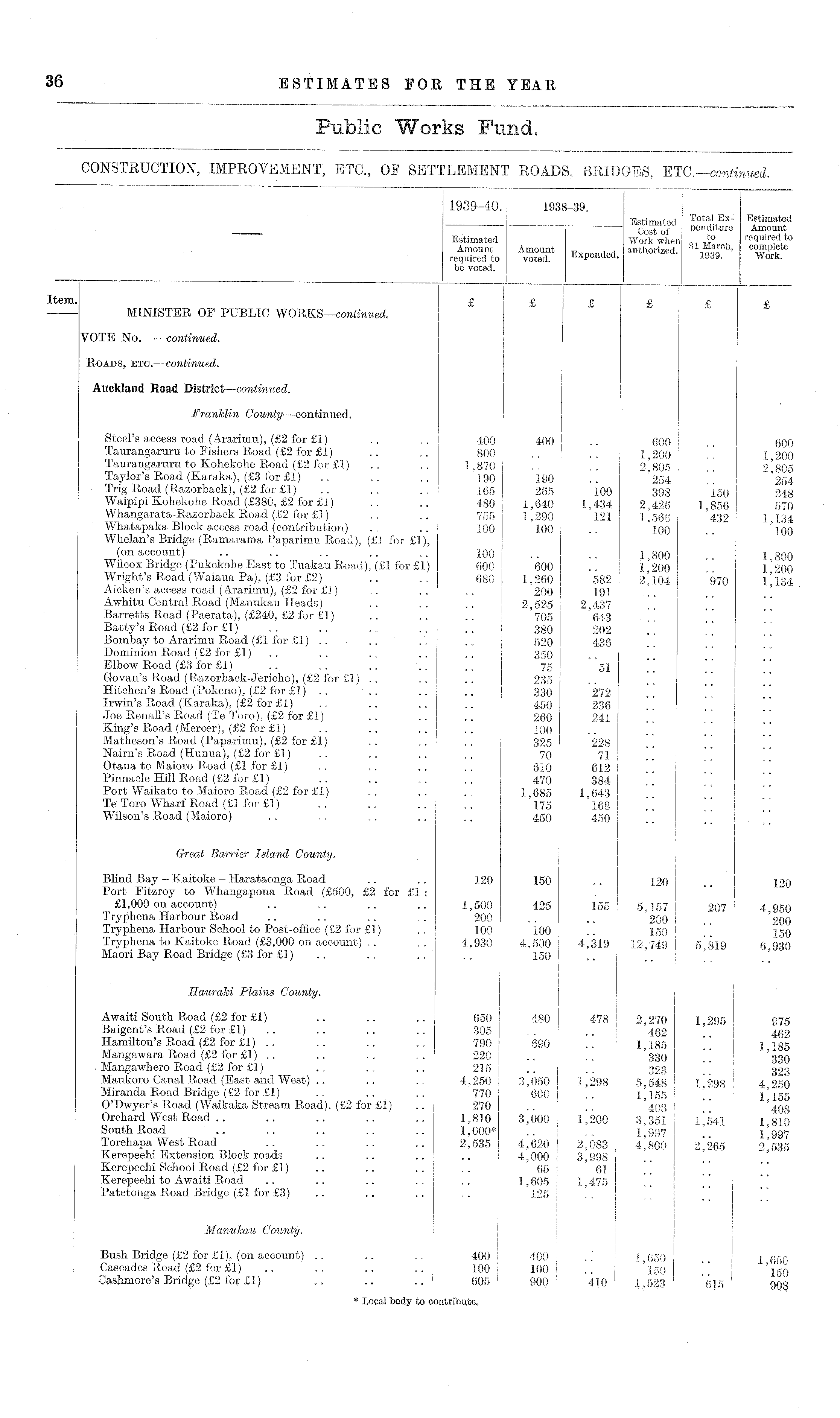 1939-40. 1938-39. Estimated To »l E *- Estimated Q ost 0 f penditure Amount Estimated Work when JE? , required to Amount Amount ExDended authorized. w£k required to voted. expended. 1939. Work, be voted. Item. £ ££££■£ MINISTER OP PUBLIC W ORKS—continued. VOTE No. —continued. Roads, eto. —continued. Auckland Road District —continued. Franklin County—continued. Steel's access road (Ararimu), (£2 for £1) .. .. 400 400 ! .. 600 .. 600 Taurangaruru to Fishers Road (£2 for £1) .. .. 800 .. .. 1 200 I 200 Taurangaruru to Kohekohe Road (£2 for £1) .. .. 1,870 .. .. 2'805 " 2' 805 Taylor's Road (Karaka), (£3 for £1) .. .. .. 'l90 190 .. '254 "'254 Trig Road (Razorback), (£2 for£l) .. .. .. 165 265 100 398 iso 248 Waipipi Kohekohe Road (£380, £2 for £1) .. .. 480 1,640 1,434 2,426 1 856 570 Whangarata-Razorback Road (£2 for £1) .. .. 755 1,290 121 1 566 432 1 134 Whatapaka Block access road (contribution) .. .. 100 100 .. ' 100 . ' 100 Whelan's Bridge (Ramarama Paparimu Road), (£1 for £1), (on account) .. .. .. .. .. 100 .. .. 1,800 .. 1 800 Wilcox Bridge (Pukekohe East to Tuakau Road), (£1 for £1) 600 600 .. 1,200 l'200 Wright's Road (Waiaua Pa), (£3 for £2) .. .. 680 1,260 582 2' 104 970 l'l34 Aicken's access road (Ararimu), (£2 for £1) .. .. .. 200 191 Awhitu Central Road (Manukau Heads) .. .. .. 2 525 2.437 Barretts Road (Paerata), (£240, £2 for £1) .. .. .. 705 643 Batty's Road (£2 for £1) .. .. .. .. .. 380 202 Bombay to Ararimu Road (£1 for £1) .. .. .. .. 520 436 Dominion Road (£2 for £1) .. .. .. .. 350 Elbow Road (£3 for £1) .. .. .. .. .. 75 51 Govan's Road (Razorback-Jericho), (£2 for £1) .. .. .. 235 Hitchen's Road (Pokeno), (£2 for £1) .. .. .. .. 330 272 Irwin's Road (Karaka), (£2 for £1) .. .. .. .. 450 236 Joe Renall's Road (Te Toro), (£2 for £1) .. .. .. 260 241 King's Road (Mercer), (£2 for £1) .. .. .. .. 100 Matheson's Road (Paparimu), (£2 for £1) .. .. .. 325 228 Nairn's Road (Hunua), (£2 for £1) .. .. .. .. 70 71 Otaua to Maioro Road (£1 for £1) .. .. .. .. 610 612 Pinnacle Hill Road (£2 for £1) .. .. .. .. 470 384 Port Waikato to Maioro Road (£2 for £1) .. .. .. 1 685 1 643 Te Toro Wharf Road (£1 for £1) .. .. .. .. 175 'l68 Wilson's Road (Maioro) .. .. .. .. .. 450 450 Great Barrier Island County. Blind Bay - Kaitoke - Harataonga Road .. .. 120 150 .. 120 120 Port Fitzroy to Whangapoua Road (£500, £2 for £1 : £1,000 on account) .. .. .. .. 1,500 425 155 5,157 207 4 950 Tryphena Harbour Road .. .. .. .. 200 .. .. 200 ' 200 Tryphena Harbour School to Post-office (£2 for £1) .. 100 100 .. 150 150 Tryphena to Kaitoke Road (£3,000 on account) .. .. 4,930 4,500 4,319 12 749 5 819 6 930 Maori Bay Road Bridge (£3 for £1) .. .. .. .. 150 '. Hauraki Plains County. Awaiti South Road (£2 for £1) .. .. .. 650 480 | 478 2,270 1,295 975 Baigent's Road (£2 for £1) .. .. .. .. 305 .. .. '462 '. 462 Hamilton's Road (£2 for £1) .. .. .. .. 790 690 .. 1,185 '' 1 135 Mangawara Road (£2 for £1).. .. .. .. 220 .. .. ' 330 ' 330 Mangawhero Road (£2 for £1) .. .. .. 215 .. .. 393 323 Maukoro Canal Road (East and West) .. .. .. 4,250 3,050 1,298 5,548 1 298 4 250 Miranda Road Bridge (£2 for £1) .. .. .. 770 600 .. 1155 O'Dwyer's Road (Waikaka Stream Road). (£2 for £1) .. 270 .. .. 408 '4O8 Orchard West Road .. .. .. .. .. 1,810 3,000 1,200 3,351 1 541 1 810 South Road 1,000* .. | .. 1,997 1997 Torehapa West Road .. .. .. .. 2,535 4,620 i 2,083 4,800 2,265 2'535 Kerepeehi Extension Block roads .. .. .. .. 4,000 3 998 Kerepeehi School Road (£2 for £1) .. .. .. . . 65 61 Kerepeehi to Awaiti Road .. .. .. .. .. 1,605 I 475 Patetonga Road Bridge (£1 for £3) .. .. .. .. 125 Manukau County. Bush Bridge (£2 for £1), (on account) .. .. .. 400 400 .. 1,650 .. 1 650 I Cascades Road (£2 for £1) .. .. .. .. 100 100 .. 150 " "l50 Cashmore's Bridge (£2 for £1) .. .. .. 1 605 900 410 1.523 615 908 * Local body to contribute,