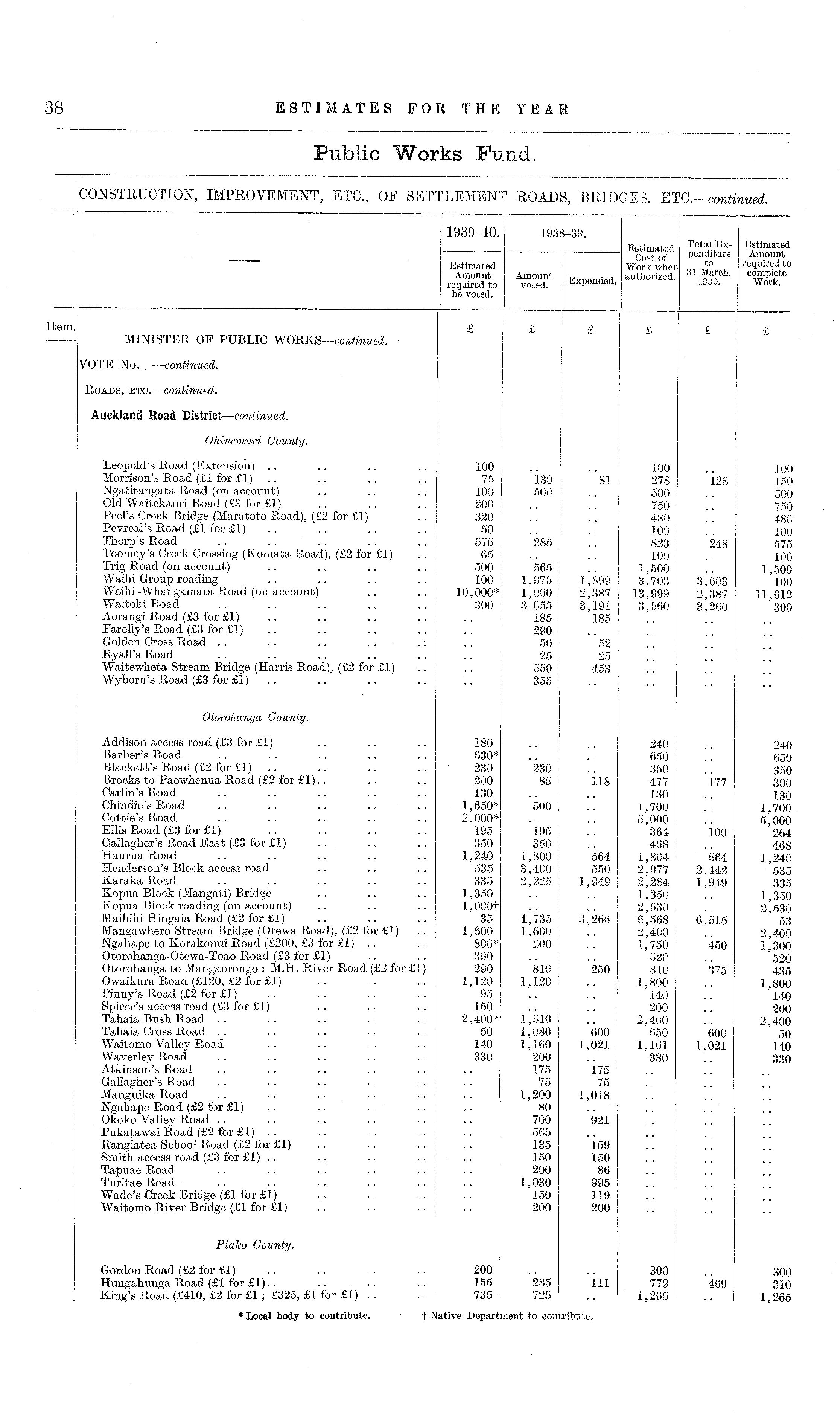 1939-40. 1938-39. u-tr m «trf Total Ex- Estimated Cost of pend'toe Amount Estimated Work when .J 0 . required to Amount Amount Edd authorized. 31 S ch ' C^ n P r J required to voted. 1939. Work, be voted. —— . . . . Item. £ ' £ £ £ £ 1 £ MINISTER OF PUBLIC WORKS—continued. VOTE No. . —continued. Roads, etc. —continued. Auckland Road District —continued. Ohinemuri County. \ Leopold's Road (Extension) .. .. .. .. 100 .. .. 100 .. 100 Morrison's Road (£1 for £1) .. .. .. .. 75 130 81 278 128 150 Ngatitangata Road (on account) .. .. .. 100 500 \ .. 500 .. i 500 Old Waitekauri Road (£3 for £1) .. .. .. 200 . . .. 750 .. 750 Peel's Creek Bridge (Maratoto Road), (£2 for £1) .. : 320 .. .. ' 480 .. 480 Pevreal's Road (£1 for £1) .. .. .. .. 50 .. .. 100 .. 100 Thorp's Road .. .. .. .. .. 575 285 .. 823 248 575 Toomey's Creek Crossing (Komata Road), (£2 for £1) .. 65 .. .. 100 .. 100 Trig Road (on account) .. .. .. .. 500 565 I .. 1,500 .. 1,500 Waihi Group roading .. .. .. .. 100 1,975 1,899 3,703 3,603 'l00 Waihi-Whangamata Road (on account) .. .. 10,000* 1,000 2,387 13,999 2,387 11,612 WaitokiRoad .. .. .. .. .. 300 3,055 3,191 3,560 3.260 *300 Aorangi Road (£3 for £1) .. .. .. .. .. 185 185 Farelly's Road (£3 for £1) .. .. .. .. .. 290 Golden Cross Road .. .. .. .. .. .. 50 52 Ryall's Road .. .. .. .. .. .. 25 25 Waitewheta Stream Bridge (Harris Road), (£2 for £1) .. .. 550 453 Wyborn's Road (£3 for £1) .. .. .. .. .. 355 Otorohanga County. Addison access road (£3 for £1) .. .. .. 180 .. .. 240 .. 240 Barber's Road .. .. .. .. .. 630* .. .. 650 .. 650 Blackett's Road (£2 for £1) .. .. .. .. 230 230 .. 350 .. 350 Brocks to Paewhenua Road (£2 for £1). . .. .. 200 85 118 477 177 300 Carlin's Road .. .. .. .. .. 130 .. .. 130 .. 130 Chindie's Road .. .. .. .. .. 1,650* 500 .. 1,700 .. 1,700 Cottle's Road .. .. .. .. .. 2,000* .. .. 5,000 .. 5'000 Ellis Road (£3 for £1) .. .. .. .. 195 195 .. 364 100 '264 Gallagher's Road East (£3 for £1) .. .. . . 350 350 .. 468 .. 468 Haurua Road .. .. .. .. .. 1,240 1,800 564 1,804 564 1,240 Henderson's Block access road .. .. .. 535 3,400 550 2,977 2,4-42 '535 Karaka Road .. .. .. .. .. 335 2,225 1,949 2,284 1,949 335 Kopua Block (Mangati) Bridge .. .. .. 1,350 .. .. 1,350 . 1,350 Kopua Block roading (on account) .. .. .. l,000f .. .. 2,530 .. 2 530 Maihihi Hingaia Road (£2 for £1) .. .. .. 35 4,735 3,266 6,568 6,515 ' 53 Mangawhero Stream Bridge (Otewa Road), (£2 for £1) .. 1,600 1,600 .. 2,400 .. 2,400 Ngahape to Korakonui Road (£200, £3 for £1) .. .. 800* 200 .. 1,750 450 1^300 Otorohanga-Otewa-Toao Road (£3 for £1) .. .. 390 .. .. 520 .. '520 Otorohanga to Mangaorongo : M.H. River Road (£2 for £1) 290 810 250 810 375 435 Owaikura Road (£120, £2 for £1) .. .. . . 1,120 1,120 .. 1,800 .. 1 800 Pinny's Road (£2 for £1) .. .. .. .. 95 .. .. 140 .. 140 Spicer's access road (£3 for £1) .. .. .. 150 .. .. 200 .. 200 Tahaia Bush Road .. .. .. . . .. 2,400* 1,510 .. 2,400 .. 2,400 Tahaia Cross Road . . . . .. .. . . 50 1,080 600 650 600 ' 50 Waitomo Valley Road .. .. .. 140 1,160 1,021 1,161 1,021 140 Waverley Road .. . . .. . . . . 330 200 .. 330 .. 330 Atkinson's Road .. . . .. . . .. .. 175 175 Gallagher's Road . . .. .. . . .. .. 75 75 Manguika Road .. .. .. .. .. .. 1,200 1,018 Ngahape Road (£2 for £1) .. . . .. .. 80 Okoko Valley Road .. .. .. . . . . .. 700 921 Pukatawai Road (£2 for £1) .. .. .. .. .. 565 Rangiatea School Road (£2 for £1) .. .. . . .. 135 159 Smith access road (£3 for £1) .. .. .. .. .. 150 150 Tapuae Road .. .. •. . ■ .. .. 200 86 Turitae Road .. . . ■ . . . . . .. 1,030 995 Wade's Creek Bridge (£1 for £1) .. .. . . .. 150 119 Waitomo River Bridge (£1 for £1) .. .. . . .. 200 200 Piako County. Gordon Road (£2 for £1) .. . . .. .. 200 .. .. 300 .. 300 Hungahunga Road (£1 for £1).. ■■ .. 155 285 111 779 469 310 King's Road (£410, £2 for £1; £325, £1 for £1) .. .. 735 725 .. 1,265 .. 1,265 * Local body to contribute. t Native Department to contribute.