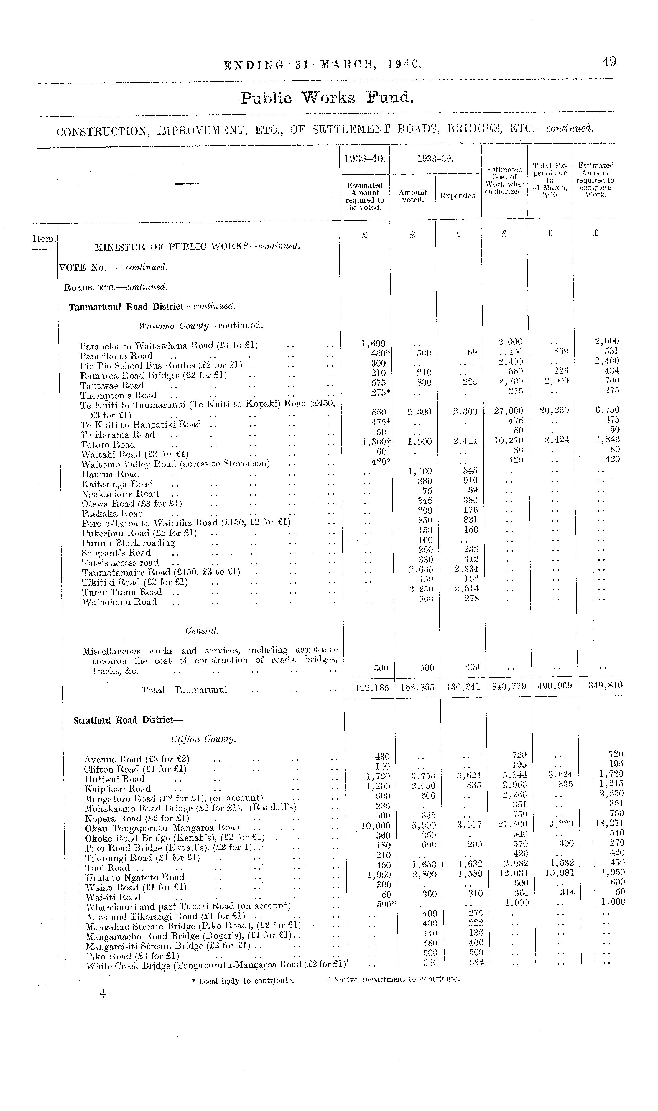 1939-40. 1938-39. n, , , Total Ex- Estimated , a penditure Amount Estimated Work when 31 Amount Amount ExT)ended authorized. 1939 Worli> required to voted. 1 be voted. Item. £ £ £ £ £ £ MINISTER OF PUBLIC WORKS —continued. jVOTE No. —continued. Roads, etc. —continued. Taumarunui Road District —continued. Waitomo County—continued. Paraheka to Waitewhena Road (£4 to £1) .. •• l' 600 'ion 2 'vn Paratikona Road 430* 500 69 1,400 869 531 Pio Pio School Bus Routes (£2 for £1) .. .. •• 300 .. •• "nno Sr a :Ro°:d Bridge3(£2f0r£1) •• •: :: 575 800 m 2,700 2,000 700 Road " !! .. •• 275* .. .. 275 .. 275 T mor " _U1 (Te Kmtl t0 K * kl) M P50 ' 550 2,300 2,300 27,000 20,250 6,750 Te Kuiti to Bangatiki Road .. .. ■ • • • 475* .. .. 475 .. 475 TotoroXad K ° ad '.! " " - 1.300t 1,'m 2,4*1 10,270 8,424 1,846 Wait-ahi Road (£3 for £1) 60 •• 80 .. ou Waitomo Valley Road (access to Stevenson) .. .. 420 .. •• Haurua Road .. 1,100 545 Kaitaringa Road .. .. .. • ■ • • ■ • 880 91b Ngakaukore Road .. .. . • • • • • ■ • 75 59 Otewa Road (£3 for £1) .. •• •• •• 345 384 Paekaka Road 200 176 Poro-o-Taroa to Waimiha Road (£150, £2 for £1) 850 831 Pukerimu Road (£2 for £1) .. • • • • • ■ • ■ 150 150 Pururu Block reading . . • • • • • • • • 100 .. Sergeant's Road 260 233 Tate's access road .. .. • • ■ • ■ • • • A ;; t> f Taumatamaire Road (£450, £3 to £1) .. .. •• 2,68o j Tikitiki Road (£2 for £1) 150 . 152 TumuTumuRoad .. .. .. •• •• 2,250 2,614 Waihohonu Road .. .. • • • • • ■ • • 600 General. . Miscellaneous works and services, including assistance i towards the cost of construction of roads, bridges, tracks, &c 500 500 409 Total —Taumarunui 122,185 168,865 130,341 840,779 490,969 349,810 Stratford Road District — Clifton County. Avenue Road (£3 for £2) •• 430 .. •• 720 .. 720 Clifton Road (£1 for £1) 100 •• •• *9° HutiwaiRoad 1.720 3,750 3,624 5,344 3,624 ,720 Kaipikari Road .. .. 1.200 2,050 83o 2,050 835 1,2 In Mangatoro Road (£2 for £1), (on account) .. .. 600 600 .. 2,250 .. <i,-ou Mohakatino Road Bridge (£2 for £1), (Randall's) .. 235 .. .. 351 .. Nopera Road (£2 for £1) .. 500 335 750 .. <ou Okau-Tongaporutu-Mangaroa Road .. .. •• 10,000 5,000 3,5o7 -7,500 , 1 Okoke Road Bridge (Kenah's), (£2 for £1) 360 250 540 540 Piko Road Bridge (Ekdall's), (£2 fori).. .. .. 180 600 200 570 300 270 ?o k oiRo S ad ROad(£lf ° r£1) :: 450 M50 2,082 M32 450 Uruti to Ngatoto Road " .. 1.950 2,800 1,589 12,031 10,081 1,950 Waiau Road (£1 for £1) .. .•• 300 .. •• 600 .. 600 Wfli-iti Road .. .. •• 50 360 310 364 314 50 Wharekauri and part Tupari Road (on account) .. 500* .. 1,000 .. 1,000 Allen and Tikorangi Road (£1 for £1) .. ■■ •• 400 w7o Mangahau Stream Bridge (Piko Road), (£2 for £1) .. •• 400 2w2 Mangamaeho Road Bridge (Roger's), (£1 for £1).. . • • • 140 13b Mangarei-iti Stream Bridge (£2 for £1) .. . • • • • • 480 40b Piko Road (£3 for £1) .. j 500 500 White Creek Bridge (Tongaporutu-Mangaroa Road (£2 for £1) .. .>-0 —4 * Local body to contribute, f Native Department to contribute,