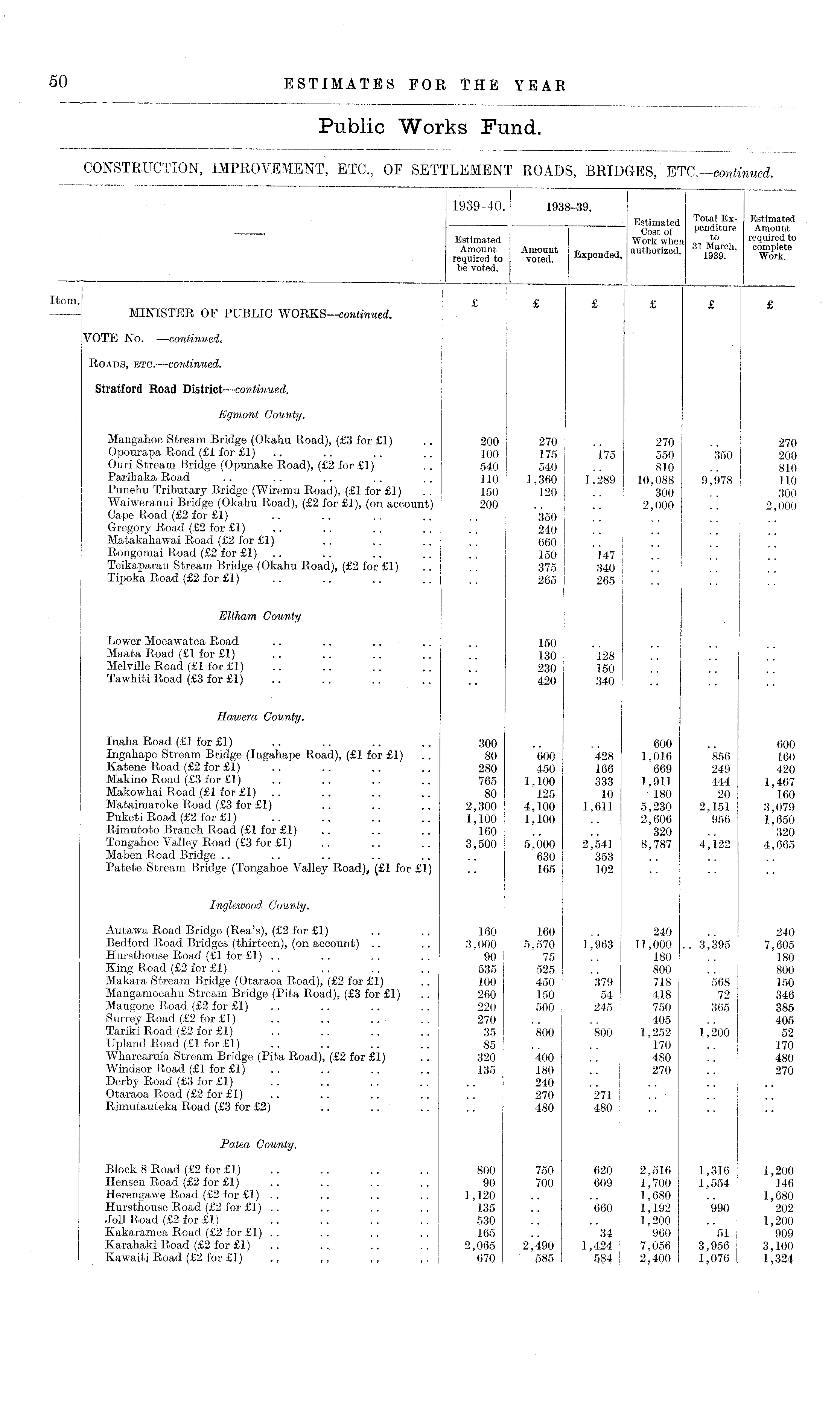 1939-40. 1938-39. Estimated Total .Ex- Estimated Q ost 0 f penditure Amount Estimated Work when Jf° . required to Amount Amount E] , authorized. ,o?a required to voted. Expended. 1939. Work, be voted. Item. £ £ £ £ £ £ MINISTER OF PUBLIC WORKS—continued. VOTE No. —continued. Roads, etc.—continued. Stratford Road District—continued. Eqmont County. Mangahoe Stream Bridge (Okahu Road), (£3 for £1) .. 200 270 .. 270 .. 270 Opourapa Road (£1 for £1) .. .. .. .. 100 175 175 550 350 200 Ouri Stream Bridge (Opunake Road), (£2 for £1) .. 540 540 .. 810 . . 810 Parihaka Road .. .. .. .. .. 110 1,360 1,289 10,088 110 Punehu Tributary Bridge (Wiremu Road), (£1 for £1) .. 150 ! 120 . . 300 . . 300 Waiweranui Bridge (Okahu Road), (£2 for £1), (on account) 200 ! .. .. 2,000 .. 2 000 Cape Road (£2 for £1) .. .. .. .. .. 350 Gregory Road (£2 for £1) .. .. .. .. .. 240 Matakaliawai Road (£2 for £1) .. .. .. j 660 Rongomai Road (£2 for £1) .. .. .. .. . , 150 147 Teikaparau Stream Bridge (Okahu Road), (£2 for £1) .. .. j 375 340 Tipoka Road (£2 for £1) .. .. .. .. .. 265 ] 265 Eltham County Lower Moeawatea Road .. .. .. .. . . 150 Maata Road (£1 for £1) .. .. .. .. .. 130 128 Melville Road (£1 for £1) .. .. .. .. .. 230 150 Tawhiti Road (£3 for £1) .. .. .. .. .. 420 340 Hawera County. Inaha Road (£1 for £1) .. .. .. .. 300 .. .. 600 .. 600 Ingahape Stream Bridge (Ingahape Road), (£1 for £1) .. 80 600 428 1,016 856 160 Katene Road (£2 for £1) .. .. .. .. 280 450 166 669 249 420 Makino Road (£3 for £1) .. .. .. .. 765 1,100 333 1,911 444 1,467 Makowhai Road (£1 for £1) .. .. .. .. 80 125 10 180 20 160 Mataimaroke Road (£3 for £1) .. .. .. 2,300 4,100 1,611 5,230 2,151 3,079 Puketi Road (£2 for £1) .. .. .. .. 1,100 1,100 .. 2,606 956 1,650 Rimutoto Branch Road (£1 for £1) .. .. .. 160 .. .. 320 .. 320 Tongahoe Valley Road (£3 for £1) .. .. .. 3,500 5,000 2,541 8,787 4,122 4,665 Maben Road Bridge .. .. .. .. . . .. 630 353 Patete Stream Bridge (Tongahoe Valley Road), (£1 for £1) .. 165 102 Inglewood County. Autawa Road Bridge (Rea's), (£2 for £1) .. .. 160 160 .. 240 . . 240 Bedford Road Bridges (thirteen), (on account) .. .. 3,000 5,570 1,963 11,000 .. 3,395 7,605 Hursthouse Road (£1 for £1) .. .. .. . . 90 75 .. 180 .. 180 King Road (£2 for £1) .. .. .. .. 535 525 .. 800 .. 800 Makara Stream Bridge (Otaraoa Road), (£2 for £1) .. 100 450 379 718 568 150 Mangamoeahu Stream Bridge (Pita Road), (£3 for £1) .. 260 150 54 418 72 346 Mangone Road (£2 for £1) .. .. .. .. 220 500 245 750 365 385 Surrey Road (£2 for £1) .. .. .. . . 270 . . . . 405 .. 405 Tariki Road (£2 for £1) .. .. .. .. 35 800 800 1,252 1,200 52 Upland Road (£1 for £1) .. .. .. .. 85 .. .. 170 . . 170 Wharearuia Stream Bridge (Pita Road), (£2 for £1) .. 320 400 .. 480 . . 480 Windsor Road (£1 for £1) .. .. .. .. 135 180 .. 270 . . 270 Derby Road (£3 for £1) .. .. .. .. .. 240 Otaraoa Road (£2 for £1) .. .. .. .. .. 270 271 Rimutauteka Road (£3 for £2) .. .. .. .. 480 480 Patea County. Block 8 Road (£2 for £1) .. .. .. .. 800 750 620 2,516 1,316 1,200 Hensen Road (£2 for £1) .. .. .. .. 90 700 609 1,700 1,554 146 Herengawe Road (£2 for £1) .. .. .. .. 1,120 .. .. 1,680 .. 1,680 Hursthouse Road (£2 for £1) .. .. .. .. 135 .. 660 1,192 990 202 Joll Road (£2 for £1) .. .. .. .. 530 .. .. 1,200 .. 1,200 Kakaramea Road (£2 for £1) .. .. .. .. 165 .. 34 960 51 909 Karahaki Road (£2 for £1) .. .. .. .. 2,065 2,490 1,424 7,056 3,956 3,100 Kawaiti Road (£2 for £1) ., , , ,, ,. 670 585 584 2,400 1,076 1,324