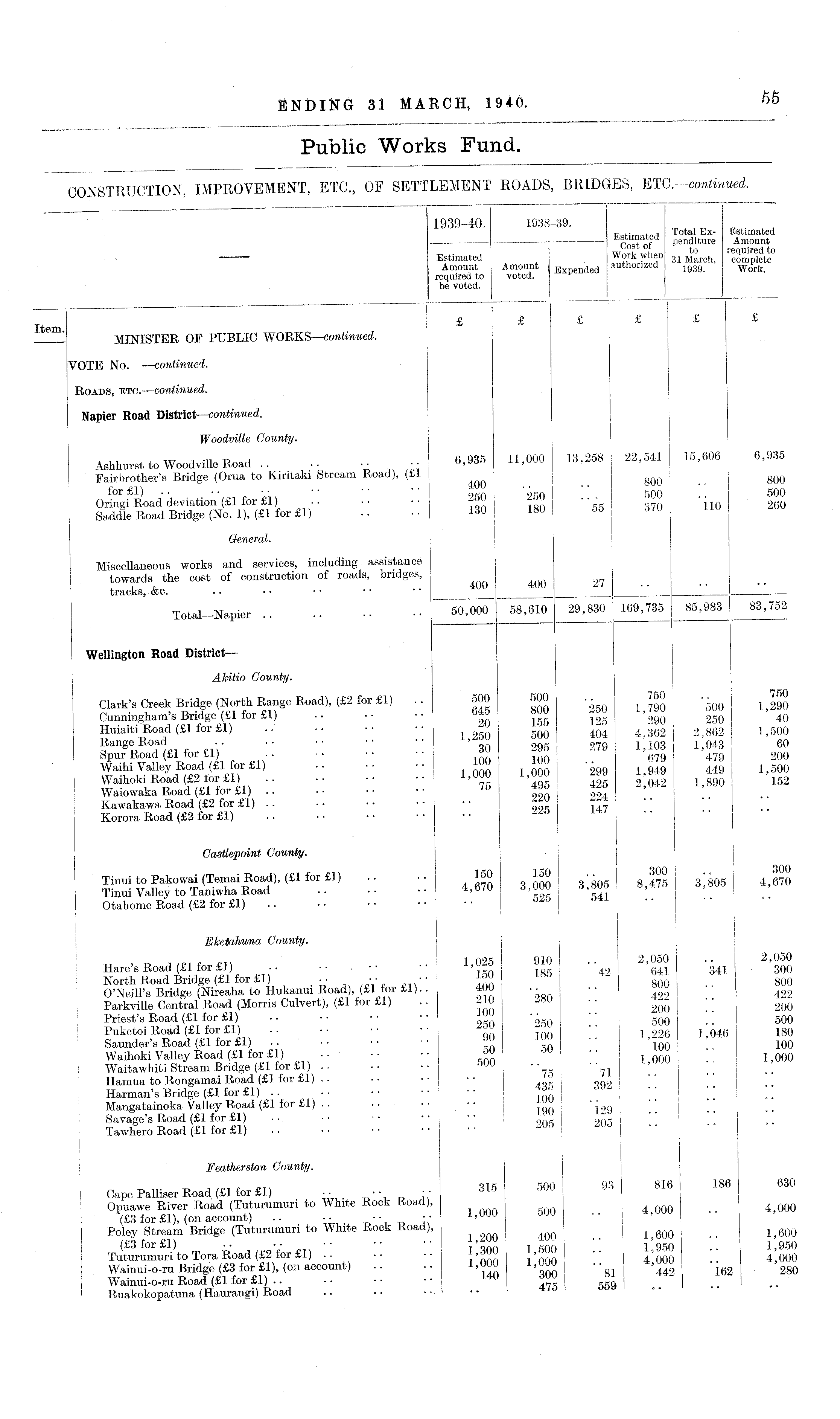 1939-40. 1938-39. Estimated Estimated Estimated Work when „ £ rch , Amount Amount Bxpen( i ed authorized 1939 Wor^ required to voted. be voted. Item £ £ £ £ £ £ 6m ' MINISTER OF PUBLIC WORKS —continued. VOTE No. —continued. Roads, etc .-—continued. Napier Road District—continued. Woodville County. itt i -n t> j 0 935 11 000 13,258 22,541 15,606 6,935 Ashhurst to Woodville Road .. •• n,uuu Fairbrother's Bridge (Orua to Kiritaki Stream Koad), (£1 for£ J) •' ii, " " " 1 950 '250 !! . 500 !! 500 Oringi Road deviation (£1 for £1) .. •• • ■ ll0 260 Saddle Road Bridge (No. 1), (£1 for £1) .. •• 130 180 o5 General. ! Miscellaneous works and services, including assistance towards the cost of construction of roads, bridges, tracks, 400 400 !I •• 11 Total—Napier 50,000 58,610 29,830 169,735 85,983 83,752 Wellington Road District— Akitio County. \ Clark's Creek Bridge (North Range Road), (£2 for £1) .. 500 500 .. 750 .. 750 Cunningham's Bridge (£1 for £1) 645 800 250 1,790 OUU Huiaiti Road (£1 for £1) .. •• 404 4 362 2(8 62 1,500 I Range Road 500 I Spur Road (£1 for £1) .. •• •• • ... 67g 479 200 Waihi Valley Road (£1 for £1) •• •• •• 1 000 299 1 949 449 1,500 Waihoki Road (£2 tor £1) 1.000 1,000 299 1,949 Waiowaka Road (£1 for £1) .. • • • • • • 22 4 ! Kawakawa Road (£2 for £1) .. • • • • • • • • Korora Road (£2 for £1) Castlepoint County. Tinui to Pakowai (Temai Road), (£1 for £1) •• 150 150 300 Tinui Valley to Tamwha Koad .. •• •• *' u,u ' 'k 41 Otahome Road (£2 for £1) Eketahuna, County. 1 910 . . 2,050 •. 2,050 Hare's Road (£1 for £1) •• •• •• •* ' * " 42 641 341 300 North Road Bridge (£1 for £1) •• •• 1 800 .. 800 O'Neill's Bridge (Nireaha to Hukanui Road) (£1 for £1).. 400 .. 422 Parkville Central Road (Morris Culvert), (£1 for £1) .. 210 -si ■ • 2Q0 Priest's Road (£1 for £1) .. •• ■■ '■ " ' 500 _ 500 Puketoi Road (£1 for £1) .. •• •• •• " ' ' i 226 1,046 180 Saunder's Road (£1 for £1) •• •• •• . 4 qq 100 Waihoki Valley Road (£1 for £1) •• •• •• , ()()0 j 000 Waitawhiti Stream Bridge (£1 for £1) .. •• •• 500 " ?5 " 7J Hamua to Rongamai Road (£1 for £1) . . •• •• •• p „ Harman's Bridge (£1 for £1) •• •• •• ■■ • •• ,i j Mangatainoka Valley Road (£1 for £1) .. • • • • • • j I ' , Savage's Road (£1 for £1) • • • • ■ • • • •" } 9n _ j | I .. Tawhero Road (£1 for £1) Featherston County. Cape Palliser Road (£1 for £1) •• 315 500 93 816 186 630 Opuawe River Road (Tuturumuri to White Rock Road), 4,000 (£3 for £1), (on account) .. •• .. D ■■ 00 oU0 " ' UU Poley Stream Bridge (Tuturumuri to White Rock Road), 4(J() _ 1>600 _ lj600 (£3 for £1) •• ** l' q aa i 1,950 •• 1,950 I Tuturumuri to Tora Road (£2 for £1) .. • • •• I'ono 1 000 .' 4 000 .. 4,000 Wainui-o-ru Bridge (£3 for £1), (on account) .. •• > » •• '442 162 280 Wainui-o-ru Road (£1 for £1) 140 | 1 .. ' Ruakokopatuna (Haurangi) Road