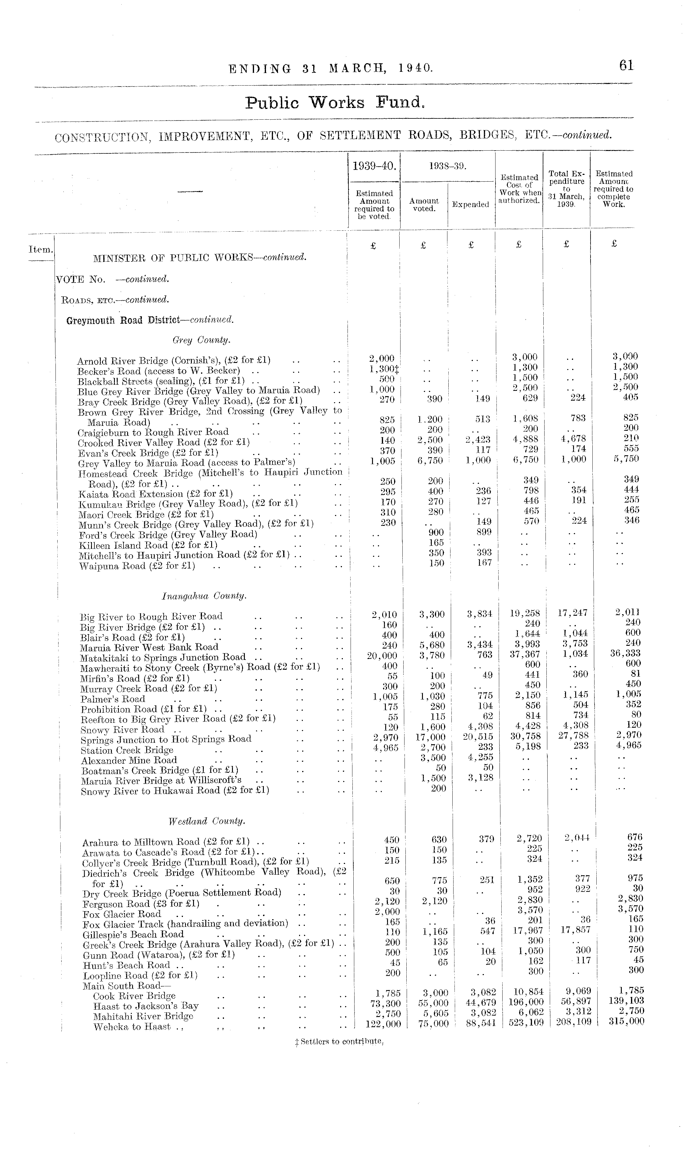 1939-40. 1938-39. HatimotPd Total Ex " Estimated C™ of P enditure Amount Estimated Work when 31 jj° roh 0 required 1 to A %2t Ex P ended authorued - 1939- ' Work, be voted. Item. £ £ I £ £ £ £ MINISTER OF PUBLIC WORKS —continued. VOTE No. —continued. Roads, eto. —continued. Greymonth Road District—continued. Grey County. Arnold River Bridge (Cornish's), (£2 for £1) .. .. 2,000 .. .. 3, 000 .. f'onn Becker's Road (access to W. Becker) .. .. .. 1,300t .. j . • 1,300 .. 1, 300 Blackball Streets (sealing), (£1 for £1) .. .. 500 .. .. 1,500 .. 1, 01 Blue Grey River Bridge (Grey Valley to Maruia Road) .. 1,000 .. . .. -,500 .. -,500 Bray Creek Bridge (Grey Valley Road), (£2 for £1) .. 270 390 14J j 6-J j —4 Brown Grey River Bridge, 2nd Crossing (Grey Valley to _ Maruia Road) .. 825 1 1.200 513: 1,608 783 825 Craigieburn to Rough River Road .. .. •• 200 -00 | Crooked River Valley Road (£2 for £1) .. .. ■ 140 2,500 2,423 | 4,888 4,678 210 Evan's Creek Bridge (£2 for £1) 370 390 ! 117 729 174 5oo Grey Valley to Maruia Road (access to Palmer's) .. 1,005 6,750 1,000 6,750 1,000 5,750 Homestead Creek Bridge (Mitchell's to Haupiri Junction I Road), (£2 for £1) .. .. .. .. .. 250 200 349 349 Kaiata Road Extension (£2 for £1) 295 400 236 /98 354 444 I Kumukau Bridge (Grey Valley Road), (£2 for £1) .. 170 270 127 ; 446 191 255 Maori Creek Bridge (£2 for £1) 310 280 465 .. 4b5 Muim's Creek Bridge (Grey Valley Road), (£2 for £1) 230 .. 149 570 224 346 Ford's Creek Bridge (Grey Valley Road) .. .. j • • 900 899 Killeen Island Road (£2 for £1) .. • • • • ■ • 165 . • • ■ 1 Mitchell's to Haupiri Junction Road (£2 for £1) .. .. .. 350 : 393 j Waipuna Road (£2 for £1) .. -. •• •• 150 167 .. | I 1 ' i Inangahua County. Big River to Rough River Road .. .. .. 2,010 3,300 3,834 \ 17,247 j Big River Bridge (£2 for £1) 160 .. .. 240 | j 240 Blair's Road (£2 for £1) 400 400 .. 1,644 j 1,044 600 Maruia River West Bank Road .. .. .. 240 5,680 3,434 3,993 Matakitaki to Springs Junction Road .. .. .. 20,000 3,780 763 1,034 Mawheraiti to Stony Creek (Byrne's) Road (£2 for £1) .. 400 .. .. 600 .. 600 Mirfin's Road (£2 for £1) 55 100 49 441 360 81 Murray Creek Road (£2 for £1) 300 200 .. 450 .. 450 Palmer's Road 1,005 1,030 775 2,150 1,145 1.005 Prohibition Road (£1 for £1) .. .. •• •• 175 280 104 856 504 352 Reefton to Big Grey River Road (£2 for £1) .. .. 55 115 62 814 73 j Snnwv River Road . .. . . •• 120 1,600 4,308 4,428 4,308 120 Springs Junction to Hot Springs Road .. .. 2,970 17,000 20,515 3 0>758 27 >788 2,970 Station Creek Bridge | 4,965 2,700 1 233 5,198 233 4,965 Alexander Mine Road .. .. • • • • • • j 3,500 4,255 Boatman's Creek Bridge (£1 for £1) .. .. .. • • 50 50 Maruia River Bridge at Williscroft's .. .. .. .. j 1,500 3,128 Snowy River to Hukawai Road (£2 for £1) .. .. • . I 200 . . • • • • Westland County. Arahura to Milltown Road (£2 for £1) .. .. .. 450 630 379 j 2,044 676 Arawata to Cascade's Road (£2 for £1).. .. .. 150 j 150 .. . 2-5 . . Collyer's Creek Bridge (Turnbull Road), (£2 for £1) .. 215 135 .. j 324 Diedrich's Creek Bridge (Whitcombe Valley Road), (£2 for £1) .. •• •• •• •• 650 775 j 251 j l,ooz ot / vto Dry Creek Bridge (Poerua Settlement Road) .. .. 30 30 .. | 922 30 :. :: :: .. S 2 : 120 i .. ; :: I !:Po Fox Glacier Track (handrailing and deviation) .. .. 165 36 i 201 36 10o Gillespie's Beach Road •• 110 1,165 547 17,967 17,80/ 110 Greek's Creek Bridge (Arahura Valley Road), (£2 for £1) .. 200 135 .. 300 .. Gunn Road (Wataroa), (£2 for £1) 500 105 104 1,050 300 750 Hunt's Beach Road 45 65; 20 162 117 45 Loopline Road (£2 for £1) 200 .. .. 300 .. OOU M .. .. 1,785 3,000 3,082 10,854 9,069 1,785 HaasttoJafkson'sBay " 73,300 55,000; 44,679 196,000 56,897 139,103 Mahitahi River Bridge •• •• 2,750 5,605 : 3,082 6,06- 3,312 -,750 Weheka to Haast . 122,000 75,000 88,541 523,109 208,109 315,000 J Settlers to contribute,