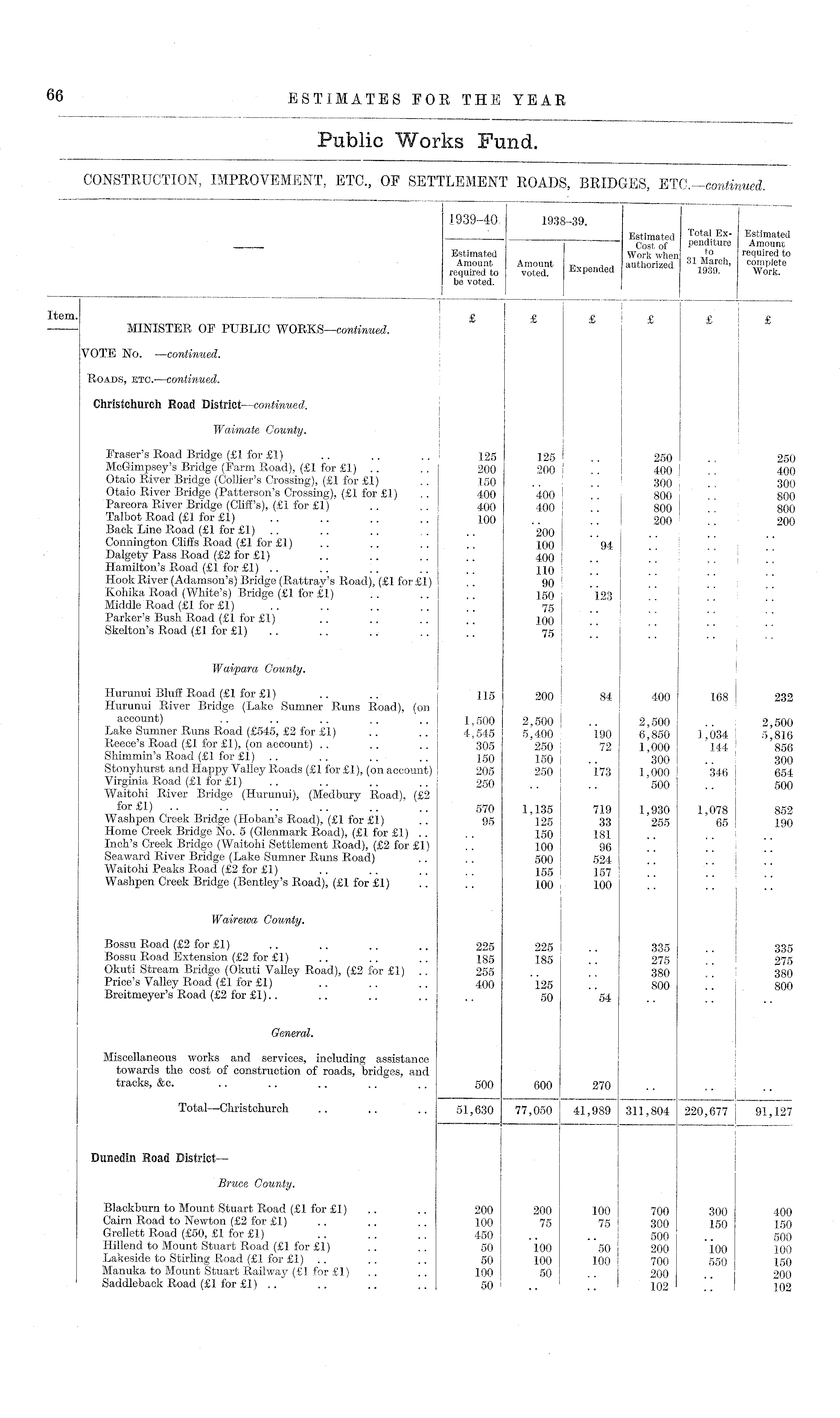 i 939-40 1938-39. 1 Estimated Tot S' :Ex ' Estimated Cost of penditure Amount Estimated Work when '° . required to Amount Amount ,,, , . authorized March, complete required to voted. Expended "uuionzea 193g Worfc be voted. _ i Item. £ £ £ £ £ £ MINISTER OF PUBLIC WORKS—continued. VOTE No. —continued. Roads, etc. —continued. Christchurch Road District —continued. Waimate County. Eraser's Road Bridge (£1 for £1) .. .. .. 125 125 .. 250 250 McGimpsey's Bridge (Farm Road), (£1 for £1) .. .. 200 200 ' . . 400 ! 400 Otaio River Bridge (Collier's Crossing), (£1 for £1) .. 150 .. .. 300 300 Otaio River Bridge (Patterson's Crossing), (£1 for £1) .. 400 400 .. 800 800 Pareora River Bridge (Cliff's), (£1 for £1) .. .. 400 400 1! 800 800 Talbot Road (£1 for £1) .. .. .. .. 100 .. .. 200 ' ]! 200 Back Line Road (£1 for £1) .. .. .. .. .. 200 Connington Cliffs Road (£1 for £1) .. .. .. .. 100 94 Dalgety Pass Road (£2 for £1) ,. .. .. .. 400 Hamilton's Road (£1 for £1) .. .. .. .. H0 Hook River (Adamson's) Bridge (Rattray's Road), (£1 for £1) .. 90 Kohika Road (White's) Bridge (£1 for £1) .. .. .. 150 123 Middle Road (£1 for £1) .. .. .. .. 75 Parker's Bush Road (£1 for £1) .. .. .. 100 Skelton's Road (£1 for £1) .. .. .. .. 75 Waipara County. Hurunui Bluff Road (£1 for £1) .. .. 115 200 84 400 168! 232 Hurunui River Bridge (Lake Sumner Runs Road), (on account) .. .. .. .. .. 1,500 2,500 .. 2,500 .. 2,500 Lake Sumner Runs Road (£545, £2 for £1) .. .. 4,545 5,400 190 6,850 1,034 5 816 Reece's Road (£1 for £1), (on account) .. .. .. 305 '250 72 i'oOO "! 11 '856 Shimmin's Road (£1 for £1) .. .. .. .. 150 150 .. 300 300 Stonyhurst and Happy Valley Roads (£1 for £1), (on account) 205 250 i73 1 000 346 654 Virginia Road (£1 for £1) .. .. .. .. 250 .. .. '500 . . 500 Waitohi River Bridge (Hurunui), (Medbury Road), (£2 „ TT f °r £1 ) „ • • , „ •• •• •• 570 1,135 719 1,930 1,078 852 Washpen Creek Bridge (Hoban's Road), (£1 for £1) .. 95 125 33 255 65 190 Home Creek Bridge No. 5 (Glenmark Road), (£1 for £1) .. .. 150 181 Inch's Creek Bridge (Waitohi Settlement Road), (£2 for £1) .. 100 96 " !! Seaward River Bridge (Lake Sumner Runs Road) . . . . 500 524 Waitohi Peaks Road (£2 for £1) .. .. .. , . igg I57 Washpen Creek Bridge (Bentley's Road), (£1 for £1) .. .. 100 100 Wairewa County. Bossu R.oad (£2 for £1) .. .. .. .. 225 225 .. 335 .. 335 Bossu Road Extension (£2 for £1) .. .. .. 185 Igg 275 275 Okuti Stream Bridge (Okuti Valley Road), (£2 for £1) .. 255 .. .. 380 380 Price's Valley Road (£1 for £1) .. .. .. 400 i25 " 800 !. 800 Breitmeyer's Road (£2 for £1).. .. .. .. .. 50 54 General. Miscellaneous works and services, including assistance towards the cost of construction of roads, bridges, and tracks, &c. .. .. .. .. .. 500 600 270 Total—Christchurch .. .. .. 51,630 77,050 41,989 311,804 220,677 91,127 Dunedin Road District — Bruce County. Blackburn to Mount Stuart Road (£1 for £1) .. .. 200 200 100 700 300 400 Cairn Road to Newton (£2 for £1) .. .. .. 100 75 75 300 150 150 Grellett Road (£50, £1 for £1) .. .. .. 450 .. .. 500 .. 500 Hillend to Mount Stuart Road (£1 for £1) .. .. 50 100 50 200 100 100 Lakeside to Stirling Road (£1 for £1) .. .. .. 50 100 100 700 550 150 Manuka to Mount Stuart Railway (£1 for £1) .. .. 100 50 .. 200 .. 200 Saddleback Road (£1 for £1) .. .. .. .. 50 .. .. 102 . ! 102