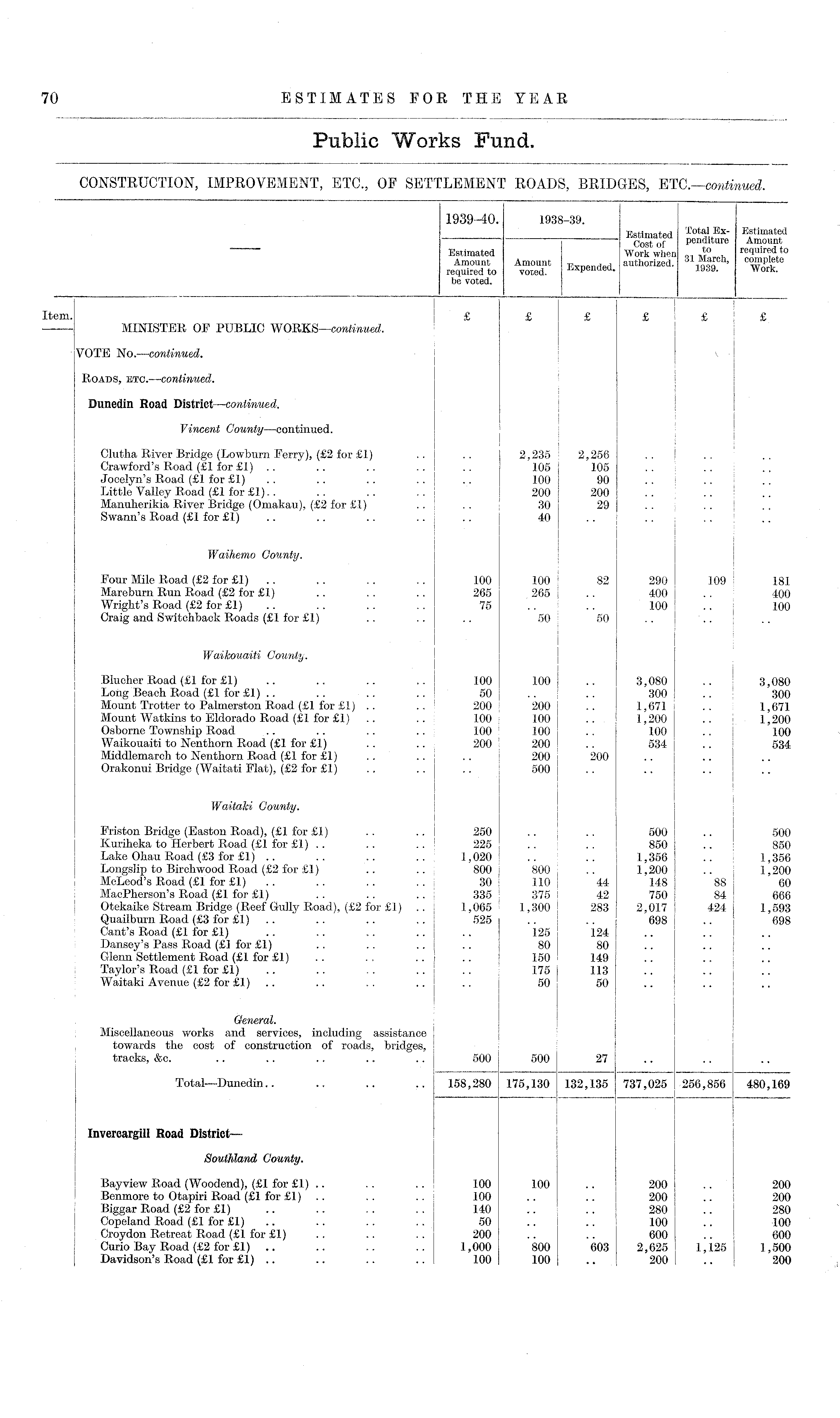 1939-40. 1938-39. Estimnted TotaI Ex " Estimated _ estimated penditllI . e Amount Estimated Work when required to Amount Amount ExDended authorized. ' Stfnrk required to voted. expended. 1939. Work. be voted. Item £ £ ! £ £ £ £ — MINISTER OF PUBLIC WORKS—continued. VOTE No. —continued. Roads, etc. —continued. Dunedin Road District—continued. Vincent County—continued. Clutha River Bridge (Lowburn Ferry), (£2 for £1) .. .. 2,235 2,256 .. ! Crawford's Road (£1 for £1) .. .. .. .. .. 105 105 Jocelyn's Road (£1 for £1) . . .. . . .. .. 100 90 Little Valley Road (£1 for £1).. .. .. .. 200 200 Manuherikia River Bridge (Omakau), (£2 for £1) .. .. 30 29 Swann's Road (£1 for £1) .. .. .. .. .. 40 Waihemo County. Four Mile Road (£2 for £1) .. . . . . .. 100 100 82 290 109 181 Mareburn Run Road (£2 for £1) .. . . .. 265 265 .. 400 .. 400 Wright's Road (£2 for £1) .. . . . . . . 75 .. .. 100 .. 100 Craig and Switchback Roads (£1 for £1) .. .. .. 50 50 i Waikouaiti County. Blucher Road (£1 for £1) .. .. .. .. 100 100 .. 3,080 .. 3,080 Long Beach Road (£1 for £1) .. . . .. .. 50 .. .. 300 .. 300 Mount Trotter to Palmerston Road (£1 for £1) .. .. 200 200 .. 1,671 .. 1,671 Mount Watkins to Eldorado Road (£1 for £1) .. .. 100 100 .. 1,200 .. 1,200 Osborne Township Road .. .. .. .. 100 100 .. 100 .. 100 Waikouaiti to Nenthorn Road (£1 for £1) .. .. 200 200 .. 534 .. 534 Middlemarch to Nenthorn Road (£1 for £1) .. .. .. 200 200 Orakonui Bridge (Waitati Flat), (£2 for £1) .. .. .. 500 Waitaki County. Friston Bridge (Easton Road), (£1 for £1) .. .. 250 .. .. 500 .. 500 Kuriheka to Herbert Road (£1 for £1) .. .. .. 225 .. .. 850 .. 850 Lake Ohau Road (£3 for £1) .. .. .. .. 1,020 .. .. 1,356 .. ; 1,356 Longsiip to Birchwood Road (£2 for £1) .. .. 800 800 .. 1,200 .. ; 1,200 McLeod's Road (£1 for £1) .. .. .. .. j 30 110 ' 44 148 88 j 60 MacPherson's Road (£1 for £1) .. .. ... 335 375 42 750 84! 666 Otekaike Stream Bridge (Reef Gully Road), (£2 for £1) .. 1,065 1,300 : 283 2,017 424 j 1,593 Quailburn Road (£3 for £1) .. .. .. 525 .. : .. 698 .. ! 698 Cant's Road (£1 for £1) .. .. .. .. .. 125 ! 124 .. .. I Dansey's Pass Road (£1 for £1) . . .. .. .. 80 80 Glenn Settlement Road (£1 for £1) .. .. .. .. 150 : 149 Taylor's Road (£1 for £1) .. .. . . . . .. 175 113 Waitaki Avenue (£2 for £1) .. .. . . .. .. 50 50 General. Miscellaneous works and services, including assistance towards the cost of construction of roads, bridges, tracks, &c. .. .. .. .. .. 500 500 27 Total—Dunedin.. .. .. .. 158,280 175,130 132,135 737,025 256,856 480,169 Invereargill Road District— Southland County. Bayview Road (Woodend), (£1 for £1) .. .. .. 100 100 .. 200 .. 200 Benmore to Otapiri Road (£1 for £1) .. .. .. 100 .. .. 200 .. 200 Biggar Road (£2 for £1) .. .. . . . . 140 .. .. 280 .. 280 Copeland Road (£1 for £1) .. .. . . 50 .. .. 100 .. 100 Croydon Retreat Road (£1 for £1) . . .. . . 200 .. .. 600 .. 600 Curio Bay Road (£2 for £1) .. .. .. .. 1,000 800 603 2,625 1,125 1,500 Davidson's Road (£1 for £1) .. .. .. .. 100 100 .. 200 .. 200