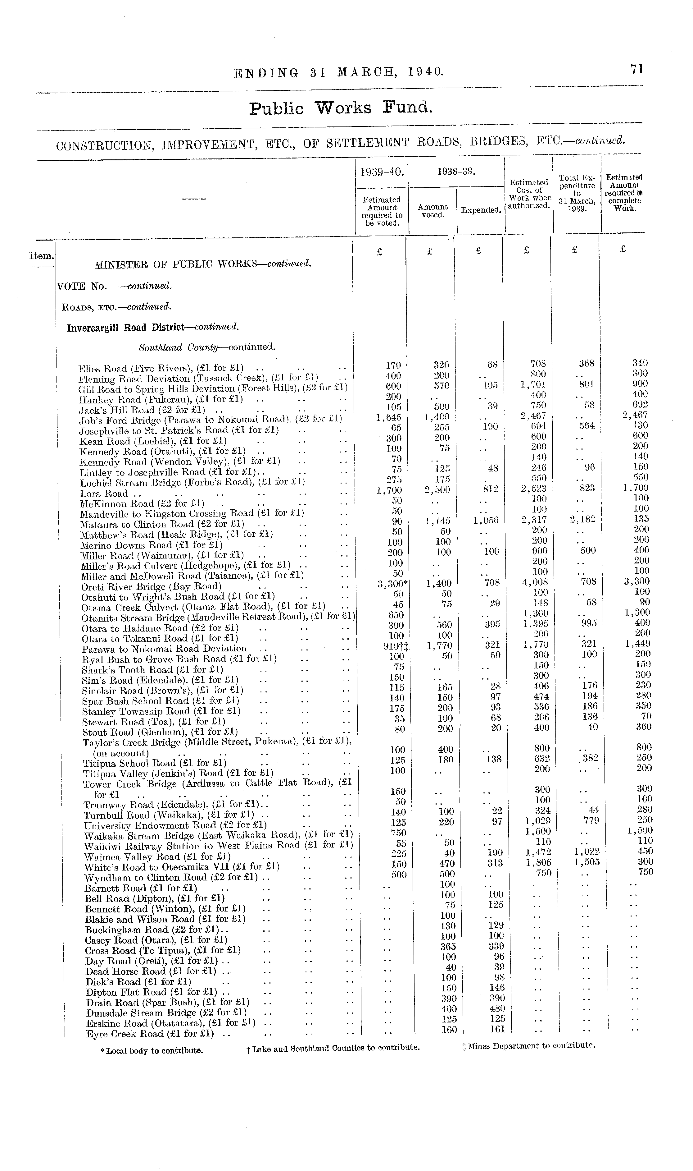 1939-40. 1938-39. TotaiEx . Estimate(i - ■c'St'mateQ p6n( iiture Amount vOSt 01 rpnnirpd fit Estimated Work when 81 Mareh> complete Amount Amount Expended. aut " orized - 1939. Work, required to voted. be voted. Item. £ £ £ £ £ £ MINISTER OF PUBLIC WORKS—continued. VOTE No. —continued. Roads, etc.—continued. Invercargill Road District —continued. Southland County—continued. Elles Road (Five Rivers), (£1 for £1) .. .. 1™ 320 68 708 368 340 Fleming Road Deviation (Tussock Creek), (£1 for £1) .. 400 -00 .. •• Gill Road to Spring Hills Deviation (Forest Hills), (£2 for £1) 600 570 105 1,701 801 J00 Hankey Road (Pukerau), (£1 for £i) 200 400 400 Jack, s Hill Road (£2 for £1) .. •• •• •• . A ,nrj 9 a a n Job's Ford Bridge (Parawa to Nokomai Road), (£2 for £1) 1,645 1,400 .. -,467 .. -,4b/ JosephviUe to St Patrick's Road (£1 for £1) .. .. 65 255 190 694 564 130 Kean Road (Loehiel), (£1 for £1) 300 200 .. b00 .. 600 Kennedy Road (Otahuti), (£1 for £1) .. .. 100 75 .. -00 .. -0U Kennedy Road (Wendon Valley), (£1 for £1) .. ■ ■ 70 .. .. •• Lintley to JosephviUe Road (£1 for £1) j 75 125 48 246 96 150 Loehiel Stream Bridge (Forbe's Road), (£1 for £1) .. 275 175 .Lora Jrvoaci .. •• •• •• • • *■ ' ' i /-\r» McKinnon Road (£2 for £1) 50 .. .. 100 ... ±ou MandeviEe to Kingston Crossing Road (£1 for £1) .. 50 .. •• 0 Mataura to Clinton Road (£2 for £1) 90 1,145 1,056 2,317 2,18- 135 ! Matthew's Road (Heale Ridge), (£1 for £1) .. •• 50 60 •• Merino Downs Road (£1 for £1) .. •• 100 100 .. - •• Miller Road (Waimumu), (£1 for £1) .. .. •• -00 100 100 90 Miller's Road Culvert (Hedgehope), (£1 for £1) .. .. 100 .. -00 - Miller and McDowell Road (Taiamoa), (£1 for £1) .. o0 •• •• . ixx - A ft8 o orin | Oreti River Bridge (Bay Road) 3,300* 1,400 708 4,008 708 3,300 Otahuti to Wright's Bush Road (£1 for £1) .. 50 50 .. J-01 .. Otama Creek Culvert (Otama Flat Road), (£1 for £1) 45 75 29 148 o Otamita Stream Bridge (Mandeville Retreat Road), (£1 for £1) 650 .. • ■ ' ' „ ' f f Otara to Haldane Rtxid (£2 for £1) 300 560 395 1,395 995 400 Otara to Tokanui Road (£1 for £1) .. .. •• ,100 100 .. - •• Parawa to Nokomai Road Deviation .. .. •• 9101J > 770 3 > > Ryal Bush to Grove Bush Road (£1 for £1) .. .. 100 50 50 300 100 -00 Shark's Tooth Road (£1 for £1) 75 .. .. 150 .. iou Sim's Road (Edendale), (£1 for £1) 150 .. .. 300 .. dou Sinclair Road (Brown's), (£1 for £1) 115 165 28 406 176 230 Spar Bush School Road (£1 for £1) .. .. 140 150 97 474 194 -80 Stanley Township Road £1 for £1) 175 200 93 536 86 350 Stewart Road (Toa), (£1 for £1) 35 100 68 206 13b 7U Stout Road (Glenham), (£1 for £1) 80 200 20 400 40 360 Taylor's Creek Bridge (Middle Street, Pukerau), (£1 for £1), Titi°pua°Schooi Road (£1 for £1) 125 180 i38 632 382 250 Titipua Valley (Jenkin's) Road (£1 for £1) .. •• 100 .. •• -00 Tower Creek Bridge (Ardlussa to Cattle Flat Road), (£1 for £1 .. . ■ ■ ■ • ■ • • I 00 • • • • 300 .. wu Tramway Road (Edendale), (£1 for £1).. .. •• 50 .. .. 100 .. 100 Turnbull Road (Waikaka), (£1 for £1) 40 100 22 324 44 280 University Endowment Road (£2 for £1) .. •• 125 220 9 1 i kao Waikaka Stream Bridge (East Waikaka Road), (£1 for £1) 750 .. .. 1,500 .. l,oUU Waikiwi Railway Station to West Plains Road (£1 for £1) 55 50 .. 110 .. iiu Waimea Valley Road (£1 for £1) 225 40 190 1,472 1,022 450 White's Road to Oteramika VII (£1 for £1) .. .. 150 470 313 1,805 1,505 300 Wyndham to Clinton Road (£2 for £1) .. ■ • • • 500 500 Barnett Road (£1 for £1) .. •• ■■ 100 .. Bell Road (Dipton), (£1 for £1) .. • ■ • • ■ ■ 100 100 Bennett Road (Winton), (£1 for £1) .. ■■ ■■ 75 1-5 Blakie and Wilson Road (£1 for £1) .. • • ■ • • • 100 ■ • Buckingham Road (£2 for £1).. .. •• •• 130 Casey Road (Otara), (£1 for £1) 100 100 Cross Road (Te Tipua), (£1 for £1) 339 j Day Road (Oreti), (£1 for £1) .. 100 9b Dead Horse Road (£1 for £1) .. .. •• •• ■■ 3J Dick's Road (£1 for £1) .. 100 »» •• .. .. Dipton Flat Road (£1 for £1) .. .. • • • • • • 150 14b Drain Road (Spar Bush), (£1 for £1) .. ■ ■ • • • • 390 3J Dunsdale Stream Bridge (£2 for £1) .. •• •• •• Erskine Road (Otatatara), (£1 for £1) .. .. •• 1"® " Eyre Creek Road (£1 for £1) .. •• •• •• 1°° 1 lbl 1 " " * Local body to contribute. t Lake and Southland Counties to contribute. t Mines Department to contribute.