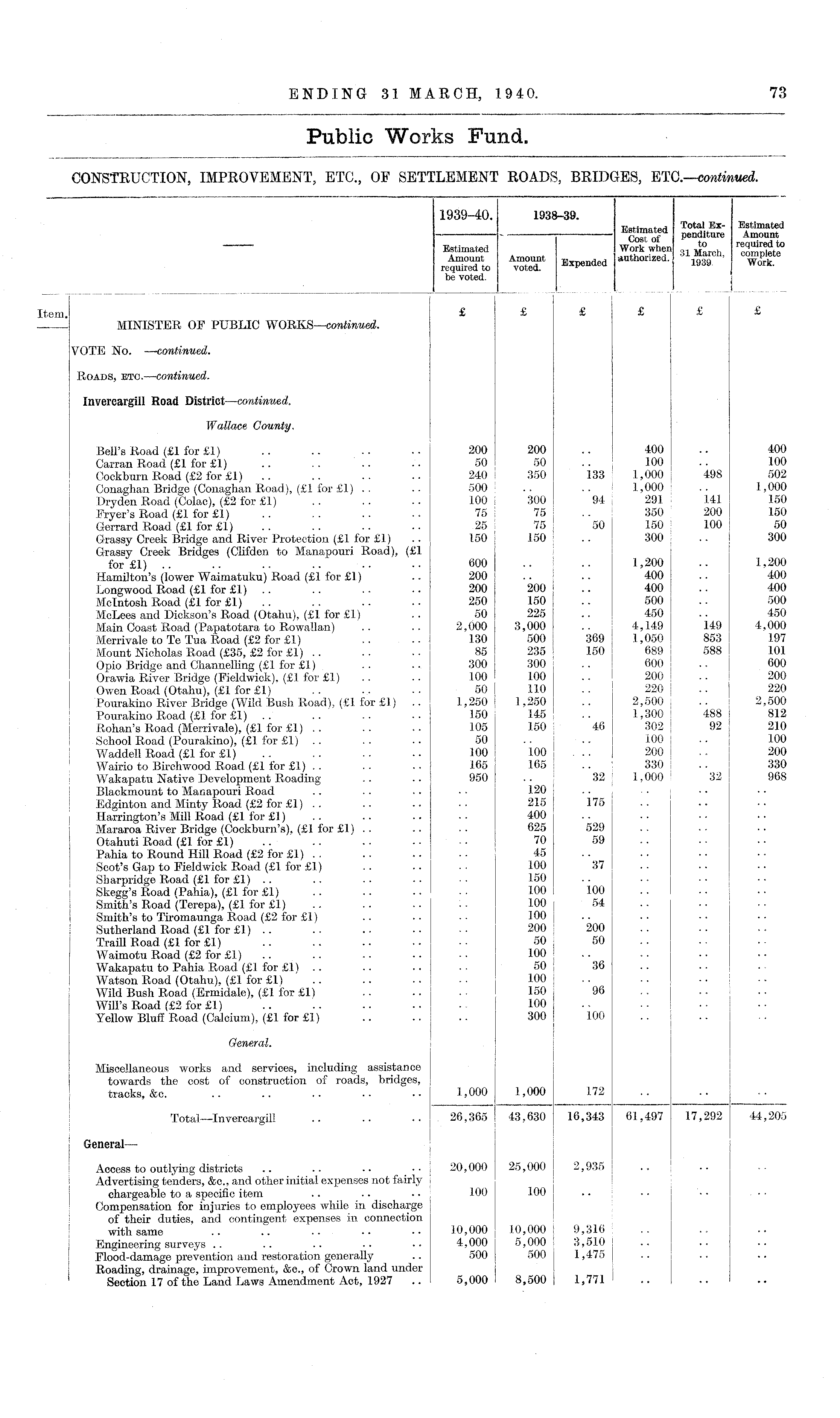 1939-40. 1938-39. Eatimnteii Total Ex " Estimated of Penditure Amount Estimated Work when 31 £ rch 'compete' Amount Amount Ext)ended authorized. dl S rch ' °w or k required to voted. expended ia<sa work. be voted. Item. £ £ £ £ £ £ MINISTER OF PUBLIC WORKS —continued. VOTE No. —continued. Roads, etc. —-continued. Invercargill Road District —continued. Wallace County. Bell's Road (£1 for £1) .. .. .. .. 200 200 .. 400 .. 400 Carran Road (£1 for £1) .. .. .. .. 50 50 .. 100 .. 100 Cockburn Road (£2 for £1) .. .. .. .. 240 350 133 1,000 498 502 Conaghan Bridge (Conaghan Road), (£1 for £1) .. .. 500 .. .. 1,000 .. 1,000 Dryden Road (Colac), (£2 for £1) .. .. .. 100 300 94 291 141 150 Fryer's Road (£1 for £1) .. .. .. .. 75 75 .. 350 200 150 Gerrard Road (£1 for £1) .. .. .. 25 75 50 150 100 50 Grassy Creek Bridge and River Protection (£1 for £1) .. 150 150 .. 300 .. 300 Grassy Creek Bridges (Clifden to Manapouri Road), (£1 for £1) 600 .. .. 1,200 .. 1,200 Hamilton's (lower Waimatuku) Road (£1 for £1) ■. 200 .. .. 400 .. 400 Longwood Road (£1 for £1) .. .. .. •• 200 200 .. 400 .. 400 Mcintosh Road (£1 for £1) .. .. .. •• 250 150 .. 500 .. 500 McLees and Dickson's Road (Otahu), (£1 for £1) .. 50 225 .. 450 .. 450 Main Coast Road (Papatotara to Rowallan) .. .. 2,000 3,000 .. 4,149 149 4,000 Merrivale to Te Tua Road (£2 for £1) .. •• 130 500 369 1,050 853 197 Mount Nicholas Road (£35, £2 for £1) .. .. .. 85 235 150 689 588 101 Opio Bridge and Channelling (£1 for £1) . . .. 300 300 .. 600 .. 600 Orawia River Bridge (Fieldwick), (£1 for £1) .. .. 100 100 .. 200 .. 200 Owen Road (Otahu), (£1 for £1) .. •• 50 110 .. 220 .. 220 Pourakino River Bridge (Wild Bush Road), (£1 for £1) .. 1,250 1,250 .. 2,500 .. 2,500 Pourakino Road (£1 for £1) .. .. •• 150 145 .. 1,300 488 812 Rohan's Road (Merrivale), (£1 for £1) .. .. .. 105 150 46 302 92 210 School Road (Pourakino), (£1 for £1) .. .. .. 50 .. .. 100 .. 100 Waddell Road (£1 for £1) .. .. .. .. 100 100 200 .. 200 Wairio to Birchwood Road (£1 for £1) .. . • •• 165 165 .. 330 .. 330 Wakapatu Native Development Roading .. 950 .. 32 1,000 32 968 Blackmount to Manapouri Road .. .. .. •. 120 Edginton and Minty Road (£2 for £1) .. .. .. ■■ 215 175 Harrington's Mill Road (£1 for £1) . . .. • • ■ • 400 Mararoa River Bridge (Cockburn's), (£1 for £1) .. .. .. 625 529 Otahuti Road (£1 for £1) .. .. .. .. 70 59 Pahia to Round Hill Road (£2 for £1) .. .. . • ■ ■ 45 Scot's Gap to Fieldwick Road (£1 for £1) .. ■■ 100 37 Sharpridge Road (£1 for £1) .. .. ■■ •• •• 150 Skegg's Road (Pahia), (£1 for £1) .. .. •• 100 100 | Smith's Road (Terepa), (£1 for £1) .. .. ■ ■ 100 54 I Smith's to Tiromaunga Road (£2 for £1) .. •. • ■ 100 I Sutherland Road (£1 for £1) .. . . . • • ■ ■ ■ 200 200 Traill Road (£1 for £1) .. .. .. .. • • 50 50 Waimotu Road (£2 for £1) .. .. ■ • • • • • 100 Wakapatu to Pahia Road (£1 for £1) .. •• •• •• 50 36 Watson Road (Otahu), (£1 for £1) .. .. •. - • 100 Wild Bush Road (Ermidale), (£1 for £1) .. .. . . 150 96 Will's Road (£2 for £1) .. .. .. .. ■- 100 Yellow Bluff Road (Calcium), (£1 for £1) .. .. .. 300 100 General. Miscellaneous works and services, including assistance towards the cost of construction of roads, bridges, tracks, &c. .. .. ■■ •• 1,000 1,000 172 Total—Invercargill .. .. .. 26,365 43,630 16,343 61,497 17,292 44,205 GeneralAccess to outlying districts .. .. •• 20,000 25,000 2,935 | Advertising tenders, &c., and other initial expenses not fairly chargeable to a specific item .. .. .. 100 100 Compensation for injuries to employees while in discharge of their duties, and contingent expenses in connection with same .. .. .. •• •• 10,000 10,000 9,316 | Engineering surveys .. .. .. •• •• 4,000 5,000 3,510 | Flood-damage prevention and restoration generally .. 500 500 1,475 | j Roading, drainage, improvement, &e., of Crown land under Section 17 of the Land Laws Amendment Act, 1927 .. 5,000 8,500 1,771 :