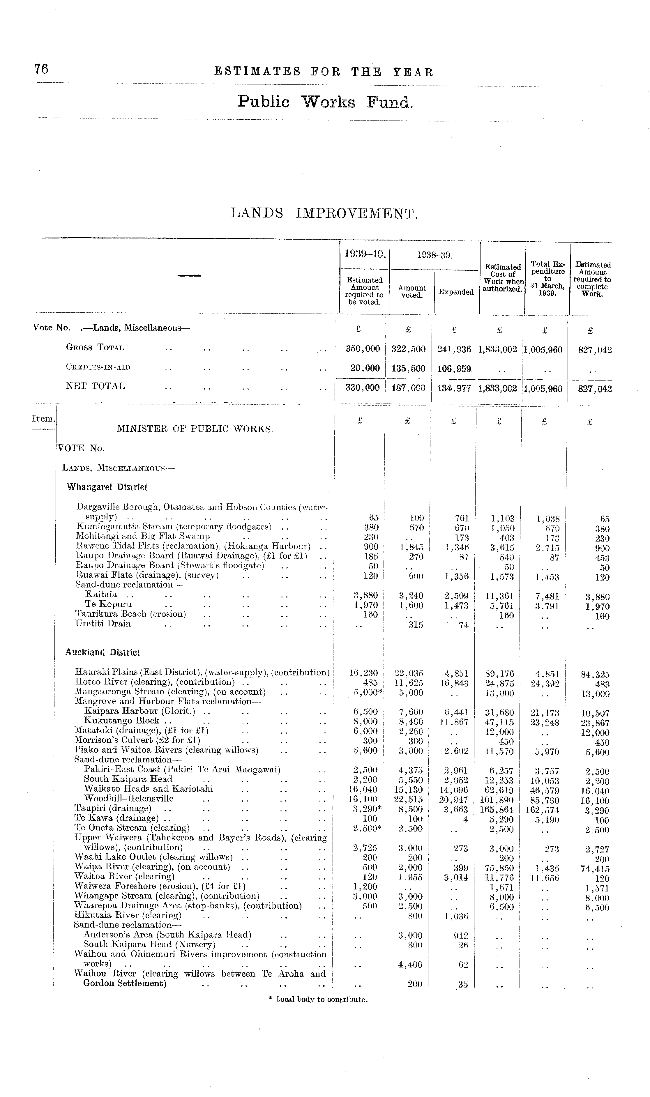—— j * - - — 1939-40. i938-39. Estimated T °talEx- Estimated _ Cost of penditure Amount Estimated Work when D , . required to Amount Amount Ed1 authorized. 31 1 oJJ ch ' complete required to voted. Expended 1939. Work, be voted. Vote No. . —Lands, Miscellaneous— £ £ £ £ £ £ Gkoss Total .. .. .. .. .. 350,000 j 322,500 241,936 1,833,002 1,005,960 827,042 Credits-IN-AID .. .. .. .. .. 20.000 | 135,500 106,959. NET TOTAL .. .. .. .. .. 330,000 187,000 134,977 1,833.002 1,005,960 827,042 Item. £ £ £ £ £ £ —— MINISTER OF PUBLIC WORKS. VOTE No. Lands, Mtscjsli.akeous— Whangarei District — Dargavilie Borough, Otamatea and Hobson Counties (watersupply) .. .. .. .. .. .. 65' 100 761 1,103 1,038 65 Kumingamatia Stream (temporary floodgates) .. .. 380 , 670 670 1,050 670 380 Mohitangi and Big Flat Swamp .. .. . . 230 i .. , 173 403 173 230 Rawene Tidal Flats (reclamation), (Hokianga Harbour) .. 900 1,845 I 1.346 3,615 2,715 900 Raupo Drainage Board (Ruawai Drainage), (£1 for £1) .. 185 270 87 540 87 453 Raupo Drainage Board (Stewart's floodgate) .. .. 50 . . .. 50 .. 50 Ruawai Flats (drainage), (survey) .. .. .. 120 : 600 1,356 1,573 1,453 120 Sand-dune reclamation— Kaitaia .. .. .. .. .. .. 3,880 I 3,240 2,509 11,361 7,481 3,880 TeKopuru .. .. .. .. .. 1,970; 1,600 1,473 5,761 3,791 1,970 Taurikura Beach (erosion) .. .. .. .. 160 j .. .. 160 .. 160 Uretiti Drain .. .. .. .. . . .. 315 74 Auckland District— HaurakiPlains (East District), (water-supply), (contribution) I 16,230 22,035 4,851 89,176 4,851 84 325 Hoteo River (clearing), (contribution) .. .. .. 1 485 ' 11,625 16,843 24,875 24 '.392 '483 Mangaoronga Stream (clearing), (on account) .. .. 5,000* 5,000 .. 13,000 .. 13,000 Mangrove and Harbour Flats reclamation — Kaipara Harbour (Glorit.) .. .. .. .. 6,500 7,600 6,441 31,680 21,173 10,507 Kukutango Block .. .. .. .. .. 8,000 8,400 1.1,867 47,115 23,248 23,867 Matatoki (drainage), (£1 for £1) .. .. .. 6,000 2,250 .. 12,000 .. 12,000 Morrison's Culvert (£2 for £1) .. .. .. 300 300 .. 450 .. '45O Piako and Waitoa Rivers (clearing willows) .. .. 5,600 3,000 2,602 11,570 5,970 5,600 Sand-dune reclamation — Pakiri-East Coast (Pakiri-Te Arai-Mangawai) .. 2,500 4,375 2,961 6,257 3,757 2,500 South Kaipara Head .. .. .. .. 2,200 5,550 2,052 12,253 10,053 2^200 Waikato Heads and Kariotahi .. .. .. 16,040 15,130 14,096 62,619 46,579 16,040 W oodhill-Helensville .. .. .. .. 16,100 22,515 20,947 101,890 85,790 16'l00 Taupiri (drainage) .. .. .. .. .. 3,290* 8,500 3,663 165,864 162,574 3,290 Te Kawa (drainage) .. .. .. .. .. 100 100 I 4 5,290 5,190 100 Te Oneta Stream (clearing) .. .. .. .. 2,500* 2,500 ! .. 2,500 .. 2,500 Upper Waiwera (Tahekeroa and Bayer's Roads), (clearing willows), (contribution) .. .. .. .. 2,725 3,000 j 273 3,000 273 2,727 Waahi Lake Outlet (clearing willows) .. .. . . 200 200 1 .. 200 .. '200 Waipa River (clearing), (on account) .. .. .. 500 2,000 399 75,850 1,435 74,415 Waitoa River (clearing) .. .. .. .. 120 1,955 3,014 11,776 11,656 'l20 Waiwera Foreshore (erosion), (£4 for £1) .. .. 1,200 .. .. 1,571 .. 1 571 Whangape Stream (clearing), (contribution) .. .. 3,000 3,000 .. 8,000 .. 8'000 Wharepoa Drainage Area (stop-banks), (contribution) .. 500 2,500 j .. 6,500 .. 6 500 Hikutaia River (clearing) .. .. .. .. .. 800 1,036 Sand-dune reclamation — Anderson's Area (South Kaipara Head) .. .. .. 3,000 912 South Kaipara Head (Nursery) .. .. .. . . 800 ! 26 Waihou and Ohinemuri Rivers improvement (construction I works) .. .. .. .. .. .. .. 4,400 62 Waihou River (clearing willows between Te Aroha and Gordon Settlement) .. .. .. .. .. 200 35 * Local body to contribute.