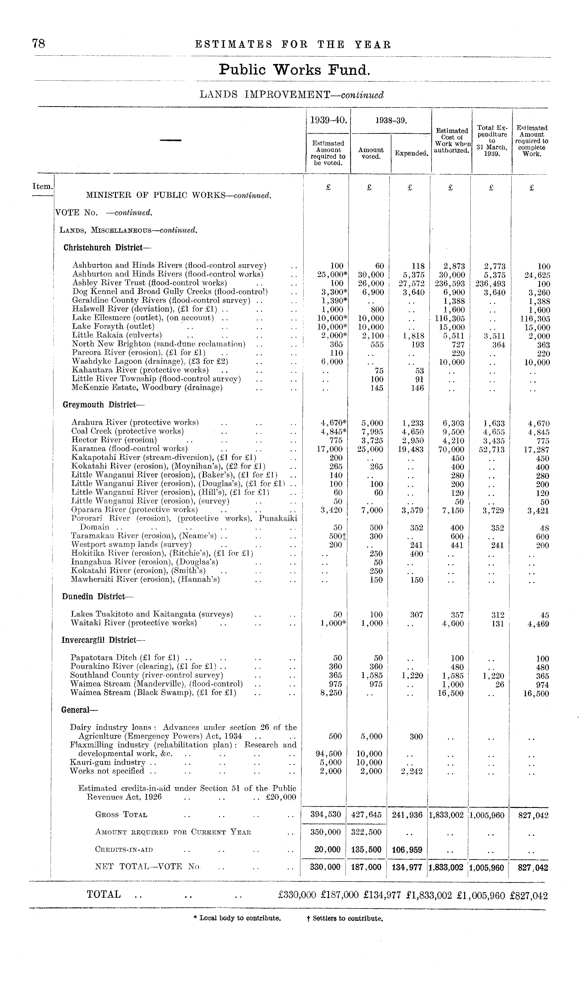 1939-40. 1938-39. Estimated Total Ex " Estimated Cost ol P enditure Amount — —~ Estimated Work when required to Amount Amount F™ nf i P ,j authorized. ' "tovS-k required to voted. Expended. 1939. Work. be voted. Item. ££££££ MINISTER OP PUBLIC WORKS—continued. VOTE No. —continued. Lands, Miscellaneous —continued. Christchurch District— Ashburton and Hinds Rivers (flood-control survey) .. 100 60 118 2,873 2,773 100 Ashburton and Hinds Rivers (flood-control worts) .. 25,000* 30,000 5,375 30,000 5,375 24,625 Ashley River Trust (flood-control works) .. .. 100 26,000 27,572 236,593 236,493 100 Dog Kennel and Broad Gully Creeks (flood-control) .. ; 3,300* 6,900 3,640 6,900 3,640 3,260 Geraidine County Rivers (flood-control survey) .. .. 1,390* .. .. 1,388 .. 1,388 Halswell River (deviation), (£1 for £1) .. .. .. 1,000 800 .. 1,600 .. 1,600 Lake Ellesmere (outlet), (on account) .. .. .. 10,000* 10,000 .. 116,305 .. 116,305 Lake Forsyth (outlet) .. .. .. .. 10,000* 10,000 .. 15,000 .. 15,000 Little Rakaia (culverts) .. .. .. ... 2,000* 2,100 1,818 5,511 3,511 2,000 North New Brighton (sand-dune reclamation) . . .. 365 555 193 727 364 363 Pareora River (erosion), (£1 for £1) .. .. .. 110 .. .. 220 .. 220 Washdyke Lagoon (drainage), (£3 for £2) .. .. 6,000 .. .. 10,000 .. 10,000 Kahautara River (protective works) .. .. . . .. 75 53 Little River Township (flood-control survey) .. .. . . 100 91 MeKenzie Estate, Woodbury (drainage) .. .. .. 145 146 Greymouth District — Arahura River (protective works) .. .. .. 4,670* 5,000 1,233 6,303 1,633 4,670 Coal Creek (protective works) .. .. .. 4,845* 7,995 4,650 9,500 4,655 4,845 Hector River (erosion) .. .. .. .. 775 3,725 2,950 4,210 3,435 775 Karamea (flood-coatrol works) .. .. .. 17,000 25,000 19,483 70,000 52,713 17,287 Kakapotahi River (stream-diversion), (£1 for £1) .. 200 .. .. 450 .. 450 Kokatahi River (erosion), (Moynihan's), (£2 for £1) .. 265 265 .. 400 .. 400 Little Wanganui River (erosion), (Baker's), (£1 for £1) .. 140 .. .. 280 .. 280 Little Wanganui River (erosion), (Douglas's), (£1 for £D .. 100 100 .. 200 .. 200 Little Wanganui River (erosion), (Hill's), (£1 for £1) .. 60 60 .. 120 .. 120 Little Wanganui River (erosion), (survey) . . .. 50 . . .. 50 .. 50 Oparara River (protective works) .. .. .. 3,420 7,000 3,579 7,150 3,729 3,421 Pororari River (erosion), (protective works), Punakaiki Domain .... .. . . . . .. 50 500 352 400 352 48 Taramakau River (erosion), (Neame's) . . .. . . 1 500J 300 .. 600 .. 600 Westport swamp lands (survey) . . .. .. 200 .. 241 441 241 200 Hokitika River (erosion), (Ritchie's), (£1 for £1) .. .. 250 400 Inangahua River (erosion), (Douglas's) .. .. .. 50 Kokatahi River (erosion), (Smith's) .. . . .. . . 250 Mawheraiti River (erosion), (Hannah's) .. . . .. 150 150 Dunedin District — Lakes Tuakitoto and Ivaitangata (surveys) .. . . 50 100 307 357 312 45 Waitaki River (protective works) .. .. .. 1,000* 1,000 .. 4,600 131 4,469 Invercargil! District — Papatotara Ditch (£1 for £1) .. .. .. .. 50 50 .. 100 .. 100 Pourakino River (clearing), (£1 for £1) .. .. .. 360 360 .. 480 .. 480 Southland County (river-control survey) .. .. 365 1,585 1,220 1,585 1,220 365 Waimea Stream (Manderville), (flood-control) .. .. 975 975 .. 1,000 26 974 Waimea Stream (Black Swamp), (£1 for £1) .. .. 8,250 .. .. 16,500 .. 16,500 General — Dairy industry loans : Advances under section 26 of the Agriculture (Emergency Powers) Act, 1934 .. .. 500 5,000 300 Flaxmilling industry (rehabilitation plan): Research and developmental work, &c. .. .. .. .. 94,500 10,000 Kauri-gum industry .. . . . . . . .. 5,000 10,000 Works not specified .. .. .. .. .. 2,000 2,000 2,242 Estimated credits-in-aid under Section 51 of the Public Revenues Act, 1926 .. .. .. £20,000 Gross Total .. .. .. .. 394,530 427,645 241,936 1,833,002 jl, 005,960 827,042 Amount required for Current Year .. 350,000 322,500 .. .. j Crbdits-IN-AID .. .. .. .. 20,000 135,500 106,959 NET TOTAL—VOTE No .. .. 330,000 187,000 i 134,977 1,833,002 1,005,960 827,042 TOTAL .. .. .. £330,000 £187,000 £134,977 £1,833,002 £1,005,960 £827,042 * Local body to contribute. t Settlers to contribute.