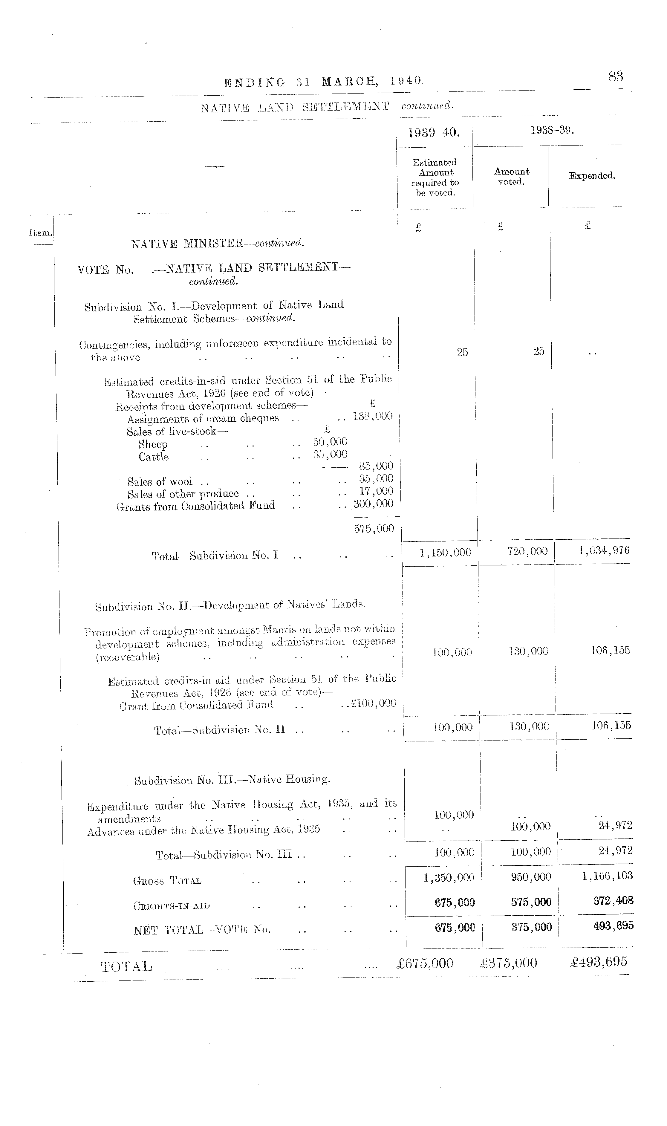1939-40. 1938-39. Estimated Amount Amount Expended, required to voted. be voted. Item. £ £ £ NATIVE MINISTER —continued. VOTE No. .—NATIVE LAND SETTLEMENT— continued. Subdivision No. I. —Development of Native Land Settlement Schemes —continued. Contingencies, including unforeseen expenditure incidental to the above 25 25 Estimated credits-in-aid under Section 51 of the Public Revenues Act, 1926 (see end of vote) — Receipts from development schemes — £ Assignments of cream cheques .. .. 138,000 Sales of live-stock — £ Sheep .. •• •• 50,000 Cattle .. •• 35,000 85,000 Sales of wool .. . • • • .. 35,000 Sales of other produce .. .. •• IT,000 Grants from Consolidated Fund .. . ■ 300,000 575,000 Total —Subdivision No. I .. .. •• 1,150,000 720,000 1,034,976 I Subdivision No. 11.—Development of Natives Lands. Promotion of employment amongst Maoris on lands not within development schemes, including administration expenses j (recoverable) j 100,000 j 130,000 i06,iK> Estimated credits-in-aid under Section 51 of the Public Revenues Act, 1926 (see end of vote)— Grant from Consolidated Fund .. ..£100,000: Total —SubdivisionNo.il .. .. 100,000 130,000 106,155 Subdivision No. III.—Native Housing. Expenditure under the Native Housing Act, 1935, and its amendments .. •• •• •• •• 100,000 .. '91070 Advances under the Native Housing Act, 1935 .. .. .. 100,000 24,972 Total —Subdivision No. Ill .. .. •• 100,000 100,000 j 24,972 GROSS TOTAL .. 1,350,000 950,000 ! 1,166,103 CREDITS-IN-AID .. •• •• 675,000 575,000 672,408 NET TOTAL—VOTE No. .. .. •• 675,000 375,000 493,695 ~TOTAL ... .... .... £675,000 £375,000 £493,695