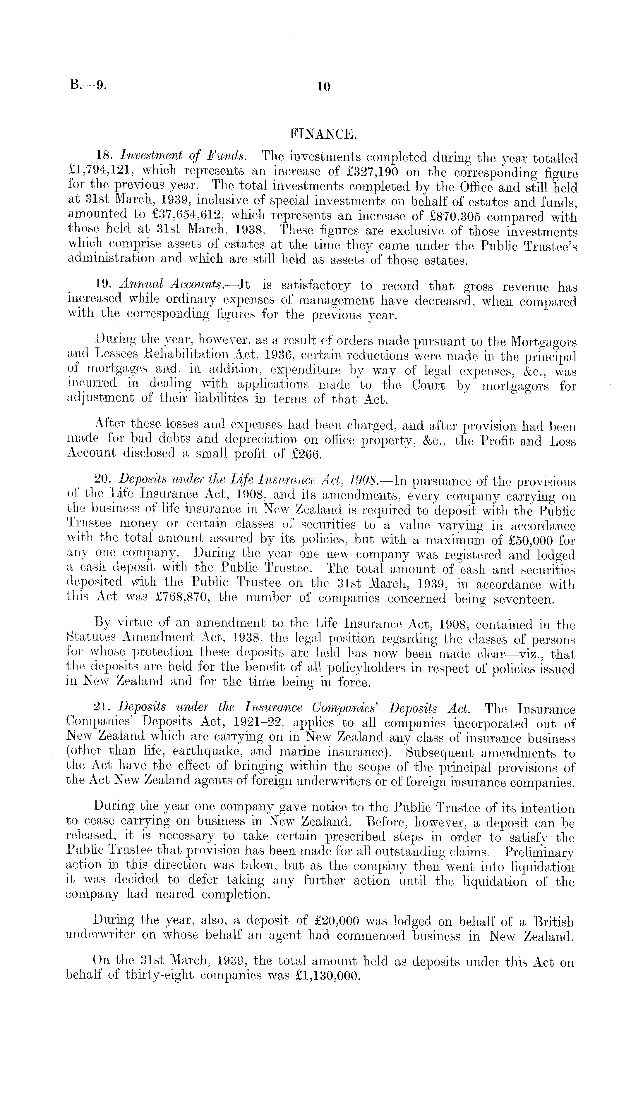 FINANCE. 18. Investment of Funds.—The investments completed during the year totalled £1,794,121, which represents an increase of £327,190 on the corresponding figure for the previous year. The total investments completed by the Office and still held at 31st March, 1939, inclusive of special investments on behalf of estates and funds, amounted to £37,654,612, which represents an increase of £870,305 compared with those held at 31st. March, 1938. These figures are exclusive of those investments which comprise assets of estates at the time they came under the Public Trustee's administration and which are still held as assets of those estates. 19. Annual Accounts. —It is satisfactory to record that gross revenue has increased while ordinary expenses of management have decreased, when compared with the corresponding figures for the previous year. During the year, however, as a result of orders made pursuant to the Mortgagors and Lessees Rehabilitation Act, 1936, certain reductions were made in the principal of mortgages and, in addition, expenditure by way of legal expenses, &c., was incurred in dealing with, applications made 'to the Court by mortgagors for adjustment of their liabilities in terms of that Act. After these losses and expenses had been charged, and after provision had been made for bad debts and depreciation on office property, &c., the Profit and Loss Account disclosed a small profit of £266. 20. Deposits under the Life Insurance Act, 1908.—1n pursuance of the provisions 01, the Life Insurance Act, 1908, and its amendments, every company carrying on the business of life insurance in New Zealand is required to deposit with the Public Trustee money or certain classes of securities to a value varying in accordance with the total amount assured by its policies, but with a maximum of £50,000 for any one company. During the year one new company was registered and lodged a cash deposit with the Public Trustee. The total amount of cash and securities deposited with the Public Trustee on the 31st March, 1939, in accordance with this Act was £768,870, the number of companies concerned being seventeen. By virtue of an amendment to the Life Insurance Act, 1908, contained in the Statutes Amendment Act, 1938, the legal position regarding the classes of persons for whose protection these deposits are held has now been made clear—viz., that the deposits are held for the benefit of all policyholders in respect of policies issued in New Zealand and for the time being in force. 21. Deposits under the Insurance Companies' Deposits Act.—The Insurance Companies' Deposits Act, 1921-22, applies to all companies incorporated out of New Zealand which are carrying on in New Zealand any class of insurance business (other than life, earthquake, and marine insurance). Subsequent amendments to the Act have the effect of bringing within the scope of the principal provisions of the Act New Zealand agents of foreign underwriters or of foreign insurance companies. During the year one company gave notice to the Public Trustee of its intention to cease carrying on business in New Zealand. Before, however, a deposit can be released, it is necessary to take certain prescribed steps in order to satisfy the Public Trustee that provision has been made for all outstanding claims. Preliminary action in this direction was taken, but as the company then went into liquidation it was decided to defer taking any further action until the liquidation of the company had neared completion. During the year, also, a deposit of £20,000 was lodged on behalf of a British underwriter on whose behalf an agent had commenced business in New Zealand. On the 31st March, 1939, the total amount held as deposits under this Act on behalf of thirty-eight companies was £1,130,000.