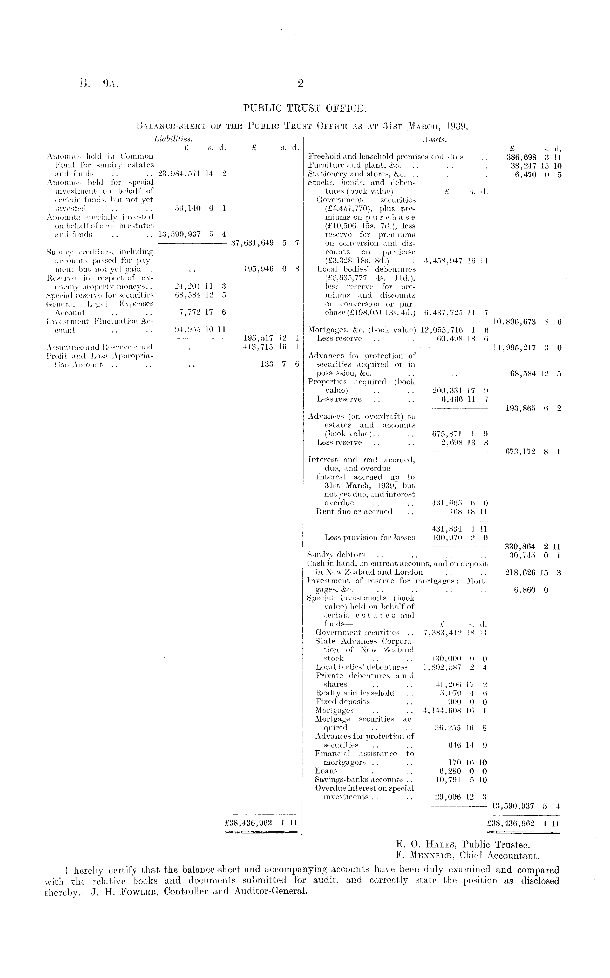 PUBLIC TRUST OFFICE. Balance-sheet of the Public Trust Office as at 31st March, 1939. Liabilities. Assets. £ s. d. £ s. d. £ a. d. Amounts held in Common Freehold and leasehold premises and sites .. 386,698 3 11 Fund for sundry estates Furniture and plant, &c. .. .. .. 38,247 15 10 and funds .. .. 23,984,571 14 2 Stationery and stores, &c. .. .. .. 6,470 0 5 Amounts held for special Stocks, bonds, and debeninvestment on behalf of tures (book value) — £ s. d. certain funds, but not yet Government securities invested .. .. 56,140 6 1 (£4,451,770), plus pr«Amounts specially invested miums on purchase on behalf of certain estates (£10,506 15s. 7d.), less and funds .. .. 13,590,937 5 4 reserve for premiums 37,631,649 5 7 on conversion and disSundry creditors, including counts on purchase accounts passed for pay- (£3,328 18s. Bd.) .. 4,458,947 16 11 ment but not yet paid .. .. 195,946 0 8 Local bodies' debentures Reserve in respect of ex- (£6,635,777 4s. lid.), enemy property moneys.. 24,204 11 3 less reserve for preSpecial reserve for securities 68,584 12 5 miums and discounts General Legal Expenses on conversion or purAccount .. .. 7,772 17 6 chase (£198,051135. 4d.) 6,437,725 11 7 Investment Fluctuation Ac- 10,896,673 8 6 count .. .. 94,955 10 11 Mortgages, &c. (book value) 12,055,716 1 6 195,517 12 1 Less reserve .. .. 60,498 18 6 Assurance and Reserve Fund .. 413,715 16 1 — 11,995,217 3 0 Profit and Loss Appropria- Advances for protection of tion Account .. .. .. 133 7 6 securities acquired or in possession, &c. .. .. 68,584 12 5 Properties acquired (book value) .. .. 200,331 17 9 Less reserve .. .. 6,466 11 7 193,865 6 2 Advances (on overdraft) to estates and accounts (book value).. .. 675,871 1 9 Less reserve .. .. 2,698 13 8 673,172 8 1 Interest and rent accrued, due, and overdue— Interest accrued up to 31st March, 1939, but not yet due, and interest overdue .. .. 431,665 6 0 Rent due or accrued .. 168 18 11 431,834 4 11 Less provision for losses 100,970 2 0 — 330,864 2 11 Sundry debtors .. .. . . .. 30,745 0 1 Cash in hand, on current account, and on deposit in New Zealand and London .. .. 218,626 15 3 Investment of reserve for mortgages: Mortgages, &c. .. .. .. .. 6,860 0 Special investments (book value) held on behalf of certain estates and funds— £ s. d. Government securities .. 7,383,412 18 11 State Advances Corporation of New Zealand stock .. .. 130,000 0 0 Local bodies'debentures 1,802,587 2 4 Private debentures and shares .. .. 41,206 17 2 Realty arid leasehold .. 5,070 4 6 Fixed deposit s .. 900 0 0 Mortgages .. .. 4,144,608 16 1 Mortgage securities acquired .. .. 36,255 16 8 Advances for protection of securities .. .. 646 14 9 Financial assistance to mortgagors .. .. 170 16 10 Loans .. .. 6,280 0 0 Savings-banks accounts .. 10,791 5 10 Overdue interest on special investments.. .. 29,006 12 3 13,590,937 5 4 £38,436,962 1 11 £38,436,962 1 11 E. 0. Hales, Public Trustee. F. Menneer, Chief Accountant. I hereby certify that the balance-sheet and accompanying accounts have been duly examined and compared with the relative books and documents submitted for audit, and correctly state the position as disclosed thereby.—J. H. Fowler, Controller and Auditor-General.