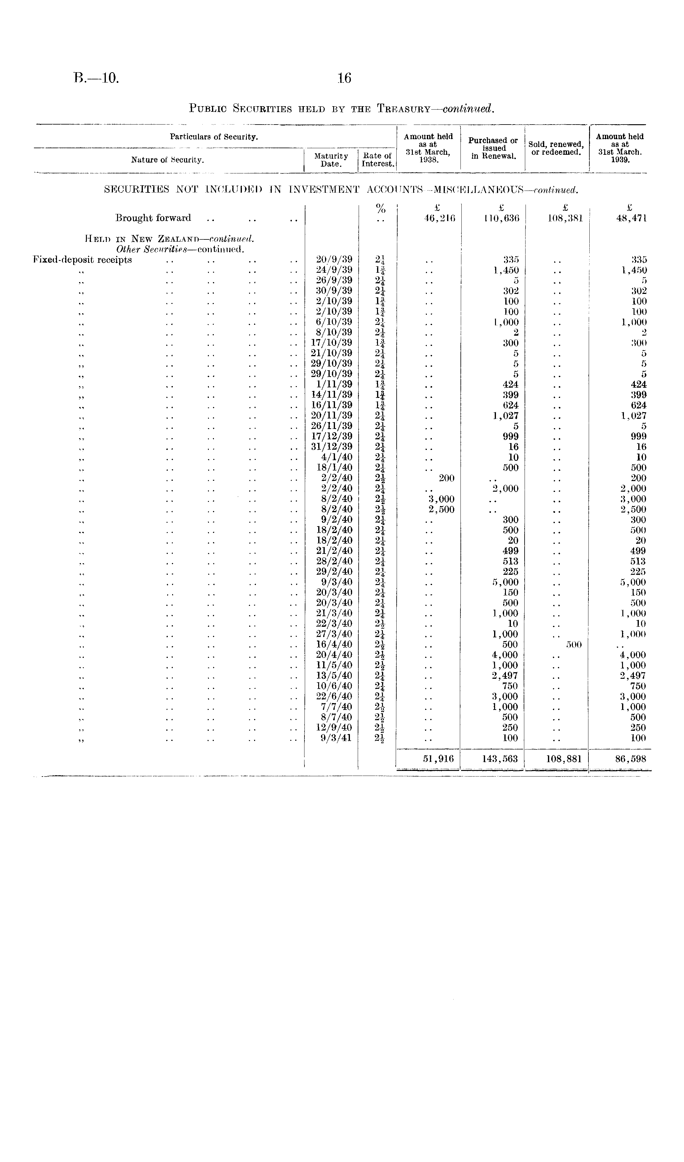 Particulars of Security. Amount held p,„,. hOBO(1 Amount held as at iiSff? Sold, renewed, as at „< 31st March, , or redeemed. 31st March. Nature oi Security. Sate Interest. 1938 ' m9 * * I I SECURITIES NOT INCLUDED IN INVESTMENT ACCOUNTS—MISCELLANEOUS—continued. % £ £ £ £ Brought forward .. .. .. 46,216 110,636 108,381 48,471 Held in New Zealand —continued. Other Securities—continued. Fixed-deposit receipts .. .. .. .. 20/9/39 2-| .. 335 .. 335 24/9/39 If .. 1,450 .. 1,450 26/9/39 2J 5 5 30/9/39 2| .. 302 .. 302 2/10/39 1|- .. 100 100 2/10/39 1| .. 100 .. 100 6/10/39 2J .. 1,000 .. 1,000 8/10/39 2i 2 2 .. 17/10/39 1J .. 300 .. 300 .. 21/10/39 2J 5 5 .. 29/10/39 2£ 5 5 .. 29/10/39 2| 5 5 1/11/39 If .. 424 .. 424 .. 14/11/39 If .. 399 .. 399 .. 16/11/39 If .. 624 .. 624 .. 20/11/39 2J .. 1,027 .. 1,027 .. 26/11/39 2J 5 5 .. 17/12/39 21 .. 999 .. 999 .. 31/12/39 2i .. 16 16 4/1/40 2J 10 10 18/1/40 2| .. 500 .. 500 2/2/40 24 200 .. .. 200 2/2/40 21 .. 2,000 .. 2,000 .. .. .. 8/2/40 2J 3,000 .. .. 3,000 8/2/40 2| 2,500 .. .. 2,500 9/2/40 21 .. 300 .. 300 18/2/40 21 .. 500 .. 500 18/2/40 21 .. 20 20 21/2/40 21 .. 499 .. 499 28/2/40 21 .. 513 .. 513 29/2/40 21 .. 225 .. 225 9/3/40 21 .. 5,000 .. 5,000 20/3/40 21 .. 150 .. 150 20/3/40 21 .. 500 .. 500 21/3/40 21 .. 1,000 .. 1,000 22/3/40 2| 10 10 27/3/40 21 .. 1,000 .. 1,000 16/4/40 24 .. 500 500 20/4/40 24 .. 4,000 .. 4,000 11/5/40 24 .. 1,000 .. 1,000 13/5/40 21 .. 2,497 .. 2,497 10/6/40 21 .. 750 .. 750 22/6/40 21 .. 3,000 .. 3,000 7/7/40 2| .. 1,000 .. 1,000 8/7/40 2| .. 500 .. 500 12/9/40 24 .. 250 .. 250 9/3/41 24 .. 100 .. 100 51,916 143,563 108,881 86,598
