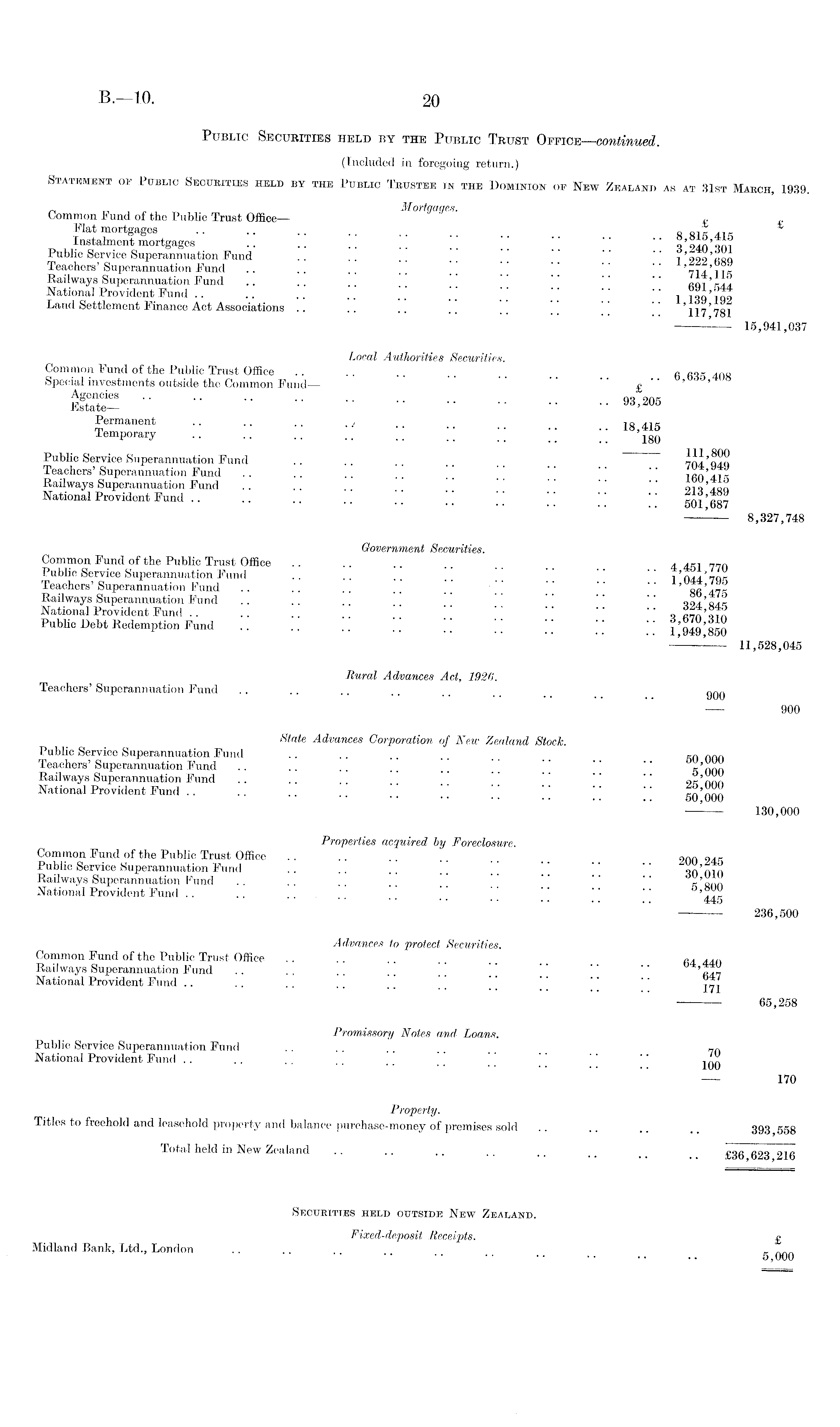 Public Securities held by the Public Trust Office—continued. (Included in foregoing return.) Statement of Public Securities held by the Public Trustee in the Dominion oe New Zealand as at 31st March, 1939. „ ~ Mortaaqes. Common Fund of the Public Trust Office— £ Flat mortgages .. .. .. ~ _ 8 sis 41 r Instalment mortgages .. .. .. .. " " " " Public Service Superannuation Fund .. .. .. ' ■. 'ooo'poq Teachers' Superannuation Fund .. .. .. " '' " " " " 'vi 4' 11 Railways Superannuation Fund .. .. .. " " " " " iit'irj National Provident Fund .. .. .. .. , , " " " " . I*oo'iqp Land Settlement Finance Act Associations .. .. .. ' 117' 781 ' 15,941,037 Local Authorities Securities. Common Fund of the Public Trust Office ...... 6 635 408 Special investments outside the Common Fund— " " " " £ " ' 130 ' 4US f£T! Permanent .. .. .. ... _ 19 Temporary .. .. ~ '' " " 'j g Q Public Service Superannuation Fund .. .. _ _ 704.' 04/1 Teachers' Superannuation Fund .. .. .. '' " " " " lfio'lne Railways Superannuation Fund .. .. .. . . " " " " " ii'Mun National Provident Fund .. .. .. " " " " " " 501,687 8,327,748 Government Securities. Common Fund of the Public Trust Office .. .. .. .. . . 4 4f>i 770 Public Service Superannuation Fund .. .. .. " " i'o44 7Qfi Teachers' Superannuation Fund .. .. .. .. " " " " " 86 47? Railways Superannuation Fund .. . . .. .' " ' ' " " " „ 0/l 't AK National Provident Fund .. .. .. .. " " " " " „ iJx' of a Public Debt Redemption Fund .. .. .. ~ _ _ ' '' 1' 949' 850 — 11,528,045 Rural Advances Act, 1926. Teachers' Superannuation Fund .. .. .. ~ qqq 900 State Advances Corporation of New Zealand Stock. Public Service Superannuation Fund ........ kq noo Teachers' Superannuation Fund .. .. \ \ " " " s'ooo Railways Superannuation Fund .. .. .. " " " " " oS' Mnr! National Provident Fund .. .. .. " " " " " " 5™ • • •. .. 50,000 130,000 Properties acquired by Foreclosure. Common Fund of the Public Trust Office .. .. . . .. .. 200 94^ Public Service Superannuation Fund .. .. .. " " " " ""in'olo Railways Superannuation Fund .. .. .. " '' " " " " " National Provident Fund .. .. " " " " • • • • • • • • • • •• .. 445 236,500 Advances to protect Securities. Common Fund of the Public Trust Office .. .. .. ~ .. n. .- n Railways Superannuation Fund .. .. .. " " " fi47 National Provident Fund .. . . . . .. ~ ' " '' " '' 65,258 Promissory Notes and Loans. Public Service Superannuation Fund . . .. . . , _ National Provident Fund .. .. .. .. .. ' '' '' " jqq 170 Property. Titles to freehold and leasehold property and balance purchase-money of premises sold .. .. .. .. 393 558 Total held in New Zealand .. .. .. .. ~ _ _ _ £36 623 216 Securities held outside New Zealand. Fixed-deposit Receipts. £ Midland Bank, Ltd., London .... _ 5,000