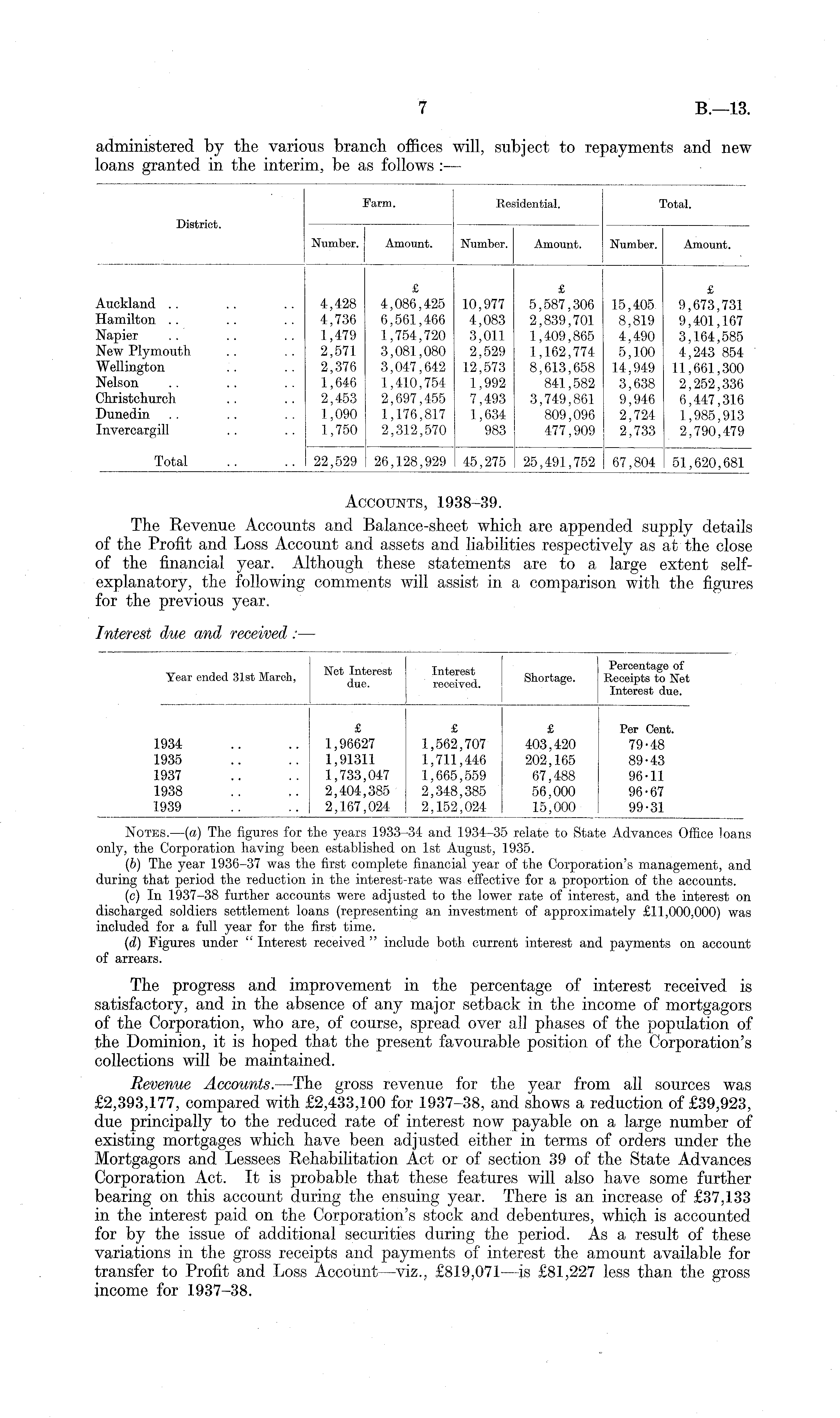 Notes. —(a) The figures for the years 1933-34 and 1934-35 relate to State Advances Office loans only, the Corporation having been established on Ist August, 1935. (b) The year 1936-37 was the first complete financial year of the Corporation's management, and during that period the reduction in the interest-rate was effective for a proportion of the accounts. (c) In 1937-38 further accounts were adjusted to the lower rate of interest, and the interest on discharged soldiers settlement loans (representing an investment of approximately £11,000,000) was included for a full year for the first time. (id) Figures under " Interest received " include both current interest and payments on account of arrears. The progress and improvement in the percentage of interest received is satisfactory, and in the absence of any major setback in the income of mortgagors of the Corporation, who are, of course, spread over all phases of the population of the Dominion, it is hoped that the present favourable position of the Corporation's collections will be maintained. Revenue Accounts. —The gross revenue for the year from all sources was £2,393,177, compared with £2,433,100 for 1937-38, and shows a reduction of £39,923, due principally to the reduced rate of interest now payable on a large number of existing mortgages which have been adjusted either in terms of orders under the Mortgagors and Lessees Rehabilitation Act or of section 39 of the State Advances Corporation Act. It is probable that these features will also have some further bearing on this account during the ensuing year. There is an increase of £37,133 in the interest paid on the Corporation's stock and debentures, which is accounted for by the issue of additional securities during the period. As a result of these variations in the gross receipts and payments of interest the amount available for transfer to Profit and Loss Account —viz., £819,071 —is £81,227 less than the gross income for 1937-38.