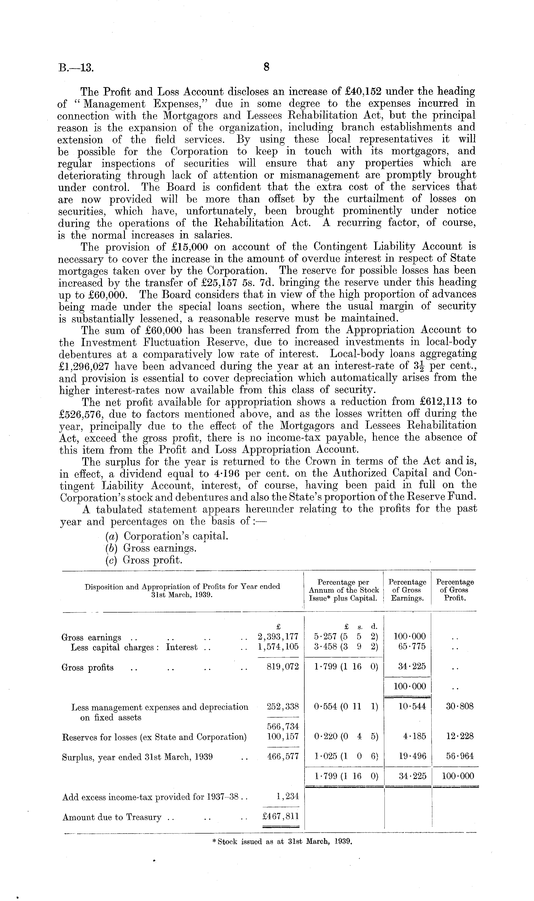 _. ... , . ... ,■ t, r it i j Percentage per ! Percentage Percentage Disposition and Appropriation of Profits for Year ended Ammm of t s h / stock of Grosa 5 of Gross 5 31st March, 1939. Isgue * plus Capital ; Earnings . Proflt . £ £ s. d. Gross earnings 2,393,177 5-257 (5 5 2) 100-000 Less capital charges: Interest .. .. 1,574,105 3-458 (3 9 2) 65-775 Gross profits .. .. .. .. 819,072 1-799 (1 16 0) 34-225 100-000 Less management expenses and depreciation 252,338 0-554 (0 11 1) 10-544 30-808 on fixed assets ; — 566,734 Reserves for losses (ex State and Corporation) 100,157 0-220 (0 4 5) 4-185 12-228 Surplus, year ended 31st March, 1939 .. 466,577 1-025 (1 0 6) 19-496 56-964 1-799 (1 16 0) 34-225 100-000 Add excess income-tax provided for 1937-38 .. 1,234 Amount due to Treasury .. .. .. £467,811 * Stock issued as at 31st March, 1939.