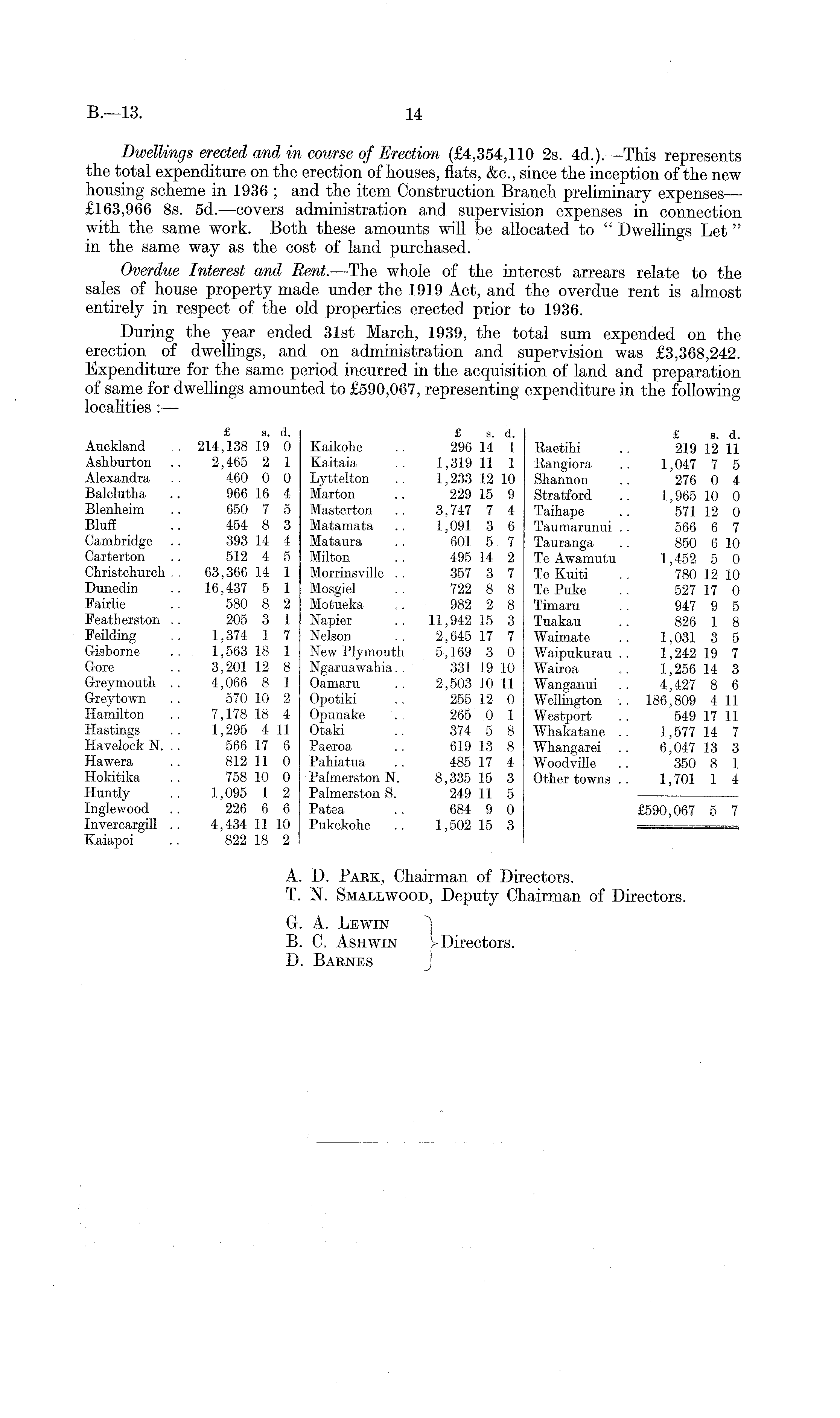 Dwellings erected and in course of Erection (£4,354,110 2s. 4d.). —This represents the total expenditure on the erection of houses, flats, &c., since the inception of the new housing scheme in 1936 ; and the item Construction Branch preliminary expenses— £163,966 Bs. 5d. —covers administration and supervision expenses in connection with the same work. Both these amounts will be allocated to " Dwellings Let " in the same way as the cost of land purchased. Overdue Interest and Rent.—The whole of the interest arrears relate to the sales of house property made under the 1919 Act, and the overdue rent is almost entirely in respect of the old properties erected prior to 1936. During the year ended 31st March, 1939, the total sum expended on the erection of dwellings, and on administration and supervision was £3,368,242. Expenditure for the same period incurred in the acquisition of land and preparation of same for dwellings amounted to £590,067, representing expenditure in the following localities : — £ s. d. £ s. d. £ g. d. Auckland . 214,138 19 0 Kaikohe .. 296 14 1 Raetihi .. 219 12 11 Ashburton .. 2,465 2 1 Kaitaia 1,319 11 1 Rangiora .. 1,047 7 5 Alexandra .. 460 0 0 Lyttelton .. 1,233 12 10 Shannon .. 276 0 4 Balclutha .. 966 16 4 Marton .. 229 15 9 Stratford .. 1,965 10 0 Blenheim .. 650 7 5 Masterton .. 3,747 7 4 Taihape .. 571 12 0 Bluff .. 454 8 3 Matamata .. 1,091 3 6 Taumarunui .. 566 6 7 Cambridge .. 393 14 4 Mataura .. 601 5 7 Tauranga .. 850 610 Carterton .. 512 4 5 Milton .. 495 14 2 Te Awamutu 1.452 5 0 Christohurch ~ 63,366 14 1 Morrinsville .. 357 3 7 Te Kuiti .. 780 12 10 Dunedin .. 16,437 5 1 Mosgiel .. 722 8 8 Te Puke .. 527 17 0 Fairlie .. 580 8 2 Motueka .. 982 2 8 Timaru .. 947 9 5 Featherston .. 205 3 1 Napier .. 11,942 15 3 Tuakau .. 826 ] 8 Feilding .. 1,374 1 7 Nelson .. 2,645 17 7 Waimate .. 1,031 3 5 Gisborne .. 1,563 18 1 New Plymouth 5,169 3 0 Waipukurau .. 1,242 19 7 Gore .. 3,201 12 8 Ngaruawahia.. 331 19 10 Wairoa .. 1,256 14 3 Greymouth .. 4,066 8 1 Oamaru .. 2,503 10 11 Wanganui .. 4,427 8 6 Greytown .. 570 10 2 Opotiki .. 255 12 0 Wellington .. 186,809 411 Hamilton .. 7,178 18 4 Opunake .. 265 0 1 Westport .. 549 17 V] Hastings .. 1,295 411 Otaki .. 374 5 8 Whakatane .. 1,577 14 7 Havelock N. .. 566 17 6 Paeroa .. 619 13 8 Whangarei .. 6,047 13 3 Hawera .. 812 11 0 Pahiatua .. 485 17 4 Woodville .. 350 8 1 Hokitika .. 758 10 0 Palmerston N. 8,335 15 3 Other towns 1,701 1 4 Huntly .. 1,095 1 2 Palmerston S. 249 11 5 Inglewood .. 226 6 6 Patea .. 684 9 0 £590,067 5 7 Invercargill .. 4,434 11 10 Pukekohe .. 1.502 15 3 Kaiapoi .. 822 18 2 A. D. Park, Chairman of Directors. T. N. Smallwood, Deputy Chairman of Directors. G. A. Lewin B. C. Ash win D. Barnes I