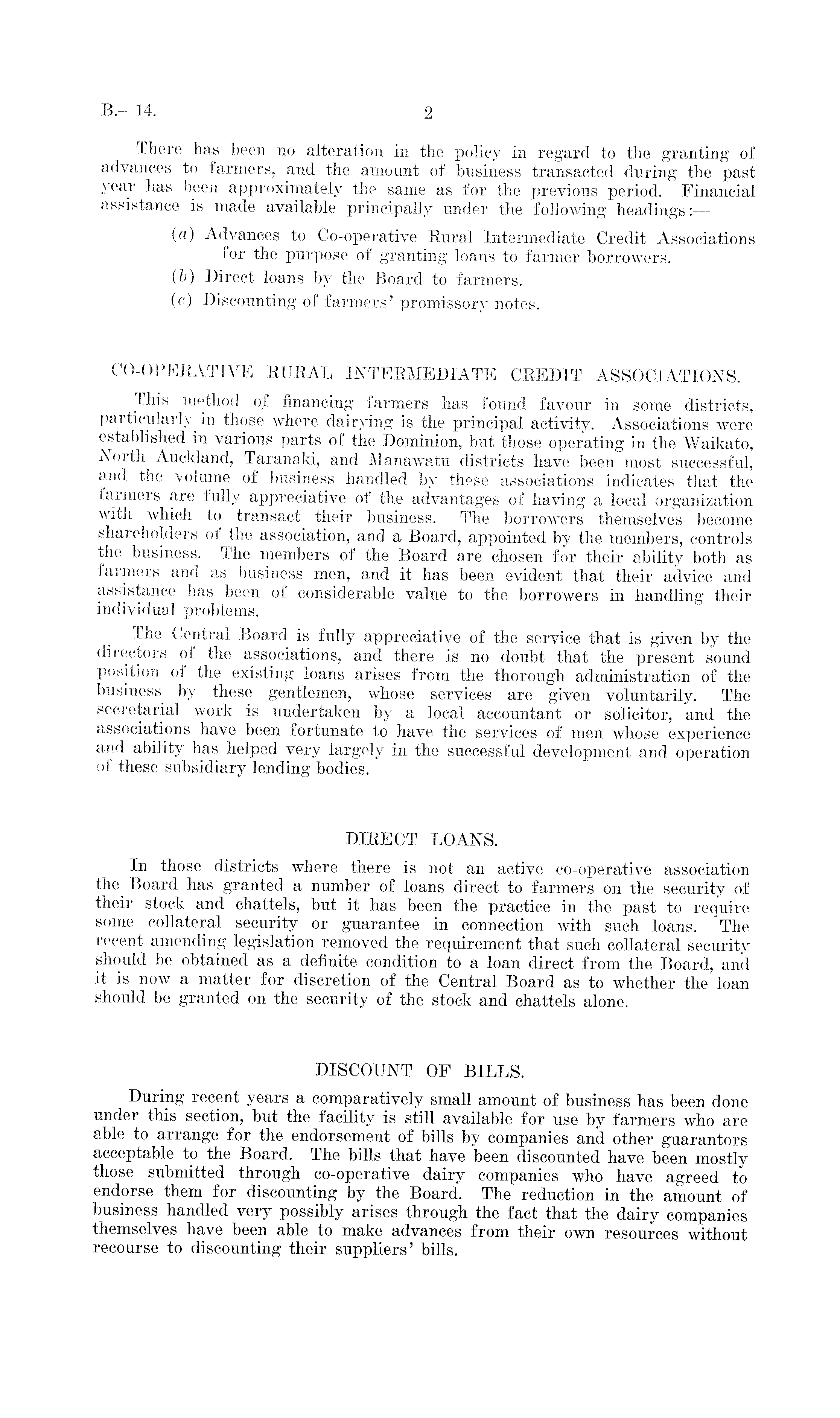 There has been no alteration in the policy in regard to the granting of advances to farmers, and the amount of business transacted during the past year has been approximately the same as for the previous period. Financial assistance is made available principally under the following headings:— (a) Advances to Co-operative Rural Intermediate Credit Associations for the purpose of granting loans to farmer borrowers. (b) Direct loans by the Board to farmers. (c) Discounting of farmers' promissory notes. CO-OPERATIVE RURAL INTERMEDIATE CREDIT ASSOCIATIONS. This method of financing farmers - has found favour in some districts, in those where dairying is the principal activity. Associations were established in various parts of the Dominion, but those operating in the Waikato, iSorth Auckland, Taranaki, and Manawatu districts have been most successful, and the volume of business handled by these associations indicates that the farmers are fully appreciative of the advantages of having a local organization with which to transact their business. The borrowers themselves become shareholders of the association, and a Board, appointed by the members, controls the business. r ! he members of the Board are chosen for their ability both as farmers and as business men, and it has been evident that their advice and assistance has been of considerable value to the borrowers in handling their individual problems. The Central Board is fully appreciative of the service that is given by the directors of the associations, and there is no doubt that the present sound position of the existing loans arises from the thorough administration of the business by these gentlemen, whose services are given voluntarily. The secretarial work is undertaken by a local accountant or solicitor, and the associations have been fortunate to have the services of men whose experience and ability has helped very largely in the successful development and operation of these subsidiary lending bodies. DIRECT LOANS. In those districts where there is not an active co-operative association Board has granted a number of loans direct to farmers on the security of their stock and chattels, but it has been the practice in the past to require some collateral security or guarantee in connection with such loans. The recent amending legislation removed the requirement that such collateral security should be obtained as a definite condition to a loan direct from the Board, and it is now a matter for discretion of the Central Board as to whether the loan should be granted on the security of the stock and chattels alone. DISCOUNT OF BILLS. During recent years a comparatively small amount of business has been done under this section, but the facility is still available for use by farmers who are able to arrange for the endorsement of bills by companies and other guarantors acceptable to the Board. The bills that have been discounted have been mostly those submitted through co-operative dairy companies who have agreed to endorse them for discounting by the Board. The reduction in the amount of business handled very possibly arises through the fact that the dairy companies themselves have been able to make advances from their own resources without recourse to discounting their suppliers' bills.