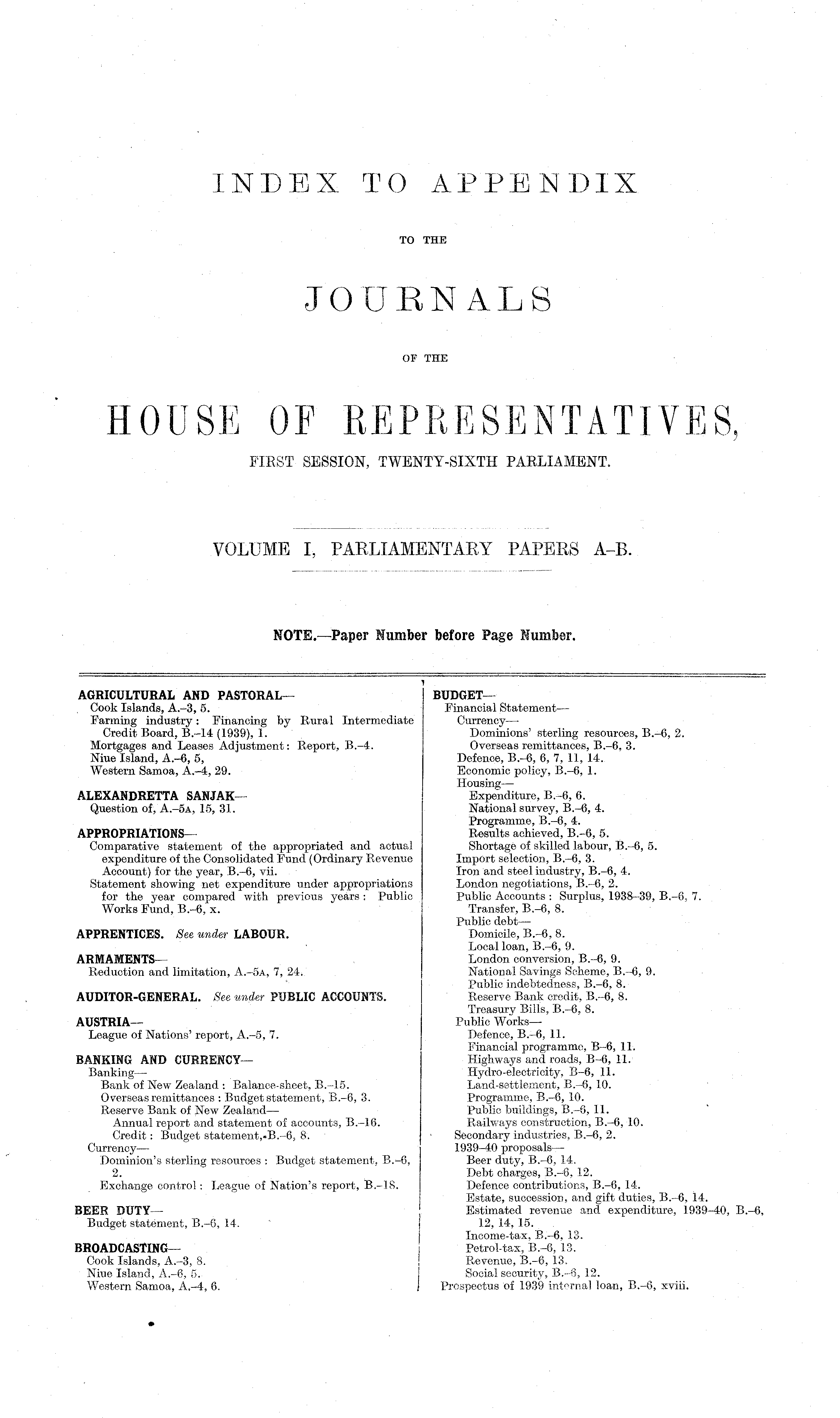 INDEX TO APPENDIX TO THE JOURNALS OF THE HOUSE OF REPRESENTATIVES, FIRST SESSION, TWENTY-SIXTH PARLIAMENT. VOLUME I, PARLIAMENTARY PAPERS A-B.