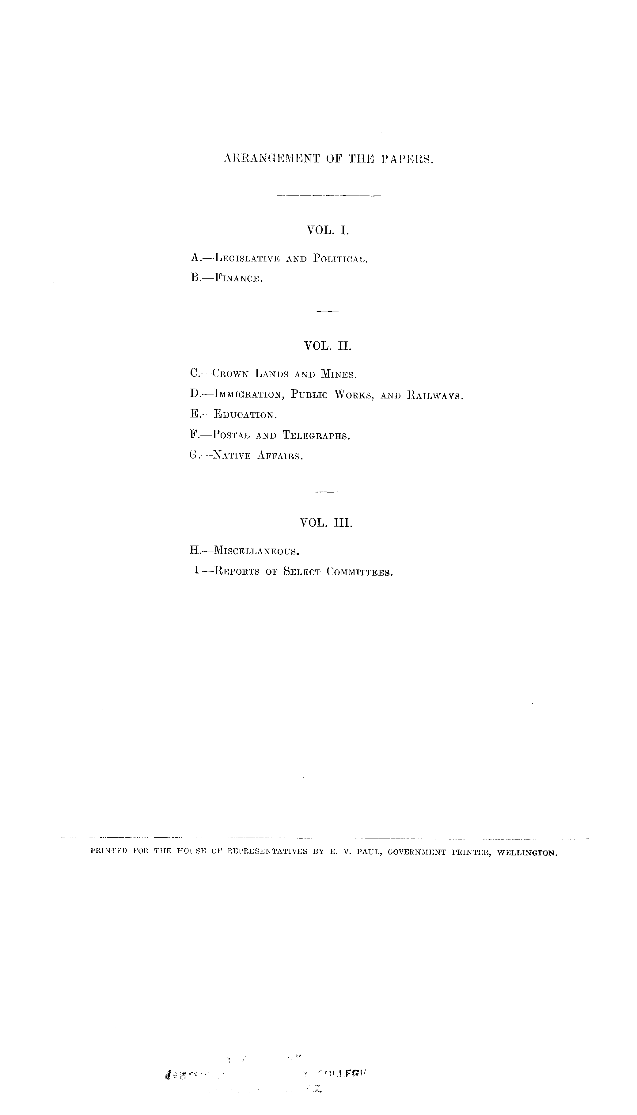 VOL. I. A.—Legislative and Political. B.—Finance. VOL. 11. C.—Crown Lands and Mines. D. —Immigration, Public Works, and Railways. E.—Education. P. —Postal and Telegraphs. G.—Native Affairs. VOL. 111. H.—Miscellaneous. I —Reports of Select Committees.