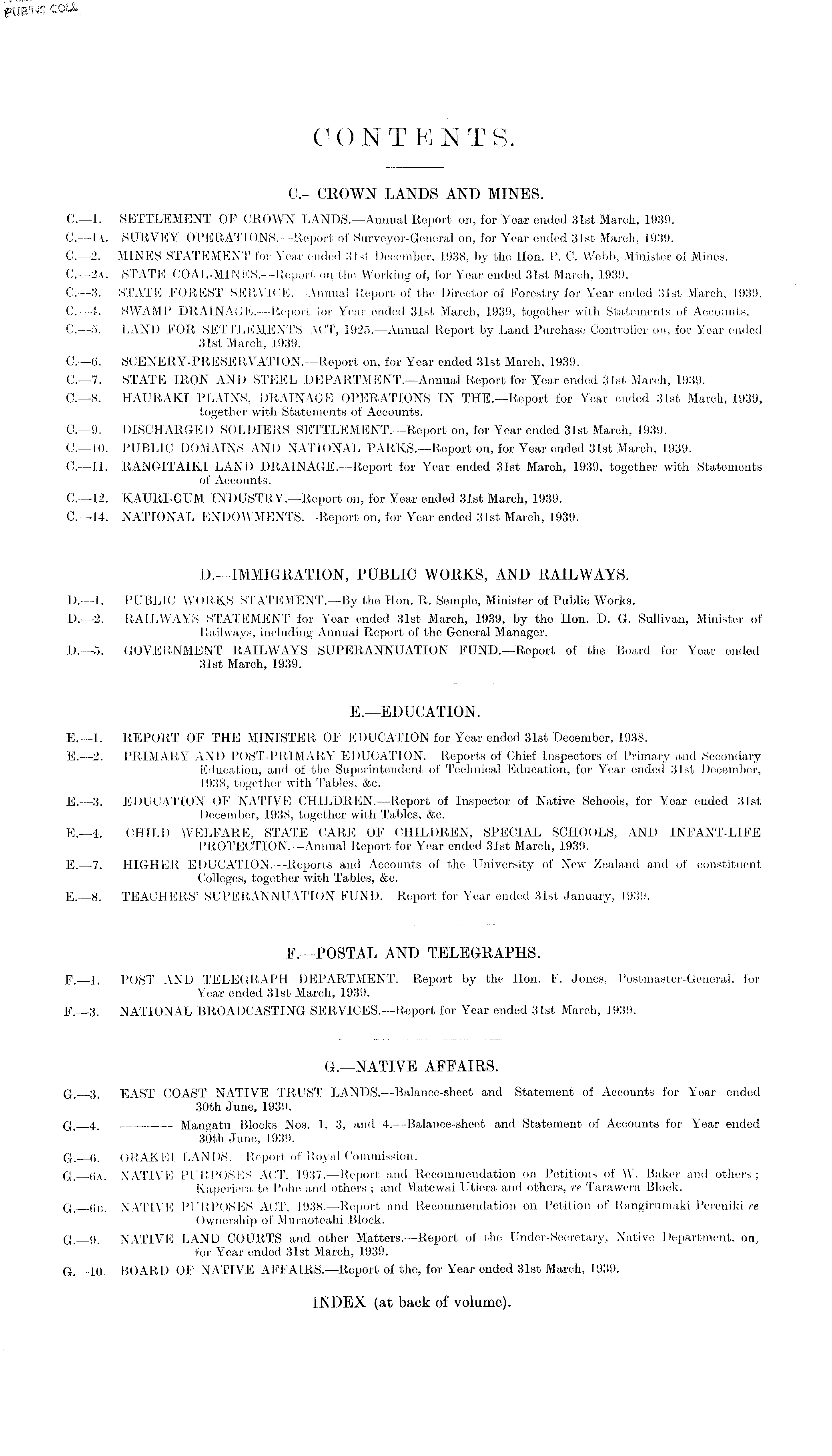 C.—CROWN LANDS AND MINES. C.—l. SETTLEMENT OF CROWN LANDS. —Annual Report on, for Year ended 31st March, 1939. C.—la. SURVEY OPERATIONS. —Report of Surveyor-General on, for Year ended 31st March, 1939. 0.—2. MINES STATEMENT for Year ended 31st December, 1938, by the Hon. P. C. Webb, Minister of Mines. C.—2a. STATE COAL-MlNES.—Report Working of, for Year ended 31st March, 1939. C.—3. STATE FOREST SERVICE.—AnnuaI Report of the Director of Forestry for Year ended 31st March, 1939. C.—4. SWAMP DRAINAGE.—Report for Year ended 31st March, 1939, together with Statements of Accounts. C.—s. LAND FOR SETTLEMENTS ACT, 1925.—Annual Report by Land Purchase Controller on, for Year ended 31st March, 1939. C.—6. SCENERY-PRESERVATION.—Report on, for Year ended 31st March, 1939. C.—7. STATE IRON AND STEEL DEPARTMENT.—AnnuaI Report for Year ended 31st March, 1939. C.—B. HAURAKI PLAINS, DRAINAGE OPERATIONS IN THE.—Report for Year ended 31st March, 1939, together with Statements of Accounts. C.—9. DISCHARGED SOLDIERS SETTLEMENT.—Report on, for Year ended 31st March, 1939. C.—lo. PUBLIC DOMAINS AND NATIONAL PARKS.—Report on, for Year ended 31st March, 1939. C.—ll. RANGITAIKI LAND DRAINAGE. —Report for Year ended 31st March, 1939, together with Statements of Accounts. C.—l2. KAURI-GUM INDUSTRY.—Report on, for Year ended 31st March, 1939. C.—l 4. NATIONAL ENDOWMENTS.—Report on, for Year ended 31st March, 1939. D.—IMMIGRATION, PUBLIC WORKS, AND RAILWAYS. D.—l. PUBLIC WORKS STATEMENT.—By the Hon. R. Semple, Minister of Public Works. D.—2. RAILWAYS STATEMENT for Year ended 31st March, 1939, by the Hon. D. G. Sullivan, Minister of Railways, including Annual Report of the General Manager. D.—s. GOVERNMENT RAILWAYS SUPERANNUATION FUND.—Report of the Board for Year ended 31st March, 1939. E.—EDUCATION. E.—l. REPORT OF THE MINISTER OF EDUCATION for Year ended 31st December, 1938. E.—-2. PRIMARY AND POST-PRIMARY EDUCATION. —Reports of Chief Inspectors of Primary and Secondary Education, and of the Superintendent of Technical Education, for Year ended 31st December, 1938, together with Tables, &c. E.—-3. EDUCATION OF NATIVE CHILDREN. —Report of Inspector of Native Schools, for Year ended 31st December, 1938, together with Tables, &c. E.—4. CHILD WELFARE, STATE CARE OF CHILDREN, SPECIAL SCHOOLS, AND INFANT-LIFE PROTECTION.—AnnuaI Report for Year ended 31st March, 1939. E.—7. HIGHER EDUCATION.—Reports and Accounts of the University of New Zealand and of constituent Colleges, together with Tables, &c. E.—B. TEACHERS' SUPERANNUATION FUND.—Report for Year ended 31st January, 1939. F.—POSTAL AND TELEGRAPHS. F.—l. POST AND TELEGRAPH DEPARTMENT.—Report by the Hon. F. Jones, Postmaster-General, for Year ended 31st March, 1939. F.—3. NATIONAL BROADCASTING SERVICES.—Report for Year ended 31st March, 1939. G.—NATIVE AFFAIRS. G 3. EAST COAST NATIVE TRUST LANDS. —Balance-sheet and Statement of Accounts for Year ended 30th June, 1939. G. 4. Mangatu Blocks Nos. 1, 3, and 4.—Balance-sheet and Statement of Accounts for Year ended 30th June, 1939. G. —G. ORAKEI LANDS.—Report of Royal Commission. G. 6a. NATIVE PURPOSES ACT, 1937. —Report and Recommendation on Petitions of W. Baker and others ; Kaperiera te Pohe and others ; and Matewai Utiera and others, re Tarawera Block. G. 6b. NATIVE PURPOSES ACT, 1938.—Report and Recommendation on Petition of Rangirumaki Pereniki re Ownership of Muraoteahi Block. G. 9. NATIVE LAND COURTS and other Matters.—Report of the Under-Secretary, Native Department, on, for Year ended 31st March, 1939. G.—lo- BOARD OF NATIVE AFFAIRS. —Report of the, for Year ended 31st March, 1939. INDEX (at back of volume).