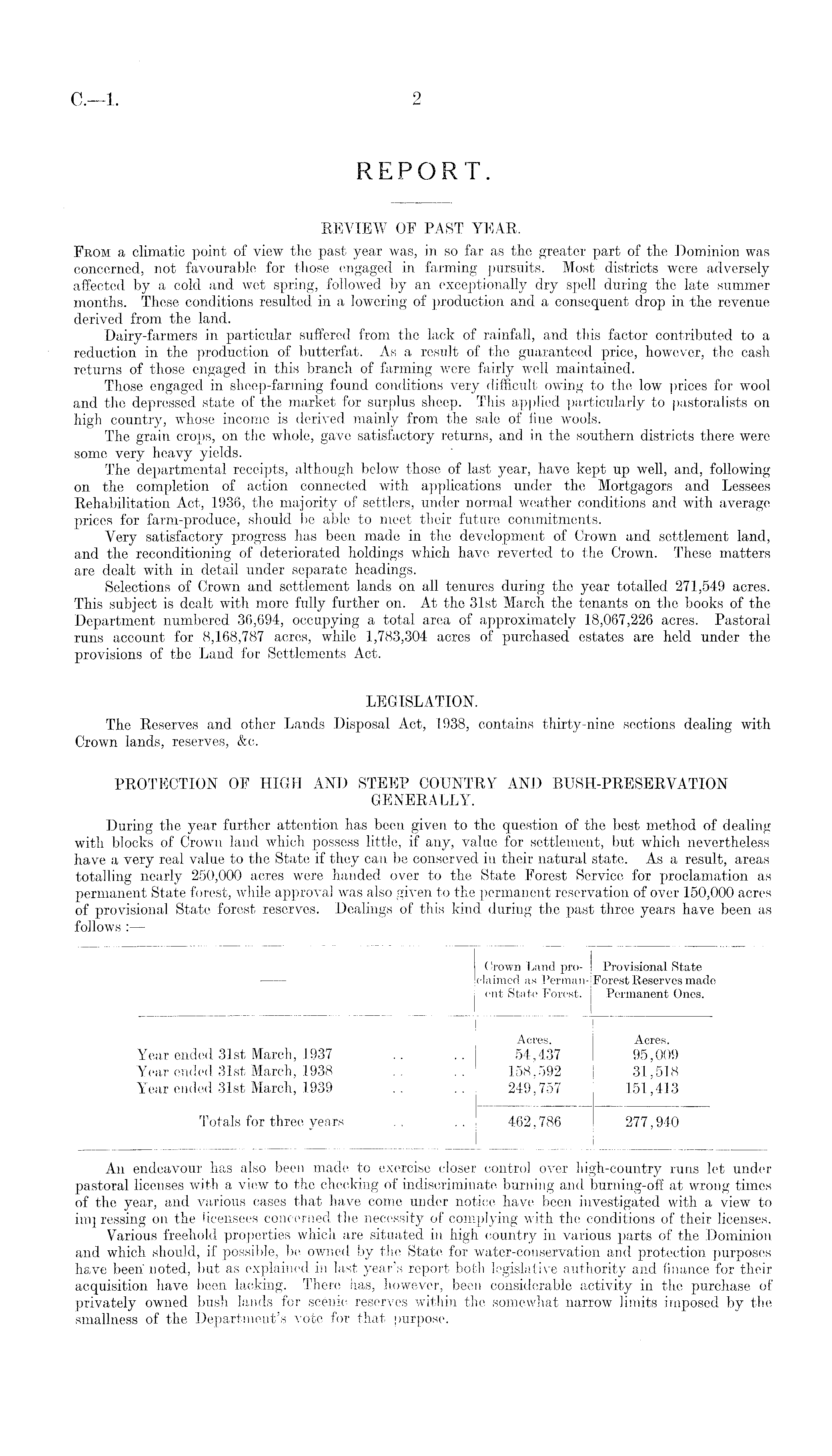 REVIEW OP PAST YEAR. Fkom a climatic point of view the past year was, in so far as the greater part of the Dominion was concerned, not favourable for those engaged in farming pursuits. Most districts were adversely affected by a cold and wet spring, followed by an exceptionally dry spell during the late summer months. These conditions resulted in a lowering of production and a consequent drop in the revenue derived from the land. Dairy-farmers in particular suffered from the lack of rainfall, and this factor contributed to a reduction in the production of butterfat. As a result of the guaranteed price, however, the cash returns of those engaged in this branch of farming were fairly well maintained. Those engaged in sheep-farming found conditions very difficult owing to the low prices for wool and the depressed state of the market for surplus sheep. This applied particularly to pastoralists on high country, whose income is derived mainly from the sale of fine wools. The grain crops, on the whole, gave satisfactory returns, and in the southern districts there were some very heavy yields. The departmental receipts, although below those of last year, have kept up well, and, following on the completion of action connected with applications under the Mortgagors and Lessees Rehabilitation Act, 1936, the majority of settlers, under normal weather conditions and with average prices for farm-produce, should be able to meet their future commitments. Very satisfactory progress has been made in the development of Crown and settlement land, and the reconditioning of deteriorated holdings which have reverted to the Crown. These matters are dealt with in detail under separate headings. Selections of Crown and settlement lands on all tenures during the year totalled 271,549 acres. This subject is dealt with more fully further on. At the 31st March the tenants on the books of the Department numbered 36,694, occupying a total area of approximately 18,067,226 acres. Pastoral runs account for 8,168,787 acres, while 1,783,304 acres of purchased estates are held under the provisions of the Land for Settlements Act. LEGISLATION. The Reserves and other Lands Disposal Act, 1938, contains thirty-nine sections dealing with Crown lands, reserves, &c. PROTECTION OF HIGH AND STEEP COUNTRY AND BUSH-PRESERVATION GENERALLY. During the year further attention has been given to the question of the best method of dealing with blocks of Crown land which possess little, if any, value for settlement, but which nevertheless have a very real value to the State if they can be conserved in their natural state. As a result, areas totalling nearly 250,000 acres were handed over to the State Forest Service for proclamation as permanent State forest, while approval was also given to the permanent reservation of over 150,000 acres of provisional State forest reserves. Dealings of this kind during the past three years have been as follows : —