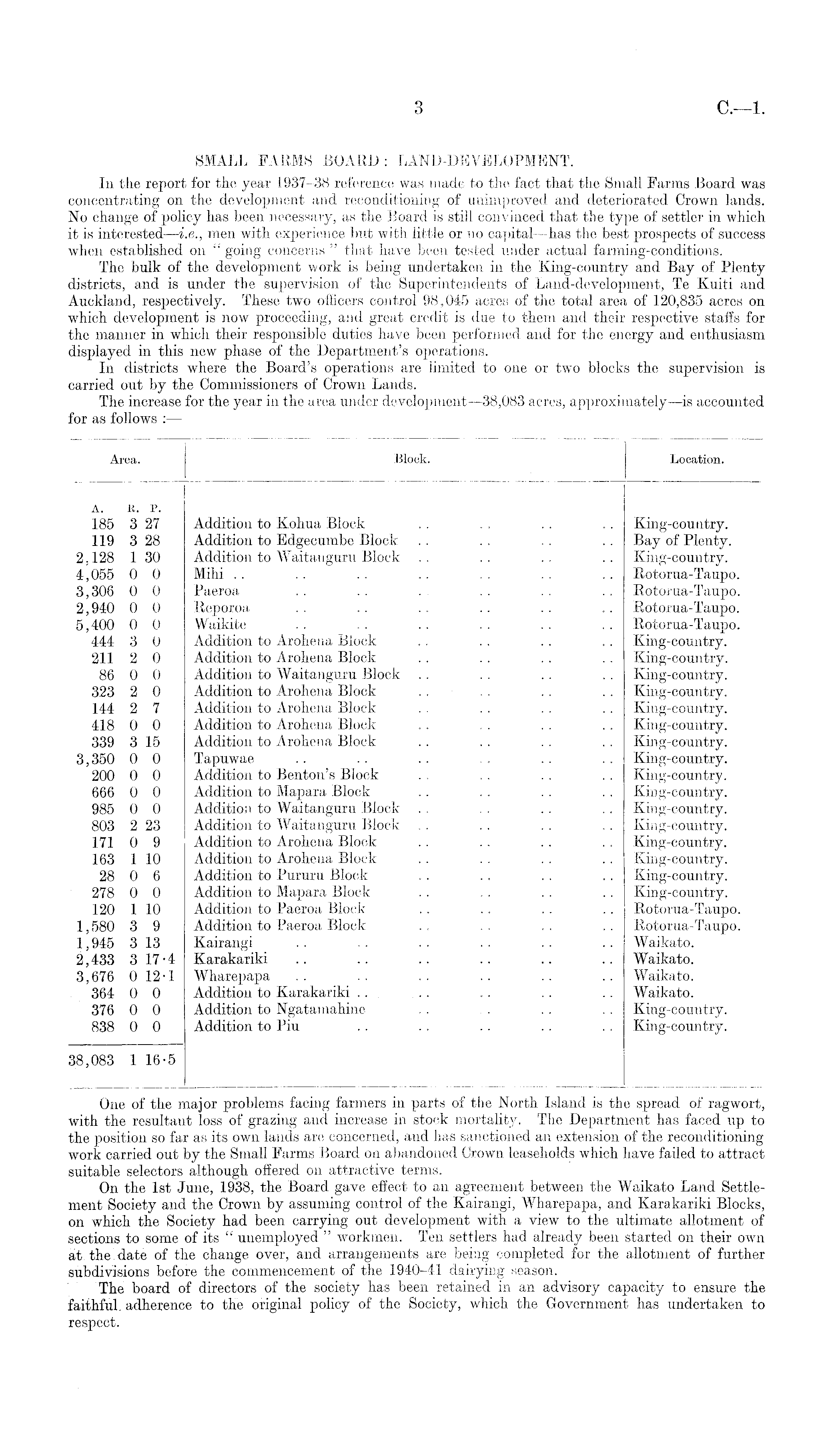 SMALL FARMS BOARD: LAND-DEVELOPMENT. In the report for the year 1937-38 reference was made to the fact that the Small Farms Board was concentrating on the development and reconditioning of unimproved and deteriorated Crown lands. No change of policy has been necessary, as the Board is still convinced that the type of settler in which it is interested—i.e., men with experience but with little or no capital —has the best prospects of success when established on " going concerns " that have been tested under actual farming-conditions. The bulk of the development work is being undertaken in the King-country and Bay of Plenty districts, and is under the supervision of the Superintendents of Land-development, Te Kuiti and Auckland, respectively. These two officers control 98,045 acres of the total area of 120,835 acres on which development is now proceeding, and great credit is due to them and their respective staffs for the manner in which their responsible duties have been performed and for the energy and enthusiasm displayed in this new phase of the Department's operations. In districts where the Board's operations are limited to one or two blocks the supervision is carried out by the Commissioners of Crown Lands. The increase for the year in the area under development—3B,oB3 acres, approximately —is accounted for as follows :—