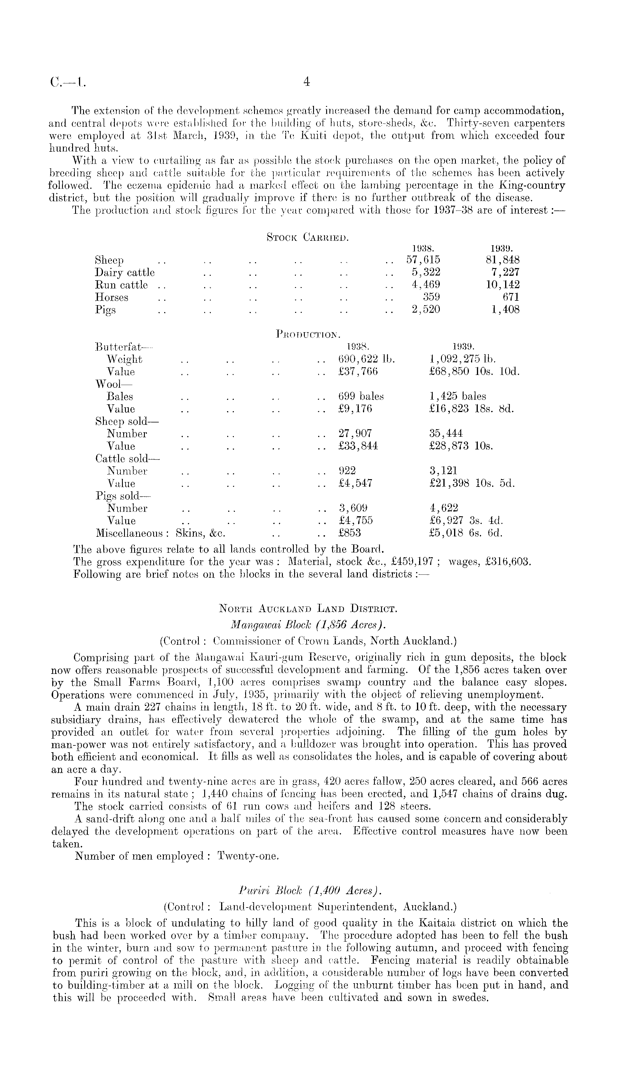 The extension of the development schemes greatly increased the demand for camp accommodation, and central depots were established for the building of huts, store-sheds, &c. Thirty-seven carpenters were employed at 31st March, 1939, in the Te Kuiti depot, the output from which exceeded four hundred huts. With a view to curtailing as far as possible the stock purchases on the open market, the policy of breeding sheep and cattle suitable for the particular requirements of the schemes has been actively followed. The eczema epidemic had a marked effect on the lambing percentage in the King-country district, but the position will gradually improve if there is no further outbreak of the disease. The production and stock figures for the year compared with those for 1937-38 are of interest: — Stock Carried. 1938. 1939. Sheep .. .. .. .. .. .. 57,615 81,848 Dairy cattle .. .. .. . . .. 5,322 7,227 Run cattle .. .. .. .. .. .. 4,469 10,142 Horses .. .. . . . . .. .. 359 671 Pigs .. .. .. .. .. .. 2,520 1,408 Production. Butterfat— 1938. 1939. Weight .. .. .. .. 690,622 Ib. 1,092,275 Ib. Value .. .. .. .. £37,766 £68,850 10s. lOd. WoolBales .. .. .. .. 699 bales 1,425 bales Value .. .. .. .. £9,176 £16,823 18s. Bd. Sheep sold— Number .. .. .. .. 27,907 35,444 Value .. .. .. .. £33,844 £28,873 10s. Cattle sold— Number .. .. .. ..922 3,121 Value .. .. .. .. £4,547 £21,398 10s. sd. Pigs sold — Number .. .. .. .. 3,609 4,622 Value .. .. .. .. £4,755 £6,927 3s. 4d. Miscellaneous: Skins, &c. .. .. £853 £5,018 6s. 6d. The above figures relate to all lands controlled by the Board. The gross expenditure for the year was : Material, stock &c., £459,197 ; wages, £316,603. Following are brief notes on the blocks in the several land districts: — North Auckland Land District. Mangawai Block (1,856 Acres). (Control: Commissioner of Crown Lands, North Auckland.) Comprising part of the Mangawai Kauri-gum Reserve, originally rich in gum deposits, the block now offers reasonable prospects of successful development and farming. Of the 1,856 acres taken over by the Small Farms Board, 1,100 acres comprises swamp country and the balance easy slopes. Operations were commenced in July, 1935, primarily with the object of relieving unemployment. A main drain 227 chains in length, 18 ft. to 20 ft. wide, and 8 ft. to 10 ft. deep, with the necessary subsidiary drains, has effectively dewatered the whole of the swamp, and at the same time has provided an outlet for water from several properties adjoining. The filling of the gum holes by man-power was not entirely satisfactory, and a bulldozer was brought into operation. This has proved both efficient and economical. It fills as well as consolidates the holes, and is capable of covering about an acre a day. Four hundred and twenty-nine acres are in grass, 420 acres fallow, 250 acres cleared, and 566 acres remains in its natural state ; 1,440 chains of fencing has been erected, and 1,547 chains of drains dug. The stock carried consists of 61 run cows and heifers and 128 steers. A sand-drift along one and a half miles of the sea-front has caused some concern and considerably delayed the development operations on part of the area. Effective control measures have now been taken. Number of men employed : Twenty-one. Puriri Block (1,400 Acres). (Control: Land-development Superintendent, Auckland.) This is a block of undulating to hilly land of good quality in the Kaitaia district on which the bush had been worked over by a timber company. The procedure adopted has been to fell the bush in the winter, bum and sow to permanent pasture in the following autumn, and proceed with fencing to permit of control of the pasture with sheep and cattle. Fencing material is readily obtainable from puriri growing on the block, and, in addition, a considerable number of logs have been converted to building-timber at a mill on the block. Logging of the unburnt timber has been put in hand, and this will be proceeded with. Small areas have been cultivated and sown in swedes.