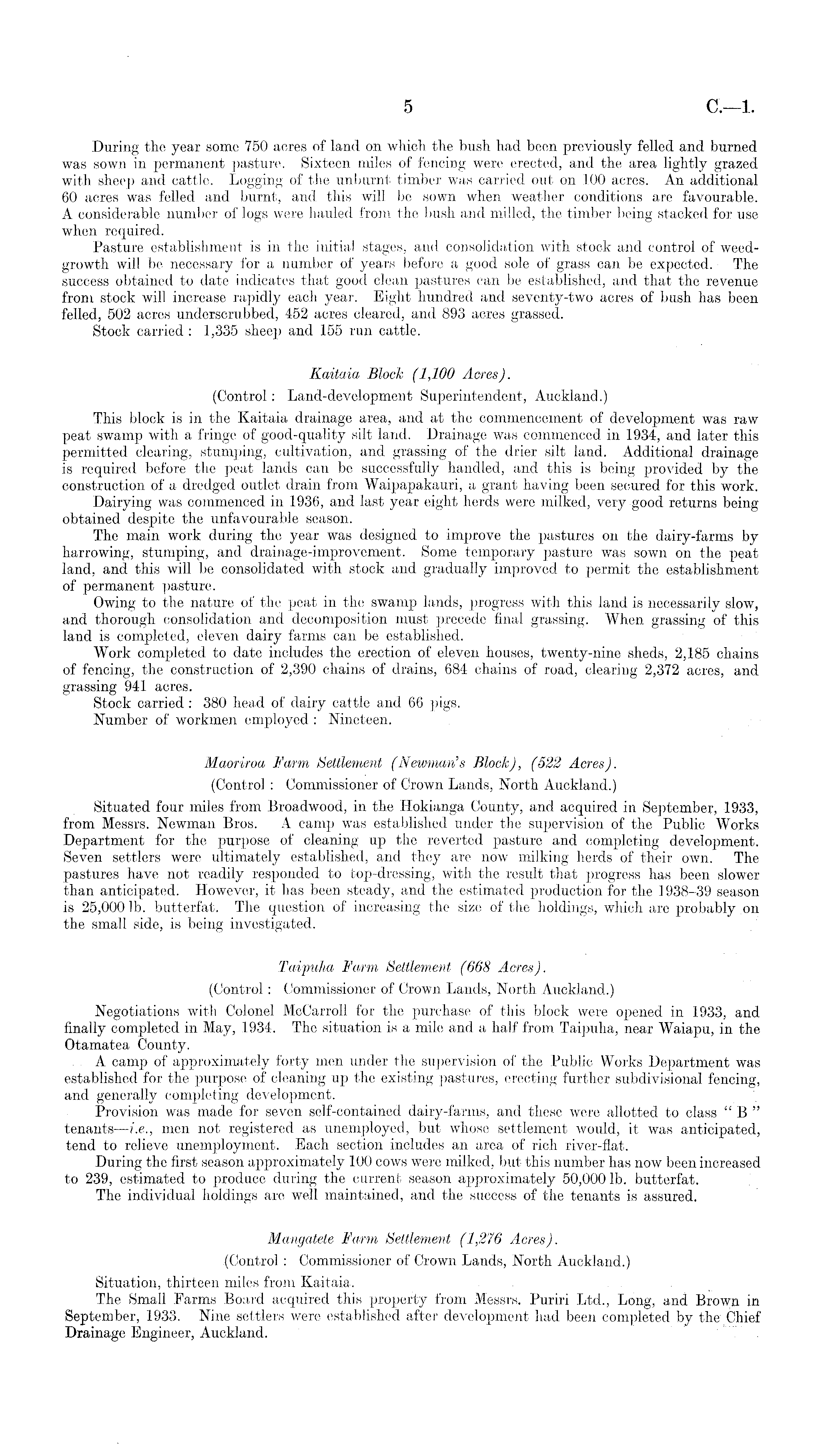 During the year some 750 acres of land on which the bush had been previously felled and burned was sown in permanent pasture. Sixteen miles of fencing were erected, and the area lightly grazed with sheep and cattle. Logging of the unburnt timber was carried out on 100 acres. An additional 60 acres was felled and burnt, and this will be sown when weather conditions are favourable. A considerable number of logs were hauled from the bush and milled, the timber being stacked for use when required. Pasture establishment is in the initial stages, and consolidation with stock and control of weedgrowth will be necessary for a number of years before a good sole of grass can be expected. The success obtained to date indicates that good clean pastures can be established, and that the revenue from stock will increase rapidly each year. Eight hundred and seventy-two acres of bush has been felled, 502 acres underscrubbed, 452 acres cleared, and 893 acres grassed. Stock carried : 1,335 sheep and 155 run cattle. Kaitaia Block (1,100 Acres). (Control: Land-development Superintendent, Auckland.) This block is in the Kaitaia drainage area, and at the commencement of development was raw peat swamp with a fringe of good-quality silt land. Drainage was commenced in 1934, and later this permitted clearing, stumping, cultivation, and grassing of the drier silt land. Additional drainage is required before the peat lands can be successfully handled, and this is being provided by the construction of a dredged outlet drain from Waipapakauri, a grant having been secured for this work. Dairying was commenced in 1936, and last year eight herds were milked, very good returns being obtained despite the unfavourable season. The main work during the year was designed to improve the pastures on the dairy-farms by harrowing, stumping, and drainage-improvement. Some temporary pasture was sown on the peat land, and this will be consolidated with stock and gradually improved to permit the establishment of permanent pasture. Owing to the nature of the peat in the swamp lands, progress with this land is necessarily slow, and thorough consolidation and decomposition must precede final grassing. When grassing of this land is completed, eleven dairy farms can be established. Work completed to date includes the erection of eleven houses, twenty-nine sheds, 2,185 chains of fencing, the construction of 2,390 chains of drains, 684 chains of road, clearing 2,372 acres, and grassing 941 acres. Stock carried: 380 head of dairy cattle and 66 pigs. Number of workmen employed : Nineteen. Maoriroa Farm Settlement (Newman's Block), (522 Acres). (Control : Commissioner of Crown Lands, North Auckland.) Situated four miles from Broadwood, in the Hokianga County, and acquired in September, 1933, from Messrs. Newman Bros. A camp was established under the supervision of the Public Works Department for the purpose of cleaning up the reverted pasture and completing development. Seven settlers were ultimately established, and they are now milking herds of their own. The pastures have not readily responded to top-dressing, with the result that progress has been slower than anticipated. However, it has been steady, and the estimated production for the 1938-39 season is 25,000 Jb. butterfat. The question of increasing the size of the holdings, which are probably on the small side, is being investigated. Taipuha Farm Settlement (668 Acres). (Control : Commissioner of Crown Lands, North Auckland.) Negotiations with Colonel McCarroll for the purchase of this block were opened in 1933, and finally completed in May, 1934. The situation is a mile and a half from Taipuha, near Waiapu, in the Otamatea County. A camp of approximately forty men under the supervision of the Public Works Department was established for the purpose of cleaning up the existing pastures, erecting further subdivisional fencing, and generally completing development. Provision was made for seven self-contained dairy-farms, and these were allotted to class " B " tenants —i.e., men not registered as unemployed, but whose settlement would, it was anticipated, tend to relieve unemployment. Each section includes an area of rich river-flat. During the first season approximately 100 cows were milked, but this number has now been increased to 239, estimated to produce during the current season approximately 50,000 lb. butterfat. The individual holdings are well maintained, and the success of the tenants is assured. Mangatete Farm Settlement (1,276 Acres). (Control : Commissioner of Crown Lands, North Auckland.) Situation, thirteen miles from Kaitaia. . . . The Small Farms Board acquired this property from Messrs. Puriri Ltd., Long, and Brown in September, 1933. Nine settlers were established after development had been completed by the' Chief Drainage Engineer, Auckland.