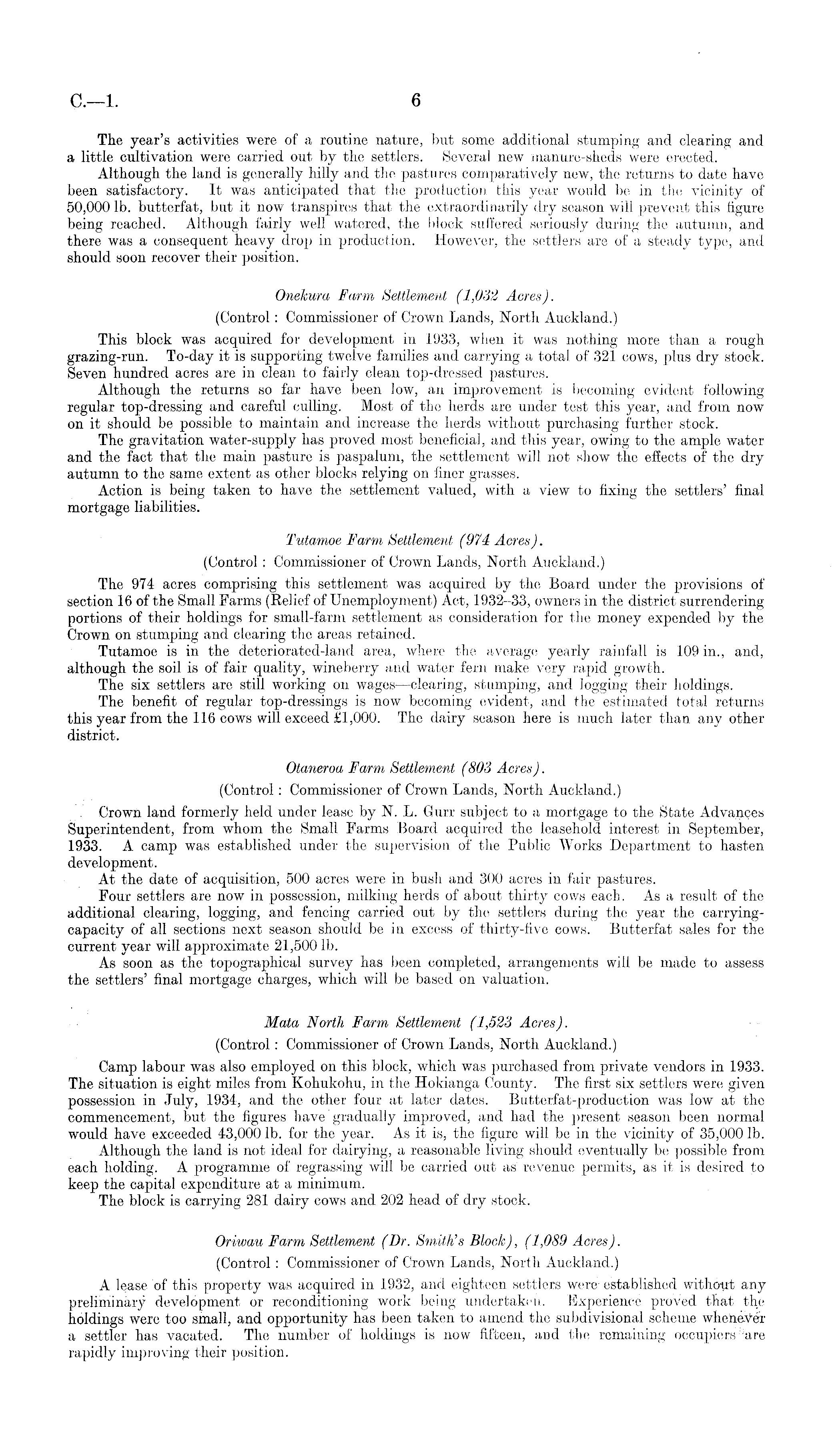 The year's activities were of a routine nature, but some additional stumping and clearing and a little cultivation were carried out by the settlers. Several new manure-sheds were erected. Although the land is generally hilly and the pastures comparatively new, the returns to date have been satisfactory. It was anticipated that the production this year would be in the vicinity of 50,000 lb. butterfat, but it now transpires that the extraordinarily dry season will prevent this figure being reached. Although fairly well watered, the block suffered seriously during the autumn, and there was a consequent heavy drop in production. However, the settlers are of a steady type, and should soon recover their position. Onekura Farm Settlement (1,032 Acres J. (Control: Commissioner of Crown Lands, North Auckland.) This block was acquired for development in 1933, when it was nothing more than a rough grazing-run. To-day it is supporting twelve families and carrying a total of 321 cows, plus dry stock. Seven hundred acres are in clean to fairly clean top-dressed pastures. Although the returns so far have been low, an improvement is becoming evident following regular top-dressing and careful culling. Most of the herds are under test this year, and from now on it should be possible to maintain and increase the herds without purchasing further stock. The gravitation water-supply has proved most beneficial, and this year, owing to the ample water and the fact that the main pasture is paspalum, the settlement will not show the effects of the dry autumn to the same extent as other blocks relying on finer grasses. Action is being taken to have the settlement valued, with a view to fixing the settlers' final mortgage liabilities. Tutamoe Farm Settlement (974 Acres). (Control: Commissioner of Crown Lands, North Auckland.) The 974 acres comprising this settlement was acquired by the Board under the provisions of section 16 of the Small Farms (Relief of Unemployment) Act, 1932-33, owners in the district surrendering portions of their holdings for small-farm settlement as consideration for the money expended by the Crown on stumping and clearing the areas retained. Tutamoe is in the deteriorated-land area, where the average yearly rainfall is 109 in., and, although the soil is of fair quality, wineberry and water fern make very rapid growth. The six settlers are still working on wages—clearing, stumping, and logging their holdings. The benefit of regular top-dressings is now becoming evident, and the estimated total returns this year from the 116 cows will exceed £1,000. The dairy season here is much later than any other district. Otaneroa Farm Settlement (803 Acres). (Control: Commissioner of Crown Lands, North Auckland.) - Crown land formerly held under lease by N. L. Gurr subject to a mortgage to the State Advances Superintendent, from whom the Small Farms Board acquired the leasehold interest in September, 1933. A camp was established under the supervision of the Public Works Department to hasten development. At the date of acquisition, 500 acres were in bush and 300 acres in fair pastures. Four settlers are now in possession, milking herds of about thirty cows each. As a result of the additional clearing, logging, and fencing carried out by the settlers during the year the carryingcapacity of all sections next season should be in excess of thirty-five cows. Butterfat sales for the current year will approximate 21,500 lb. As soon as the topographical survey has been completed, arrangements will be made to assess the settlers' final mortgage charges, which will be based on valuation. Mata North Farm Settlement (1,523 Acres). (Control: Commissioner of Crown Lands, North Auckland.) Camp labour was also employed on this block, which was purchased from private vendors in 1933. The situation is eight miles from Kohukohu, in the Hokianga County. The first six settlers were given possession in July, 1934, and the other four at later dates. Butterfat-production was low at the commencement, but the figures have gradually improved, and had the present season been normal would have exceeded 43,0001b. for the year. As it is, the figure will be in the vicinity of 35,0001b. Although the land is not ideal for dairying, a reasonable living should eventually be possible from each holding. A programme of regrassing will be carried out as revenue permits, as it is desired to keep the capital expenditure at a minimum. The block is carrying 281 dairy cows and 202 head of dry stock. Oriwau Farm Settlement (Dr. Smith's Block), (1,089 Acres). (Control : Commissioner of Crown Lands, North Auckland.) A lease of this property was acquired in 1932, and eighteen settlers were- established without any preliminary development or reconditioning work being undertaken. Experience proved that the holdings were too small, and opportunity has been taken to amend the subdivisional scheme whenever a settler has vacated. The number of holdings is now fifteen, and the remaining occupiers 'are rapidly improving their position.