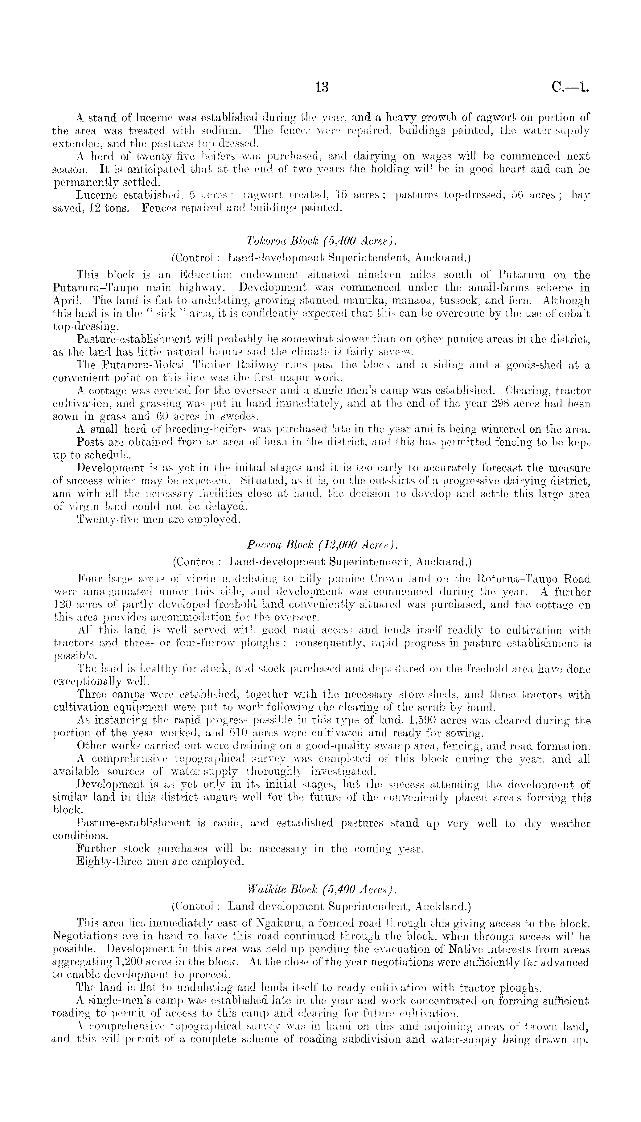 A stand of lucerne was established during the year, and a heavy growth of ragwort on portion of the area was treated with sodium. The fences were repaired, buildings painted, the water-supply extended, and the pastures top-dressed. A herd of twenty-five heifers was purchased, and dairying on wages will be commenced next season. It is anticipated that at the end of two years the holding will be in good heart and can be permanently settled. Lucerne established, 5 acres ; ragwort treated, 15 acres ; pastures top-dressed, 56 acres ; hay saved, 12 tons. Fences repaired and buildings painted. Tokoroa Block (5,400 Acres). (Control : Land-development Superintendent, Auckland.) This block is an Education endowment situated nineteen miles south of Putaruru on the Putaruru-Taupo main highway. Development was commenced under the small-farms scheme in April. The land is flat to undulating, growing stunted manuka, manaoa, tussock, and fern. Although this land is in the " sick " area, it is confidently expected that this can be overcome by the use of cobalt top-dressing. Pasture-establishment will probably be somewhat slower than on other pumice areas in the district, as the land has little natural humus and the climate is fairly severe. The Putaruru-Mokai Timber Railway runs past the block and a siding and a goods-shed at a convenient point on this line was the first major work. A cottage was erected for the overseer and a single-men's camp was established. Clearing, tractor cultivation, and grassing was put in hand immediately, and at the end of the year 298 acres had been sown in grass and 60 acres in swedes. A small herd of breeding-heifers was purchased late in the year and is being wintered on the area. Posts are obtained from an area of bush in the district, and this has permitted fencing to be kept up to schedule. Development is as yet in the initial stages and it is too early to accurately forecast the measure of success which may be expected. Situated, as it is, on the outskirts of a progressive dairying district, and with all the necessary facilities close at hand, the decision to develop and settle this large area of virgin land could not be delayed. Twenty-five men are employed. Paeroa Block (12,000 Acres). (Control : Land-development Superintendent, Auckland.) Four large areas of virgin undulating to hilly pumice Crown land on the Rotorua-Taupo Road were amalgamated under this title, and development was commenced during the year. A further 120 acres of partly developed freehold land conveniently situated was purchased, and the cottage on this area provides accommodation for the overseer. All this land is well served with good road access and lends itself readily to cultivation with tractors and three- or four-furrow ploughs ; consequently, rapid progress in pasture establishment is possible. The land is healthy for stock, and stock purchased and depastured on the freehold area have done exceptionally well. Three camps were established, together with the necessary store-sheds, and three tractors with cultivation equipment were put to work following the clearing of the scrub by hand. As instancing the rapid progress possible in this type of land, 1,590 acres was cleared during the portion of the year worked, and 510 acres were cultivated and ready for sowing. Other works carried out were draining on a good-quality swamp area, fencing, and road-formation. A comprehensive topographical survey was completed of this block during the year, and all available sources of water-supply thoroughly investigated. Development is as yet only in its initial stages, but the success attending the development of similar land in this district augurs well for the future of the conveniently placed areas forming this block. Pasture-establishment is rapid, and established pastures stand up very well to dry weather conditions. Further stock purchases will be necessary in the coming year. Eighty-three men are employed. Waikite Block (5,400 Acres). (Control : Land-development Superintendent, Auckland.) This area lies immediately east of Ngakuru, a formed road through this giving access to the block. Negotiations are in hand to have this road continued through the block, when through access will be possible. Development in this area was held up pending the evacuation of Native interests from areas aggregating 1,200 acres in the block. At the close of the year negotiations were sufficiently far advanced to enable development to proceed. The land is flat to undulating and lends itself to ready cultivation with tractor ploughs. A single-men's camp was established late in the year and work concentrated on forming sufficient roading to permit of access to this camp and clearing for future cultivation. A comprehensive topographical survey was in hand on this and adjoining areas of Crown land, and this will permit of a complete scheme of roading subdivision and water-supply being drawn up.