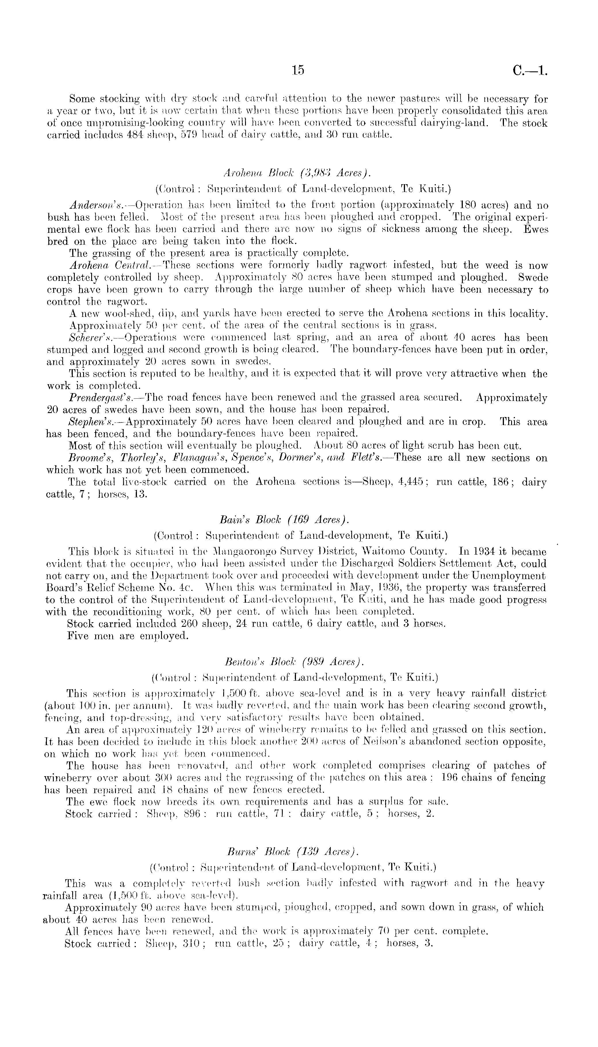 Some stocking with dry stock and careful attention to the newer pastures will be necessary for a year or two, but it is now certain that when these portions have been properly consolidated this area of once unpromising-looking country will have been converted to successful dairying-land. The stock carried includes 484 sheep, 579 head of dairy cattle, and 30 run cattle. Arohena Block (3,983 Acres). (Control: Superintendent of Land-development, Te Kuiti.) Anderson's .—Operation has been limited to the front portion (approximately 180 acres) and no bush has been felled. Most of the present area has been ploughed and cropped. The original experimental ewe flock has been carried and there are now no signs of sickness among the sheep. Ewes bred on the place are being taken into the flock. The grassing of the present area is practically complete. Arohena Central. —These sections were formerly badly ragwort infested, but the weed is now completely controlled by sheep. Approximately 80 acres have been stumped and ploughed. Swede crops have been grown to carry through the large number of sheep which have been necessary to control the ragwort. A new wool-shed, dip, and yards have been erected to serve the Arohena sections in this locality. Approximately 50 per cent, of the area of the central sections is in grass. Scherer's. —Operations were commenced last spring, and an area of about 40 acres has been stumped and logged and second growth is being cleared. The boundary-fences have been put in order, and approximately 20 acres sown in swedes. This section is reputed to be healthy, and it is expected that it will prove very attractive when the work is completed. Prendergast's. —The road fences have been renewed and the grassed area secured. Approximately 20 acres of swedes have been sown, and the house has been repaired. Stephen's.—Approximately 50 acres have been cleared and ploughed and are in crop. This area has been fenced, and the boundary-fences have been repaired. Most of this section will eventually be ploughed. About 80 acres of light scrub has been cut. Broome's, Thorley's, Flanagan's, Spence's, Dormer's, and Flett's.—These are all new sections on which work has not yet been commenced. The total live-stock carried on the Arohena sections is—Sheep, 4,445; run cattle, 186; dairy cattle, 7; horses, 13. Bain's Block (169 Acres). (Control: Superintendent of Land-development, Te Kuiti.) This block is situated in the Mangaorongo Survey District, Waitomo County. In 1934 it became evident that the occupier, who had been assisted under the Discharged Soldiers Settlement Act, could not carry on, and the Department took over and proceeded with development under the Unemployment Board's Relief Scheme No. 4c. When this was terminated in May, 1936, the property was transferred to the control of the Superintendent of Land-development, Te Kuiti, and he has made good progress with the reconditioning work, 80 per cent, of which has been completed. Stock carried included 260 sheep, 24 run cattle, 6 dairy cattle, and 3 horses. Five men are employed. Benton's Block (989 Acres). (Control : Superintendent of Land-development, Te Kuiti.) This section is approximately 1,500 ft. above sea-level and is in a very heavy rainfall district (about 100 in. per annum). It was badly reverted, and the main work has been clearing second growth, fencing, and top-dressing, and very satisfactory results have been obtained. An area of approximately 120 acres of wineberry remains to be felled and grassed on this section. It has been decided to include in this block another 200 acres of Neilson's abandoned section opposite, on which no work has yet been commenced. The house has been renovated, and other work completed comprises clearing of patches of wineberry over about 300 acres and the regrassing of the patches on this area ; 196 chains of fencing has been repaired and 18 chains of new fences erected. The ewe flock now breeds its own requirements and has a surplus for sale. Stock carried : Sheep, 896 : run cattle, 71 ; dairy cattle, 5 ; horses, 2. Burns' Block (139 Acres). (Control : Superintendent of Land-development, Te Kuiti.) This was a completely reverted bush section badly infested with ragwort and in the heavy rainfall area (1,500 ft. above sea-level). Approximately 90 acres have been stumped, ploughed, cropped, and sown down in grass, of which about 40 acres has been renewed. All fences have been renewed, and the work is approximately 70 per cent, complete. . Stock carried : Sheep, 310 ; run cattle, 25 ; dairy cattle, 4 ; horses, 3.