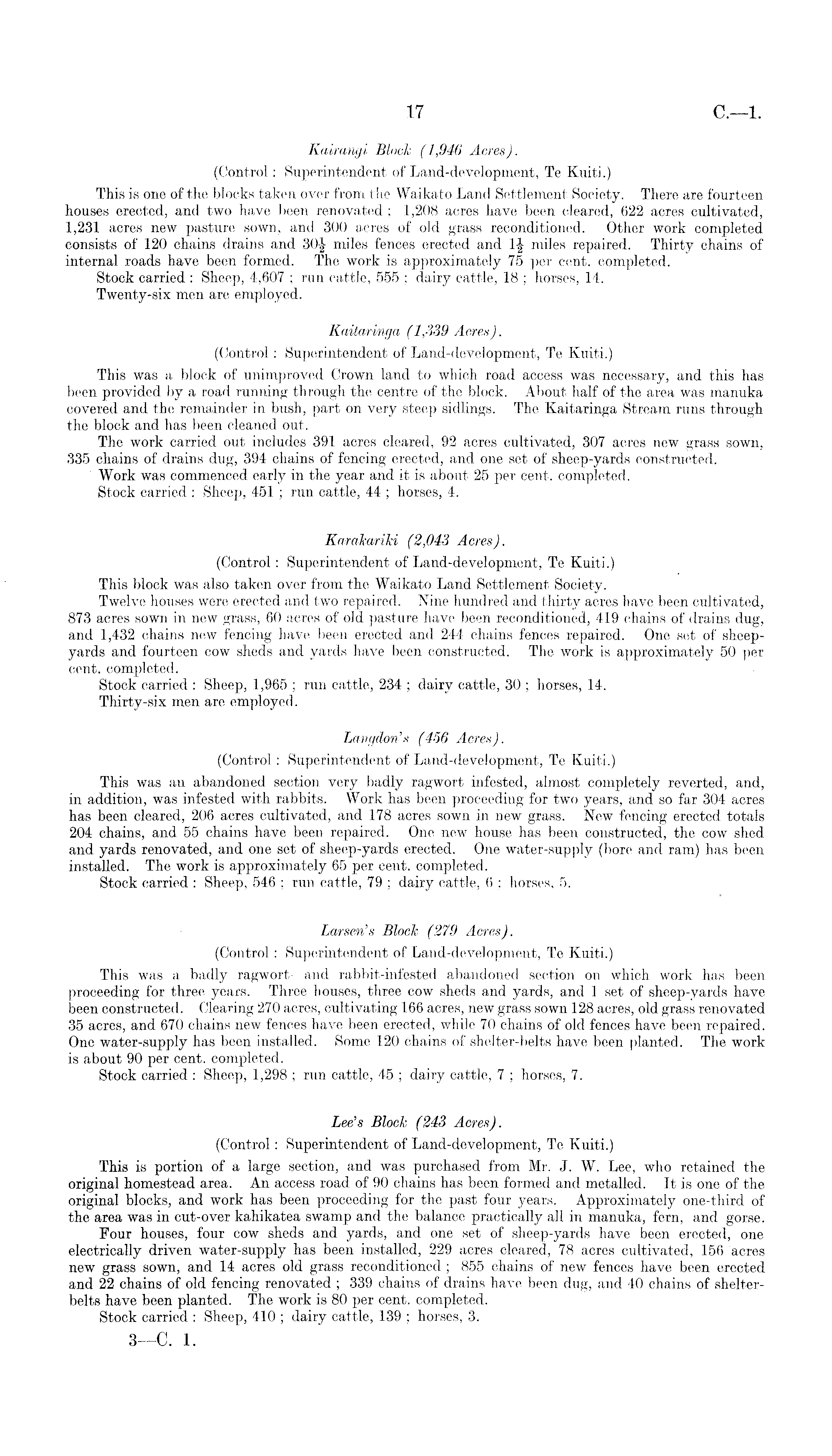 Kairangi Block (1,946 Acres J. (Control: Superintendent of Land-development, Te Kuiti.) This is one of the blocks taken over from the Waikato Land Settlement Society. There are fourteen houses erected, and two have been renovated ; 1,208 acres have been cleared, 622 acres cultivated, 1,231 acres new pasture sown, and 300 acres of old grass reconditioned. Other work completed consists of 120 chains drains and miles fences erected and 1-J- miles repaired. Thirty chains of internal roads have been formed. The work is approximately 75 per cent, completed. Stock carried : Sheep, 4,607 ; run cattle, 555 ; dairy cattle, 18 ; horses, 14. Twenty-six men are employed. Kaitaringa (1,339 Acres). (Control : Superintendent of Land-development, Te Kuiti.) This was a block of unimproved Crown land to which road access was necessary, and this has been provided by a road running through the centre of the block. About half of the area was manuka covered and the remainder in bush, part on very steep sidlings. The Kaitaringa Stream runs through the block and has been cleaned out. The work carried out includes 391 acres cleared, 92 acres cultivated, 307 acres new grass sown, 335 chains of drains dug, 394 chains of fencing erected, and one set of sheep-yards constructed. Work was commenced early in the year and it is about 25 per cent, completed. Stock carried : Sheep, 451 ; run cattle, 44 ; horses, 4. Karakariki (2,043 Acres J. (Control: Superintendent of Land-development, Te Kuiti.) This block was also taken over from the Waikato Land Settlement Society. Twelve houses were erected and two repaired. Nine hundred and thirty acres have been cultivated, 873 acres sown in new grass, 60 acres of old pasture have been reconditioned, 419 chains of drains dug, and 1,432 chains new fencing have been erected and 244 chains fences repaired. One set of sheepyards and fourteen cow sheds and yards have been constructed. The work is approximately 50 per cent, completed. Stock carried : Sheep, 1,965 ; run cattle, 234 ; dairy cattle, 30 ; horses, 14. Thirty-six men are employed. Langdon's (456 Acres J. (Control : Superintendent of Land-development, Te Kuiti.) This was an abandoned section very badly ragwort infested, almost completely reverted, and, in addition, was infested with rabbits. Work has been proceeding for two years, and so far 304 acres has been cleared, 206 acres cultivated, and 178 acres sown in new grass. New fencing erected totals 204 chains, and 55 chains have been repaired. One new house has been constructed, the cow shed and yards renovated, and one set of sheep-yards erected. One water-supply (bore and ram) has been installed. The work is approximately 65 per cent, completed. Stock carried : Sheep, 546 ; run cattle, 79 ; dairy cattle, 6 ; horses, 5. Larsen's Block (279 Acres). (Control : Superintendent of Land-development, Te Kuiti.) This was a badly ragwort- and rabbit-infested abandoned section on which work has been proceeding for three years. Three houses, three cow sheds and yards, and 1 set of sheep-yards have been constructed. Clearing 270 acres, cultivating 166 acres, new grass sown 128 acres, old grass renovated 35 acres, and 670 chains new fences have been erected, while 70 chains of old fences have been repaired. One water-supply has been installed. Some 120 chains of shelter-belts have been planted. The work is about 90 per cent, completed. Stock carried : Sheep, 1,298 ; run cattle, 45 ; dairy cattle, 7 ; horses, 7. Lee's Block (243 Acres). (Control: Superintendent of Land-development, Te Kuiti.) This is portion of a large section, and was purchased from Mr. J. W. Lee, who retained the original homestead area. An access road of 90 chains has been formed and metalled. It is one of the original blocks, and work has been proceeding for the past four years. Approximately one-third of the area was in cut-over kahikatea swamp and the balance practically all in manuka, fern, and gorse. Four houses, four cow sheds and yards, and one set of sheep-yards have been erected, one electrically driven water-supply has been installed, 229 acres cleared, 78 acres cultivated, 156 acres new grass sown, and 14 acres old grass reconditioned ; 855 chains of new fences have been erected and 22 chains of old fencing renovated ; 339 chains of drains have been dug, and 40 chains of shelterbelts have been planted. The work is 80 per cent, completed. Stock carried : Sheep, 410 ; dairy cattle, 139 ; horses, 3.