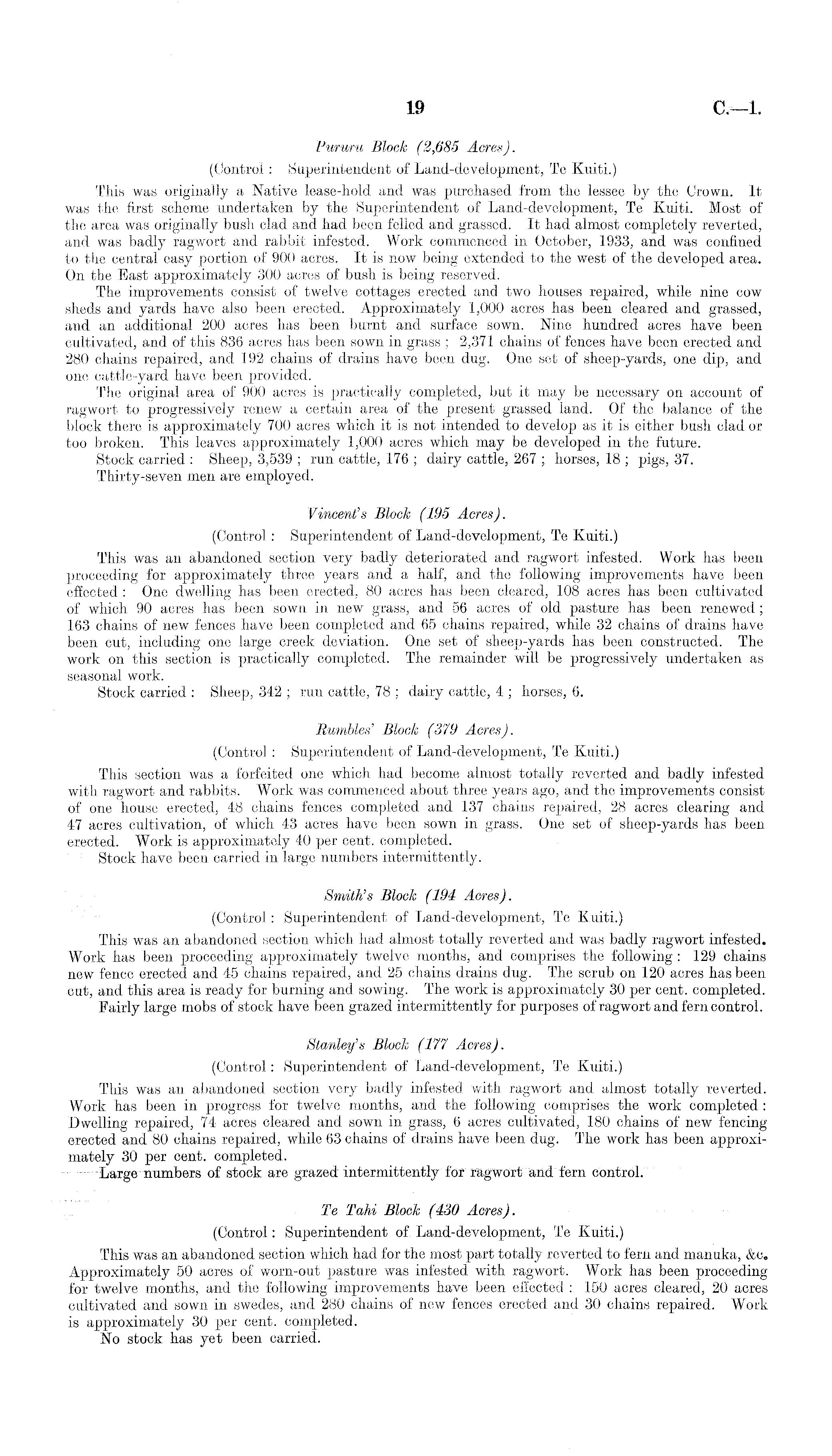 Pururu Block (2,685 Acres). (Control: Superintendent of Land-development, Te Kuiti.) This was originally a Native lease-hold and was purchased from the lessee by the Crown. It was the first scheme undertaken by the Superintendent of Land-development, Te Kuiti. Most of the area was originally bush clad and had been felled and grassed. It had almost completely reverted, and was badly ragwort and rabbit infested. Work commenced in October, 1933, and was confined to the central easy portion of 900 acres. It is now being extended to the west of the developed area. On the East approximately 300 acres of bush is being reserved. The improvements consist of twelve cottages erected and two houses repaired, while nine cow sheds and yards have also been erected. Approximately 1,000 acres has been cleared and grassed, and an additional 200 acres has been burnt and surface sown. Nine hundred acres have been cultivated, and of this 836 acres has been sown in grass ; 2,371 chains of fences have been erected and 280 chains repaired, and 192 chains of drains have been dug. One set of sheep-yards, one dip, and one cattle-yard have been provided. The original area of 900 acres is practically completed, but it may be necessary on account of ragwort to progressively renew a certain area of the present grassed land. Of the balance of the block there is approximately 700 acres which it is not intended to develop as it is either bush clad or too broken. This leaves approximately 1,000 acres which may be developed in the future. Stock carried : Sheep, 3,539 ; run cattle, 176 ; dairy cattle, 267 ; horses, 18 ; pigs, 37. Thirty-seven men are employed. Vincent's Block (195 Acres). (Control: Superintendent of Land-development, Te Kuiti.) This was an abandoned section very badly deteriorated and ragwort infested. Work has been proceeding for approximately three years and a half, and the following improvements have been effected : One dwelling has been erected, 80 acres has been cleared, 108 acres has been cultivated of which 90 acres has been sown in new grass, and 56 acres of old pasture has been renewed ; 163 chains of new fences have been completed and 65 chains repaired, while 32 chains of drains have been cut, including one large creek deviation. One set of sheep-yards has been constructed. The work on this section is practically completed. The remainder will be progressively undertaken as seasonal work. Stock carried : Sheep, 342 ; run cattle, 78 ; dairy cattle, 4 ; horses, 6. Rumbles' Block (379 Acres). (Control: Superintendent of Land-development, Te Kuiti.) This section was a forfeited one which had become almost totally reverted and badly infested with ragwort and rabbits. Work was commenced about three years ago, and the improvements consist of one house erected, 48 chains fences completed and 137 chains repaired, 28 acres clearing and 47 acres cultivation, of which 4-3 acres have been sown in grass. One set of sheep-yards has been erected. Work is approximately 40 per cent, completed. Stock have been carried in large numbers intermittently. Smith's Block (194 Acres). (Control: Superintendent of Land-development, Te Kuiti.) This was an abandoned section which had almost totally reverted and was badly ragwort infested. Work has been proceeding approximately twelve months, and comprises the following : 129 chains new fence erected and 45 chains repaired, and 25 chains drains dug. The scrub on 120 acres has been cut, and this area is ready for burning and sowing. The work is approximately 30 per cent, completed. Fairly large mobs of stock have been grazed intermittently for purposes of ragwort and fern control. Stanley's Block (177 Acres). (Control: Superintendent of Land-development, Te Kuiti.) This was an abandoned section very badly infested with ragwort and almost totally reverted. Work has been in progress for twelve months, and the following comprises the work completed : Dwelling repaired, 74 acres cleared and sown in grass, 6 acres cultivated, 180 chains of new fencing erected and 80 chains repaired, while 63 chains of drains have been dug. The work has been approximately 30 per cent, completed. —Large numbers of stock are grazed intermittently for ragwort and" fern control. Te Tahi Block (430 Acres). (Control: Superintendent of Land-development, Te Kuiti.) This was an abandoned section which had for the most part totally reverted to fern and manuka, &c. Approximately 50 acres of worn-out pasture was infested with ragwort. Work has been proceeding for twelve months, and the following improvements have been effected : 150 acres cleared, 20 acres cultivated and sown in swedes, and 280 chains of new fences erected and 30 chains repaired. Work is approximately 30 per cent, completed. No stock has yet been carried.