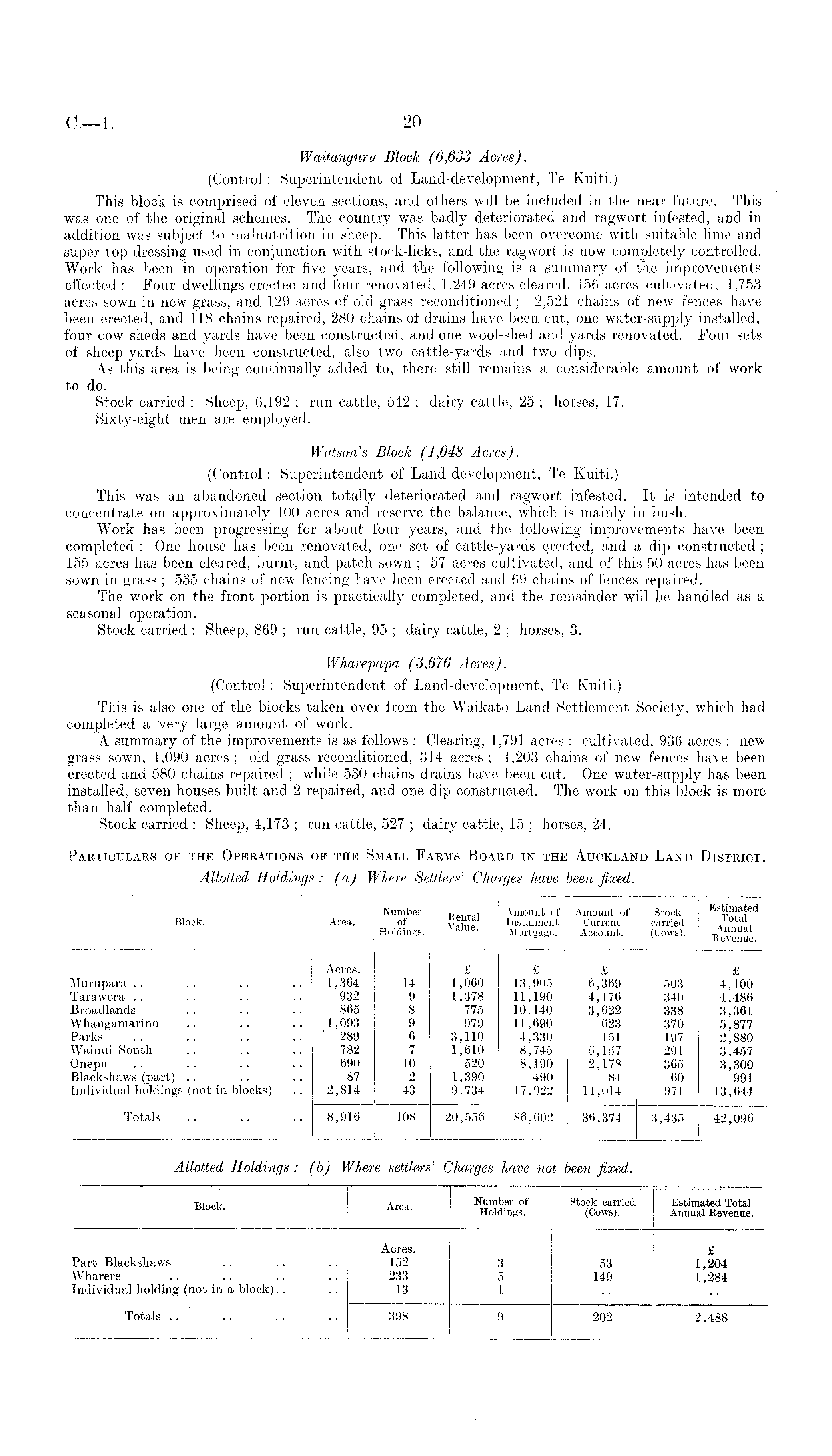 Waitanguru Block (6,633 Acres). (Control: Superintendent of Land-development, Te Kuiti.) This block is comprised of eleven sections, and others will be included in the near future. This was one of the original schemes. The country was badly deteriorated and ragwort infested, and in addition was subject to malnutrition in sheep. This latter has been overcome with suitable lime and super top-dressing used in conjunction with stock-licks, and the ragwort is now completely controlled. Work has been in operation for five years, and the following is a summary of the improvements effected : Four dvrellings erected and four renovated, 1,249 acres cleared, 456 acres cultivated, 1,753 acres sown in new grass, and 129 acres of old grass reconditioned; 2,521 chains of new fences have been erected, and 118 chains repaired, 280 chains of drains have been cut, one water-supply installed, four cow sheds and yards have been constructed, and one wool-shed and yards renovated. Four sets of sheep-yards have been constructed, also two cattle-yards and two dips. As this area is being continually added to, there still remains a considerable amount of work to do. Stock carried : Sheep, 6,192 ; run cattle, 542 ; dairy cattle, 25 ; horses, 17. Sixty-eight men are employed. Watson's Block (1,048 Acres). (Control: Superintendent of Land-development, Te Kuiti.) This was an abandoned section totally deteriorated and ragwort infested. It is intended to concentrate on approximately 400 acres and reserve the balance, which is mainly in bush. Work has been progressing for about four years, and the following improvements have been completed : One house has been renovated, one set of cattle-yards erected, and a dip constructed ; 155 acres has been cleared, burnt, and patch sown ; 57 acres cultivated, and of this 50 acres has been sown in grass ; 535 chains of new fencing have been erected and 69 chains of fences repaired. The work on the front portion is practically completed, and the remainder will be handled as a seasonal operation. Stock carried : Sheep, 869 ; run cattle, 95 ; dairy cattle, 2 ; horses, 3. Wharepapa (3,676 Acres). (Control: Superintendent of Land-development, Te Kuiti.) This is also one of the blocks taken over from the Waikato Land Settlement Society, which had completed a very large amount of work. A summary of the improvements is as follows : Clearing, 1,791 acres ; cultivated, 936 acres ; new grass sown, 1,090 acres ; old grass reconditioned, 314 acres ; .1,203 chains of new fences have been erected and 580 chains repaired ; while 530 chains drains have been cut. One water-supply has been installed, seven houses built and 2 repaired, and one dip constructed. The work on this block is more than half completed. Stock carried : Sheep, 4,173 ; run cattle, 527 ; dairy cattle, 15 ; horses, 24.