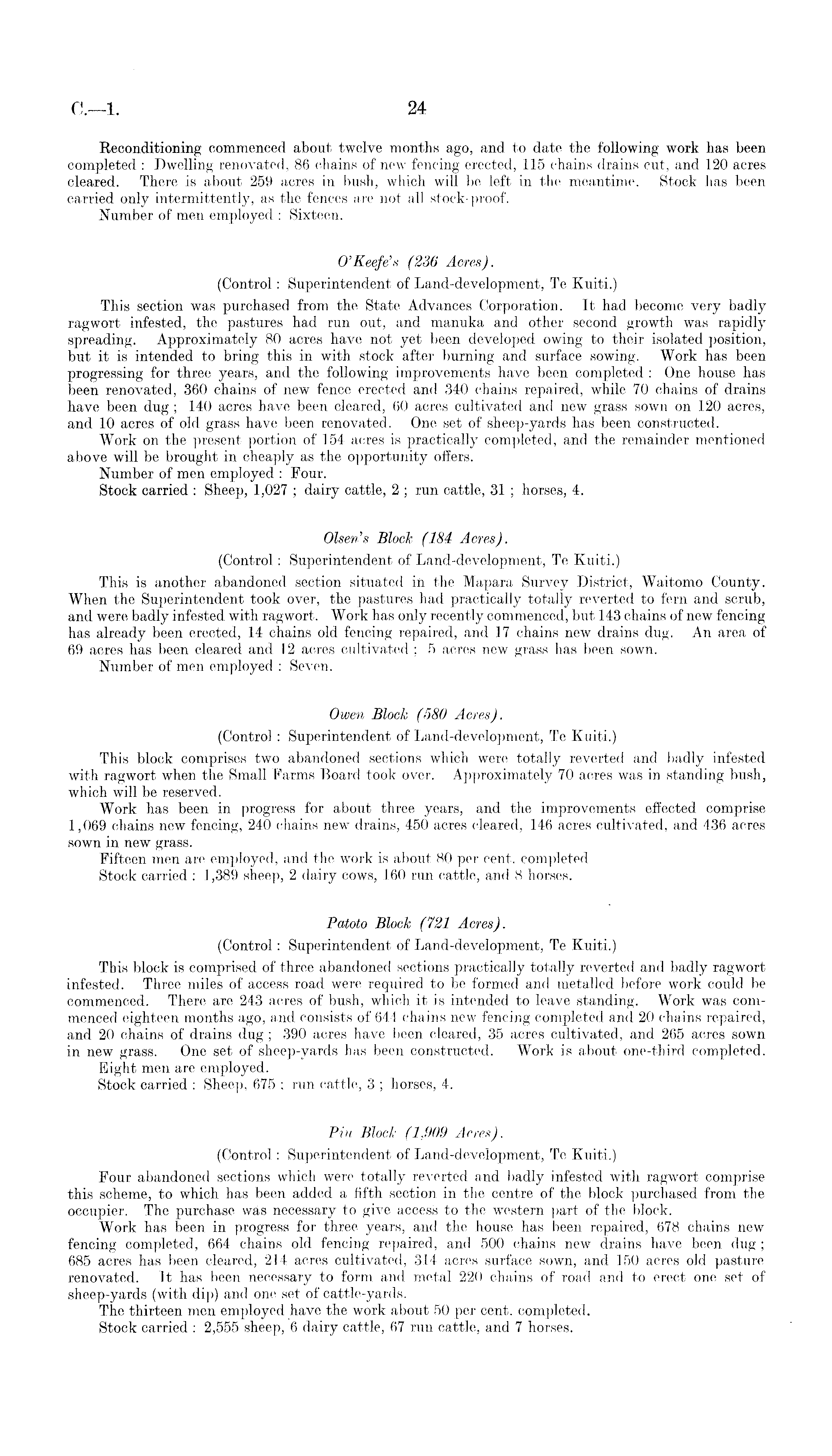 Keconditioning commenced about twelve months ago, and to date the following work has been completed : Dwelling renovated, 86 chains of new fencing erected, 115 chains drains cut, and 120 acres cleared. There is about 259 acres in bush, which will be left in the meantime. Stock has been carried only intermittently, as the fences are not all stock-proof. Number of men employed : Sixteen. O'Keefe's (236 Acres). (Control: Superintendent of Land-development, Te Kuiti.) This section was purchased from the State Advances Corporation. It had become very badly ragwort infested, the pastures had run out, and manuka and other second growth was rapidly spreading. Approximately 80 acres have not yet been developed owing to their isolated position, but it is intended to bring this in with stock after burning and surface sowing. Work has been progressing for three years, and the following improvements have been completed : One house has been renovated, 360 chains of new fence erected and 340 chains repaired, while 70 chains of drains have been dug ; 140 acres have been cleared, 60 acres cultivated and new grass sown on 120 acres, and 10 acres of old grass have been renovated. One set of sheep-yards has been constructed. Work on the present portion of 154 acres is practically completed, and the remainder mentioned above will be brought in cheaply as the opportunity offers. Number of men employed : Four. Stock carried : Sheep, 1,027 ; dairy cattle, 2 ; run cattle, 31 ; horses, 4. Olsen's Block (184 Acres). (Control: Superintendent of Land-development, Te Kuiti.) This is another abandoned section situated in the Mapara Survey District, Waitomo County. When the Superintendent took over, the pastures had practically totally reverted to fern and scrub, and were badly infested with ragwort. Work has only recently commenced, but 143 chains of new fencing has already been erected, 14 chains old fencing repaired, and 17 chains new drains dug. An area of 69 acres has been cleared and 12 acres cultivated ; 5 acres new grass has been sown. Number of men employed : Seven. Owen Block (580 Acres). (Control: Superintendent of Land-development, Te Kuiti.) This block comprises two abandoned sections which were totally reverted and badly infested with ragwort when the Small Farms Board took over. Approximately 70 acres was in standing bush, which will be reserved. Work has been in progress for about three years, and the improvements effected comprise 1,069 chains new fencing, 240 chains new drains, 450 acres cleared, 146 acres cultivated, and 436 acres sown in new grass. Fifteen men are employed, and the work is about 80 per cent, completed Stock carried : 1,389 sheep, 2 dairy cows, 160 run cattle, and 8 horses. Patoto Block (721 Acres). (Control: Superintendent of Land-development, Te Kuiti.) This block is comprised of three abandoned sections practically totally reverted and badly ragwort infested. Three miles of access road were required to be formed and metalled before work could be commenced. There are 243 acres of bush, which it is intended to leave standing. Work was commenced eighteen months ago, and consists of 644 chains new fencing completed and 20 chains repaired, and 20 chains of drains dug ; 390 acres have been cleared, 35 acres cultivated, and 265 acres sown in new grass. One set of sheep-yards has been constructed. Work is about one-third completed. Eight men are employed. Stock carried : Sheep, 675 ; run cattle, 3 ; horses, 4. Piu Block (1,909 Acres). (Control : Superintendent of Land-development, Te Kuiti.) Four abandoned sections which were totally reverted and badly infested with ragwort comprise this scheme, to which has been added a fifth section in the centre of the block purchased from the occupier. The purchase was necessary to give access to the western part of the block. Work has been in progress for three years, and the house has been repaired, 678 chains new fencing completed, 664 chains old fencing repaired, and 500 chains new drains have been dug ; 685 acres has been cleared, 214 acres cultivated, 314 acres surface sown, and 150 acres old pasture renovated. It has been necessary to form and metal 220 chains of road and to erect one set of sheep-yards (with dip) and one set of cattle-yards. The thirteen men employed have the work about 50 per cent, completed. Stock carried : 2,555 sheep, 6 dairy cattle, 67 run cattle, and 7 horses.