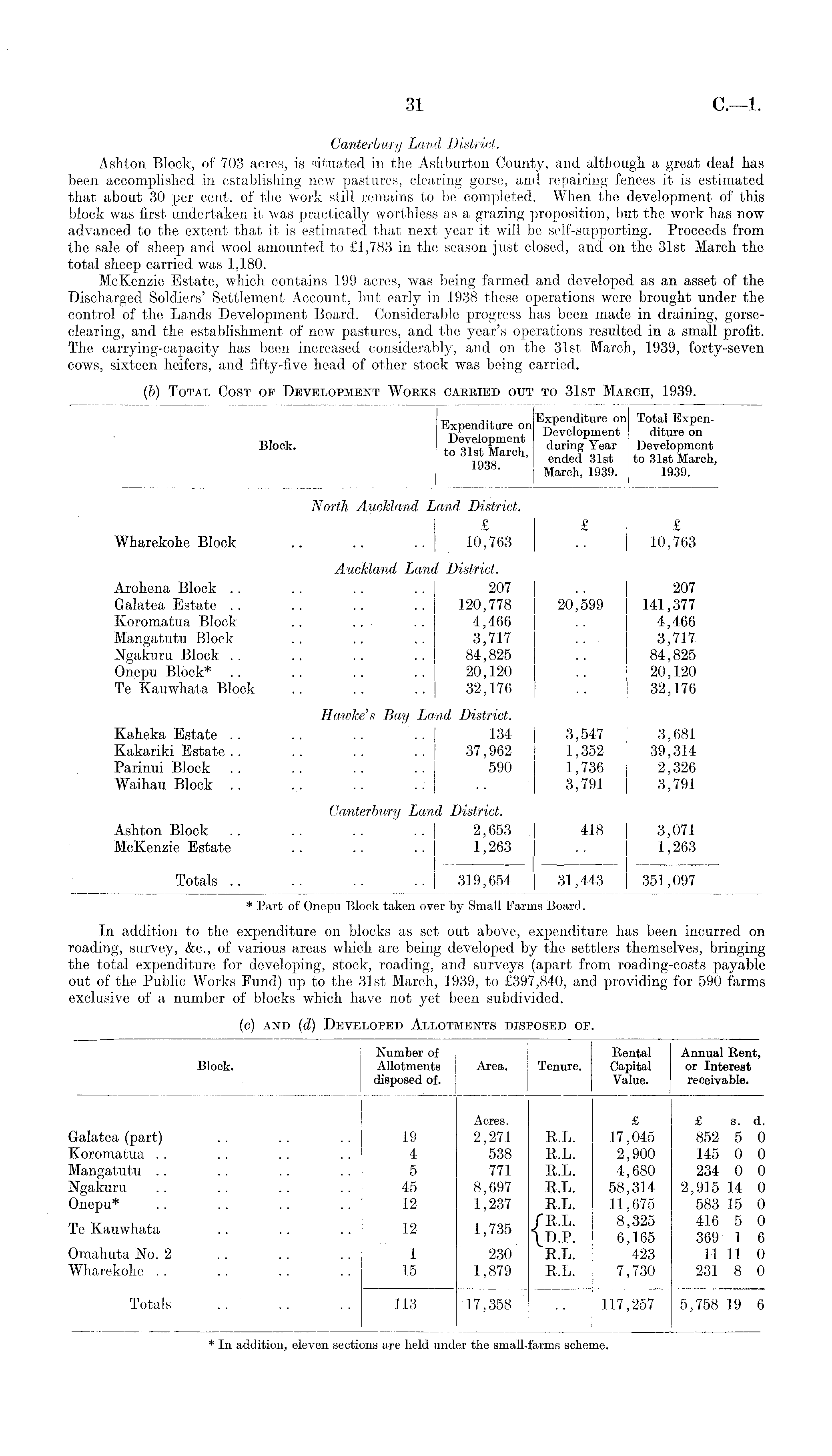 Canterbury Land District. Ashton Block, of 703 acres, is situated in the Ashburton County, and although a great deal has been accomplished in establishing new pastures, clearing gorse, and repairing fences it is estimated that about 30 per cent, of the work still remains to be completed. When the development of this block was first undertaken it was practically worthless as a grazing proposition, but the work has now advanced to the extent that it is estimated that next year it will be self-supporting. Proceeds from the sale of sheep and wool amounted to £1,783 in the season just closed, and on the 31st March the total sheep carried was 1,180. McKenzie Estate, which contains 199 acres, was being farmed and developed as an asset of the Discharged Soldiers' Settlement Account, but early in 1938 these operations were brought under the control of the Lands Development Board. Considerable progress has been made in draining, gorseclearing, and the establishment of new pastures, and the year's operations resulted in a small profit. The carrying-capacity has been increased considerably, and on the 31st March, 1939, forty-seven cows, sixteen heifers, and fifty-five head of other stock was being carried.